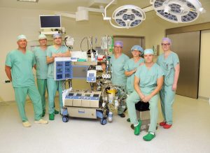 20.000 Operationen am offenen Herzen in der Universitätsmedizin Magdeburg30. Oktober 2018 Das Team der 20 000. Operation am offenen Herzen (v.l.): Olaf-Thorsten Keyser (Leiter Kardiotechnik), Klinikdirektor Prof. Dr. Jens Wippermann, Oberarzt Dr. Ingo Slottosch (Operateur), Schwester Ute Werner (stellvertretende Leitung OP-Pflege), Schwester Manuela Fischer (OP-Pflege), Thomas Koch (OP-Pflege) und Oberärztin Dr. Astrid Bergmann (Leiterin Kardioanästhesie). Foto: © Melitta Dybiona/Uniklinik Eine erfolgreiche Bilanz mit 20.000 Operationen am offenen Herzen kann die Universitätsklinik für Herz- und Thoraxchirurgie Magdeburg seit ihrer Eröffnung im September 1995 verzeichnen. Auch die 20.000ste Operation mit Einsatz der Herz-Lungen-Maschine bei einer 41-jährigen Patientin kürzlich verlief erfolgreich. In der Magdeburger Spezialklinik können erwachsene Patienten mit allen herzchirurgischen Operationen, außer Transplantationen, indikationsgerecht, zeitnah und in vertrauter Umgebung, sowohl für sich selbst als auch für ihre Angehörigen, behandelt werden. Angeboten wird das komplette Spektrum an innovativer und komplexer Herzchirurgie. Dazu gehören minimal-invasive Verfahren zur Herzklappenrekonstruktion, kathetergestützte Herzklappenoperationen, sowie komplett arterielle Bypass-Operationen mit und ohne Einsatz der Herz-Lungen-Maschine. Ein weiterer Schwerpunkt ist die moderne Aortenchirurgie inklusive endovaskulärer Techniken und die Implantation von Herzunterstützungssystemen. Auch ein Kunstherzprogramm für Patienten mit schwerer Herzinsuffizienz wurde etabliert. „Während sich die Herzchirurgie – wie auch andere klinische Fächer – früher auf Standardtherapien für unterschiedliche kardiale Erkrankungen beschränkte, werden Therapieoptionen heute zunehmend individuell auf den Patienten zugeschnitten“, betont Klinikdirektor Prof. Jens Wippermann. „Vor allem bei älteren Patienten mit mehreren weiteren Erkrankungen spielt die sorgfältige Planung der Operation eine ganz wichtige Rolle. Hierzu gehört eine möglichst genaue Bemessung des individuellen Risikos der verschiedenen Therapieoptionen.“ Inwieweit eine bestimmte Therapie angewendet werden kann, wird mit moderner Bildgebung, wie hochauflösendem CT und dreidimensionaler Echokardiographie, eingeschätzt. Zusammen mit den Ärzten der Uniklinik für Kardiologie unter der Leitung von Prof. Dr. Rüdiger Braun-Dullaeus wird das Konzept eines „Herzteams“ verfolgt. „Das bedeutet, dass die Entscheidung für ein bestimmtes Vorgehen stets gemeinsam in enger Absprache zwischen den Kardiologen, Echokardiographie-Spezialisten Anästhesisten und unseren Herzchirurgen getroffen wird“, berichtet Wippermann. „Eine enge Kooperation mit allen zuweisenden Kliniken in und um Magdeburg ermöglicht weiterhin eine umfassende Betreuung unserer Patienten von der Diagnosestellung bis zum Abschluss ihrer Rehabilitation.“