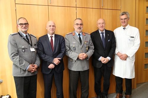 3. DGU-Notfallkonferenz2. Dezember 2019 Dekontamination, Behandlung von Patienten und Sicherung der Klinik regelmäßig üben: Demenstration einer Dekontamination eines mit Chemikalien kontaminierten Patienten im Dekontaminationscontainer der Werksfeuerwehr der BASF. (Foto: DGU/BG Klinik Ludwigshafen) Unfallchirurgen der zivilen Versorgung und Ärzte der Bundeswehr haben am vergangenen Freitag bei einem Pressegespräch die Sicherheitsanalyse von Krankenhäusern zum Schutz von Kliniken bei lebensbedrohlichen Einsatzlagen beleuchtet. Anlass war die 3. Notfallkonferenz der Deutschen Gesellschaft für Unfallchirurgie (DGU) mit dem Titel „Sind unsere Kliniken sicher?“ an der BG Klinik in Ludwigshafen. Militärmediziner zeigten vor den über 200 Teilnehmern auf, welche Maßnahmen auf die Sicherheitsanalyse folgen können, um den Schutz der Kliniken bei einem Anschlag (TerrorMANV) zu erhöhen. Die DGU fordert in diesem Zusammenhang eine Übernahme der hohen Kosten für Krankenhausnotfall-Übungen, denn diese könnten nicht von den Kliniken alleine getragen werden. Als kritische Infrastruktur könnten Kliniken durch ein terroristisches Attentat oder einen Amoklauf in den Fokus eines Anschlages rücken – wenn etwa Terroristen ganz bewusst eine Klinik angreifen. „Jedes Krankenhaus muss seine Schwachstellen kennen. Dann lassen sich Sicherheitslücken auch schon mit kleinen Maßnahmen schließen“, betonte DGU-Präsident Prof. Paul A. Grützner. „Die sicherheitspolitischen Entwicklungen der letzten Jahre haben zu einem gesteigerten Interesse des zivilen Gesundheitswesens an den spezifischen Fähigkeiten und Erfahrungen des Sanitätsdienstes der Bundeswehr geführt, sodass es inzwischen einen sehr intensiven und vertrauensvollen Austausch gibt“, sagte Generaloberstabsarzt Dr. Ulrich Baumgärtner, Inspekteur des Sanitätsdienstes der Bundeswehr. Bereits 2016 haben die DGU und der Sanitätsdienst der Bundeswehr einen 5-Punkte-Plan zur medizinischen Versorgung der Bevölkerung im Falle eines Terrorereignisses aufgelegt. Kernstück des Plans ist der Kurs „Terror and Disaster Surgical Care“ (TDSC®). Bis heute konnten bereits über 350 Ärzte aus zehn regionalen Traumanetzwerken der Initiative TraumaNetzwerk DGU® für den Ernstfall trainiert werden. Benedikt Friemert, Reinhard Nieper (Vorsitzender Geschäftsführer der BG Kliniken), Ulrich Baumgärtner, Dietmar Pennig und Paul Alfred Grützner (v.l.) bei der Pressekonferenz anlässlich der 3. Notfallkonferenz der DGU. (Foto: DGU/BG Klinik Ludwigshafen) Nun setzen beide Partner die Klinik-Sicherheit und die Bedrohung durch radiologische, chemische oder biologische Stoffe – „schmutzige Bomben“ – auf die Agenda: So wären Krankenhäuser frei zugängliche Institutionen, die jederzeit für jeden erreichbar sind. Sie hätten grundsätzlich keinen relevanten Schutz vor Angriffen von außen oder innen. „Krankenhäuser müssen Konzepte entwickeln, wie sie ihre eigene Sicherheit verbessern können“, sagte Oberstarzt Prof. Benedikt Friemert, Leiter der DGU-Arbeitsgemeinschaft Einsatz-, Katastrophen- und Taktische Chirurgie (AG EKTC). Dabei sei die Gefahren- und Sicherheitsanalyse von einem Krankenhaus der erste Schritt und ein wichtiger Teil der Sicherheitsmaßnahmen zum Schutz von Kliniken. Zu einer Gefahrenanalyse gehöre die Prüfung der regionalen Gefahrenpotenziale, wie sie beispielsweise aufgrund von Chemieanlagen oder besonderen politischen Institutionen bestehen können. Anhand der Sicherheitsanalyse können Sicherheitslücken geschlossen werden. Zu den ersten Schritten, wie Kliniken ihre Sicherheit erhöhen können, zählen laut Friemert: • Sicherheitsüberprüfung der Personen, die in die Klinik kommen • Sichtung/Triage inklusive Sicherheitsüberprüfung der Verletzten muss vor die Klinik verlagert werden • Krankenhaus abriegeln • Krankenhaus von innen überwachen • Zufahrt zum Krankenhaus abschirmen/mit baulichem Rammschutz erschweren Bei Verdacht auf die Verwendung schmutziger Bomben sollten Patienten und Klinikpersonal auf Verschmutzung mit schädlichen Substanzen geprüft werden, so die Experten. Ein wesentlicher Teil der Vorbereitung sei es, Behandlung, Dekontamination und Sicherung der Klinik zu üben. Ein TerrorMANV ist eine logistische und medizinische Ausnahmesituation. Daher gibt DGU-Generalsekretär Prof. Dietmar Pennig zu bedenken: „Die Bevölkerung erwartet, dass solche Szenarien vorweg bedacht werden und dass wir auch in Ausnahmesituationen absolut handlungsfähig sind. Daher muss der Ernstfall immer wieder eintrainiert werden, um professionelles Handeln zu ermöglichen.“ Eine Krankenhaus-Notfallübung koste bis zu 100.000 Euro. „Diese Kosten können nicht von den Krankenhäusern getragen werden“, sagte Pennig. Die DGU fordert daher schon seit Jahren die Bereitstellung eines staatlichen Budgets für Notfallübungen für die Kliniken. Für die Versorgung von Verletzten nach einem TerrorMANV seien Ausrüstungen erforderlich, die weit über die normale Ausstattung der Kliniken hinausgingen. Diese Materialien vorzuhalten verursache ebenfalls Kosten, erklärte Pennig. Auch sei ein großer Teil dieser Materialien Sterilgut und müsse regelmäßig ersetzt werden.Die hohen Kosten seien einer der Gründe, warum Notfallübungen in Deutschland bisher nicht zur Routine gehören, kritisierte Pennig.
