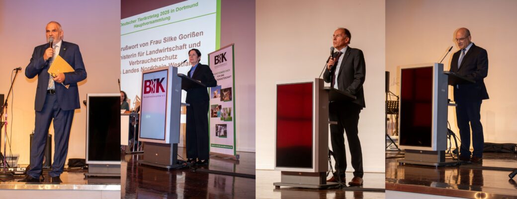30. Deutscher Tierärztetag in Dortmund: Beschlüsse mit Herz und Augenmaß13. Oktober 2025 (Symbolbild) Foto: © Talia Mdlungu/peopleimages.com – stock.adobe.com In einem von leidenschaftlichen Debatten dominierten 30. Deutschen Tierärztetag in Dortmund am 9. und 10 Oktober 2025 trugen mehr als 300 Veterinäre ihre Forderungen zur Erleichterung des Tierschutzvollzugs in allen tierärztlichen Bereichen zusammen. Beim 30. Deutschen Tierärztetag, der von BTK-Präsident Ltd. VD Dr. Holger Vogel am 9. Oktober eröffnet wurde, diskutierten die Tierärzte und Tierärztinnen in vier Arbeitskreisen zum Generalthema „Tierschutz im tierärztlichen Alltag“. Aus den konstruktiven Debatten gingen von der Hauptversammlung konkrete Forderungen an Gesellschaft, Politik, den Gesetzgeber und den eigenen Berufsstand hervor. Über die verabschiedeten Forderungen stimmten die Delegierten der beteiligten Organisationen ab – darunter die 17 Landes-/Tierärztekammern sowie BTK-Beobachter und weitere Organisationen. Die Ministerin für Landwirtschaft und Verbraucherschutz des Landes Nordrhein-Westfalen, Silke Gorißen, war vor Ort und wandte sich mit einem Grußwort an die Tierärzte und Tierärztinnen: „Mein Dank gilt allen Veterinärinnen und Veterinären für ihren unermüdlichen Einsatz für die Tiergesundheit und den Tierschutz, ob in der Praxis, den Behörden oder auch der Wissenschaft und Forschung. Ihre tagtägliche Expertise und Ihr Engagement für das Tierwohl sind beeindruckend.“ Weitere persönliche Grußworte überbrachten aus dem Bundesministerium für Landwirtschaft, Ernährung und Heimat (BMLEH) Staatssekretär Prof. Markus Schick und der Leiter der Abteilung 3 „Lebensmittelsicherheit, Tiergesundheit“, Prof. Eberhard Haunhorst. (v.l.n.r.): Holger Vogel bei seiner Festabendrede / Ministerin Silke Gorißen bei ihrem Grußwort in der Hauptversammlung / Eberhard Haunhorst bei seinem Grußwort bei der Eröffnung / Markus Schick bei seinem Grußwort beim Festabend. (Fotos: © BTK) Arbeitskreis 1 „Tierschutz im Pferdesport“ Die Beschlüsse zielen auf verbindlichere Anforderungen, stärkere tierärztliche Kontrollen und klare Verantwortlichkeiten, um das Tierwohl im Pferdesport nachhaltig zu verbessern. So soll die tierärztliche Rolle bei Veranstaltungen u. a. gestärkt werden, indem Verbände und Veranstalter die ständige Anwesenheit qualifizierter Tierärzte und Tierärztinnen sicherstellen. Außerdem sollen nicht medizinisch notwendige Behandlungen unterlassen werden (z. B. Sedation zur Ermöglichung der Nutzung des Pferdes oder prophylaktische multiple Gelenkinjektionen). Arbeitskreis 2 „Tierschutz in der Kleintierpraxis“ Ziel der Beschlüsse ist es, strukturelle Defizite zu beheben, die Handlungsfähigkeit von Tierärzten und Tierärztinnen zu sichern und das Tierwohl zu stärken. Hierzu tragen u. a. die Flexibilisierung des Arbeitszeitgesetzes für den Veterinärbereich sowie deutlich erweiterte Betreuungsangebote (Kinder, Pflege) oder eine flächendeckende Einführung eines amtstierärztlichen Notdienstes bei. Außerdem wird eine klare rechtliche Definition und Priorisierung von Defektzuchtmerkmalen gefordert und ein Verbot ihrer Darstellung in Werbung/Medien/Spielzeug/Mode sowie die Regulierung des Online-Tierhandels. Arbeitskreis 3 „Tierschutz im Amt“ Die geforderten Maßnahmen zur Stärkung der amtlichen Tierschutzarbeit betreffen v. a. bessere Arbeitsbedingungen, gezielte Fortbildung sowie rechtliche und administrative Reformen. Zur Stärkung des amtlichen Tierschutzvollzugs sollen Mitarbeitende in der Tierschutzüberwachung aktiv vor belastenden Arbeitsbedingungen geschützt werden – etwa durch Coachings, Supervisionen und Kurse zur Gewaltprävention. Für einen vollziehbaren Tierschutz auf Basis veterinärmedizinischen Sachverstands ist das Tierschutzgesetz zu novellieren und die zugehörigen Verwaltungsvorschriften zu aktualisieren. Außerdem wird ein Grundsatzverbot von Langstreckentiertransporten über 8 Stunden in Drittländer außerhalb Europas gefordert. Arbeitskreis 4 „Tierschutz in der Nutztierhaltung“ Das Ziel der Forderungen ist eine praxisnahe, tierwohlorientierte Nutztiermedizin und bessere Unterstützung der Tierhaltenden und Tierärzte und Tierärztinnen. Für mehr Therapieflexibilität bei „minor species“ sollen unter anderem bürokratische Hürden für die Zulassung und Umwidmung von Medikamenten im Therapienotstand gesenkt und eine Möglichkeit geschaffen werden, etablierte Wirkstoffe tiergerecht einzusetzen. Außerdem sollen Forschungsgelder für „minor species“ bereitgestellt und einheitliche Zuchtprogramme mit Fokus auf Gesundheitsmerkmale gefördert werden. Leidenschaftliche Debatten um komplexe Themen Die Tiermediziner machten sich die Aufgabe nicht leicht, um einige Punkte und Formulierungen wurde hart, aber immer fair, gerungen. Als aktuell sich verschärfendes Problem in der Pferdehaltung sahen die Veterinäre an, dass das Reitsportequipment, das auf dem Markt angeboten würde, zum Teil ungeeignet sei zur Anwendung am Tier und eine Art „TÜV“ sinnvoll wäre. Auch müsste auf Turnieren ständig ein Tierarzt anwesend und mit entsprechenden Befugnissen ausgestattet sein, um tierärztliche Standards umsetzen zu können. In der Arbeitsgruppe Kleintiere kamen sehr viele Themen zur Diskussion, so sei es unter anderem dringend notwendig, dass Hundetrainer bzw. deren Ausbilder von Tierärzten geschult und beraten werden sollten. Auch forderten die Kleintierpraktiker eine stärkere Einbindung in politische Referentenentwürfe, um ihre fachliche Expertise frühzeitig einbringen zu können. Im Arbeitskreis drei wurde darauf hingewiesen, dass vielerorts massive Personalknappheit herrsche und technische Gerätschaften erneuert beziehungsweise auf den neuesten Stand gebracht werden müssten. Ferner benötigten die Kollegen Fortbildungen, etwa zur Gewaltprävention, um den Eigenschutz gewährleisten zu können. Auch seien die Tierhei