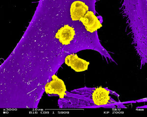 Aggressive Lungentumoren: Neuartige CAR-T-Zelltherapie als vielversprechende Option3. Juli 2023 Killer-T-Lymphozyt im Portrait (Abbildung: © MUI/Institut für Zellgenetik) Damit auch Patienten mit soliden Tumoren von neuen immuntherapeutischen Medikamenten wie der CAR-T-Zelltherapie profitieren, setzen Forschende in einem österreichischen Projekt auf die Blockade von Checkpoint-Proteinen in CAR-T-Zellen. Vor zehn Jahren wurden die ersten Leukämiepatienten mit chimären Antigenrezeptor (CAR) exprimierenden T-Zellen behandelt. Heute sind viele der Betroffenen noch immer ohne Krankheitssymptome. Die mit einem Tumorerkennungsrezeptor ausgestatteten CAR-T-Zellen sind in der Lage, Tumorzellen gezielt zu erkennen, an diese anzudocken und sie zu zerstören. Bei schwer behandelbaren soliden Krebserkrankungen wie dem Nichtkleinzelligen Lungenkarzinom (NSCLC) blieb jegliche Wirksamkeit von CAR-T-Zellen bislang jedoch aus. Im Fokus: Immun-Checkpoint Molekül CBLB Univ.-Prof. Gottfried Baier, Direktor des Institutes für Zellgenetik an der Medizin Uni Innsbruck (Österreich), ist den Ursachen der Therapieresistenz von CAR-T bei NSCLC auf der Spur. Mit seinem Team konnte er bereits mehrfach belegen, dass das intrazelluläre Protein CBLB* eine Schlüsselrolle in der Hemmung der antitumoralen Funktion von Immunzellen einnimmt: „Krebszellen wenden verschiedene Tricks an, um dem Immunsystem zu entkommen und das Protein CBLB* fungiert dabei als eine Art Checkpoint in der Anti-Tumor-Immunantwort. Der Tumor missbraucht sozusagen die Immunzelle und macht aus einer tumorbekämpfenden Zelle eine inaktive und für den Tumor völlig harmlose Zelle.“ Neueste Erkenntnisse von zugrundeliegenden Mechanismen, die in enger Zusammenarbeit mit Postdoc Sebastian Peer und dem Immun-Onkologen Univ.-Prof. Dominik Wolf (Direktor der Innsbrucker Univ.-Klinik für Onkologie und Hämatologie), im Rahmen der zwei laufenden ERC-Projekte HOPE und CAR-T(uning) von Baier erarbeitet wurden, zeigen, dass Immun-Checkpoints in der Krebsimmuntherapie mit CAR-T-Zelltherapien bei bestimmten Tumoren eine wichtige Rolle spielen. Mit der Blockade von Immun-Checkpoint Molekülen in CAR-T-Zellen könnte sich nun eine vielversprechende Therapieoption eröffnen, die tumorzellschädigende Funktion der schon heute verfügbaren CAR-T Zellen am Ort des soliden Tumors entscheidend zu verbessern. Solcherart hergestellte Zellen könnten ein potenziell effektives „lebendes Medikament“ zur Abtötung von Tumorzellen auch in der immunsuppressiven Tumorumgebung darstellen. Genau diesen Weg wollen Baier und das Wiener Biotech-Unternehmen invIOs in einem neuen, von der Österreichischen Forschungsförderungsgesellschaft (FFG) geförderten BRIDGE**-Projekt EXCEL-T (Extension of CD8 CAR-T cell therapy success by CBLB pathway blockade) beschreiten. „Wir wollen die Wirksamkeit von CAR-T Immunzelltherapie speziell bei soliden Tumoren wie NSCLC wesentlich und bestmöglich verstärken, und gleichzeitig mittels des patienteneigenen Immunsystems die Anti-Tumorimmunität ankurbeln und bisher beobachtete Therapieresistenzen langfristig vermeiden“, beschreibt Baier das gemeinsame Projektziel. Killer-T-Lymphozyten (kleine Zellen) erkennen und zerstören eine Tumorzelle (groß). (Abbildung: © MUI/Institut für Zellgenetik) Alexander Dohnal, Leiter der Forschungs- und Entwicklungsabteilung von invIOs, ergänzt: „Erste Ergebnisse unserer klinischen Untersuchungen weisen darauf hin, dass die Blockade von CBLB wesentlich zu einer gezielteren Behandlung von aggressiven Lungentumoren beitragen könnte. Langfristig planen wir klinische Studien, die untersuchen sollen, ob unser maßgeschneidertes Konzept dieser neuartigen CAR-T-Zell Therapie das immunsuppressive Tumormikromilieu überwinden und die Erfolgsrate der Behandlung bei LungenkrebspatientInnen im Spätstadium verbessern kann. Sollte sich unser Konzept in präklinischen Modellen bestätigen, ließe sich diese Technologie auf andere, schwer behandelbare Tumore expandieren. Dies wäre ein Durchbruch für zelltherapeutische Behandlungen von Patienten mit soliden Tumoren.“ * Casitas B cell-lymphom-b (CBLB), eine E3-Ubiquitin-Ligase, ist ein wichtiger intrazellulärer Immun-Checkpoint, der die Aktivität von Immunzellen sowohl kontrolliert als auch begrenzt. CBLB ist damit ein integraler Bestandteil wichtiger natürlicher Mechanismen zur Steuerung des Immunsystems. In Tiermodellen kann eine starke durch T- und NK-Zellen verursachte Antitumor-Immunität nachgewiesen werden. Die Blockade von CBLB aktiviert nicht nur gezielt Immunzellen, sondern bietet auch die Möglichkeit, andere relevante Kontrollpunkte wie CTLA-4 und PD-L1/PD-auszuschalten und kann somit als „Master-Checkpoint” in der Krebsimmuntherapie angesehen werden. CBLB kann auf dieser Grundlage als Basis für vielversprechende Ansätze in der Krebsimmuntherapie dienen. ** Das „Brückenschlagprogramm” BRIDGE der FFG wurde im Jahr 2004 als gemeinsame Initiative von FFG und dem Wissenschaftsfonds FWF zur Förderung von Projekten an der Schnittstelle zwischen wissenschaftlicher Grundlagenforschung an Instituten und experimenteller Entwicklung in den Unternehmen etabliert.