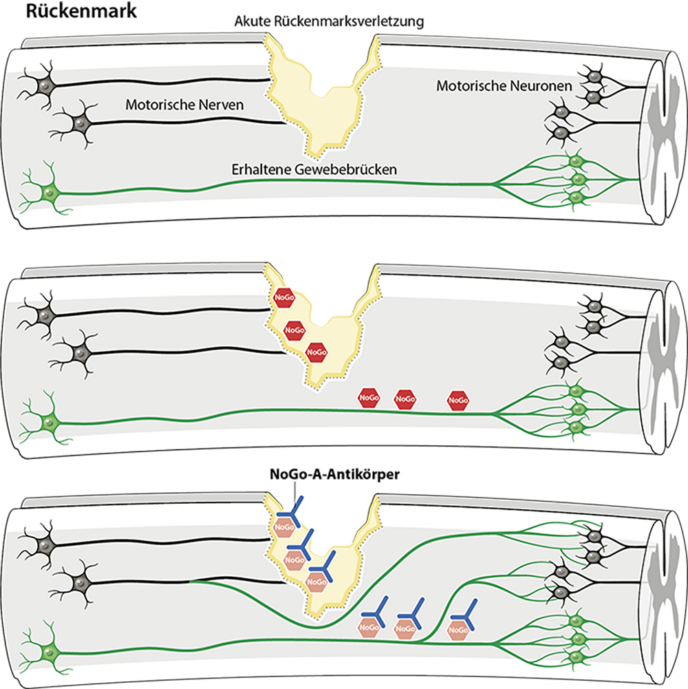 Akute Querschnittlähmung: Antikörper-Therapie kann Nervenregeneration bei bestimmten Patienten verbessern6. Januar 2025 Können Muskeln besser angesteuert werden, verbessert sich auch die Selbständigkeit der Patienten bei Alltagsaktivitäten wie hier dem Halten eines Smartphones. (Quelle: © Universitätsklinikum Heidelberg) Antikörper können die Rehabilitation von Menschen mit akuter traumatischer Quer-schnittlähmung verbessern. Das berichten Forschende aus Deutschland, der Schweiz, Tschechien und Spanien. Sie konnten auch gut abgrenzbare Patientengruppen identifizieren, die einen klinisch relevanten Behandlungseffekt zeigten. Eine Folgestudie ist bereits im Dezember 2024 gestartet. Die multizentrische klinische Studie (NISCI trial: Nogo-A Inhibition in acute Spinal Cord Injury Study) untersuchte den Antikörper NG 101 (Anti-Nogo-A), der das körpereigene Protein Nogo-A blockiert und damit neutralisiert. Dieses Protein hemmt beziehungsweise verhindert bei einer akuten Verletzung die Regeneration von geschädigten Nervenfasern im Rückenmark, wie in mehreren internationalen Studien im Tiermodell gezeigt werden konnte. Eine Behandlung mit Antikörpern soll diese hemmenden Mechanismen im Körper bremsen und so eine Erholung des Rückenmarks ermöglichen. An der randomisierten, doppelblinden und placebokontrollierten Studie nahmen insgesamt 126 Personen im Alter von 18 bis 70 Jahren teil, die an einer akuten kompletten bis inkompletten Querschnittlähmung durch eine Rückenmarksverletzung im Halsbereich litten. 78 Personen wurden mit dem Antikörper behandelt, der direkt in den Spinalkanal injiziert wurde; die übrigen 48 Personen erhielten ein Placebo, das auf die gleiche Weise verabreicht wurde. Ein vollständiger Behandlungszyklus bestand aus sechs Injektionen parallel zur normalen stationären Behandlung. Signifikante Verbesserungen bei inkompletter Querschnittlähmung Eine standardisierte Untersuchung an Hand-Arm-Muskeln zeigte, ob sich motorische Funktionen bei den Patienten erholen. Diese Muskelgruppen sind für Patienten mit Tetraplegie (hohe Querschnittlähmung, die zusätzlich auch die Arm- und Handfunktionen betrifft) von größter Bedeutung im Alltag. Nach sechs Monaten wurde die Wirkung zwischen den mit Antikörpern behandelten und den unbehandelten (Placebo-)Patienten verglichen. Bei Patienten mit einer kompletten Querschnittlähmung zeigten sich keine Verbesserungen der motorischen Funktion. In der Patientengruppe mit inkompletter Querschnittlähmung führte die Behandlung mit Antikörpern zu signifikanten Verbesserungen sowohl in der willkürlichen Ansteuerung der gelähmten Muskeln als auch in der Selbstständigkeit der Patienten im Alltag. Darüber hinaus zeigte sich, dass der Antikörper allgemein gut verträglich ist und bisher keine damit verbundenen Nebenwirkungen aufgetreten sind. Damit zeigt die langjährige, unter Federführung der Universitätsklink Balgrist in Zürich, Schweiz, betriebene Forschung zu Antikörpern in der Rehabilitation ermutigende Erfolge. Nervenverbindungen wachsen in Rückenmarksgewebe nach. (Quelle: © Universitätsklinik Balgrist) Weitere Studien müssen nun diese erstmals erreichten positiven klinischen Befunde bei Patienten mit akuter inkompletter Querschnittlähmung bestätigen. Eine Folgestudie mit einem weiterentwickelten Antikörper wurde bereits im Dezember 2024 gestartet. Hierfür wurden Patientenuntergruppen ausgewählt, bei denen aufgrund der bisherigen Ergebnisse das Potenzial für eine signifikante klinische Verbesserung besteht. Europäische Zusammenarbeit Initiiert und organisiert wurde die multinationale Studie von Prof. Martin Schwab, Universität Zürich) und Prof. Armin Curt, Züricher Universitätsklinik Balgrist, in enger Zusammenarbeit mit Prof. Norbert Weidner vom Universitätsklinikum Heidelberg. Ermöglicht und durchgeführt wurde sie in einem europäischen klinischen Netzwerk (www.emsci.org), dem zahlreiche spezialisierte Zentren zur Behandlung von Patienten mit Querschnittlähmung in Deutschland, der Schweiz, in Spanien und Tschechien angehören. Auch die Follow-Up-Studie wird in diesem Netzwerk stattfinden. Die Herstellung des Prüfantikörpers wurde im Rahmen des CeNeReg-Projektes durch die Zusammenarbeit mit der Regenerative Medicine Technologie Plattform des Wyss Zurich Translational Centers ermöglicht. Das EU-Förderprogramm Horizon 2020, das Schweizer Staatssekretariat für Bildung, Forschung und Innovation SBFI, die Schweizer Paraplegiker-Stiftung, die private Forschungsstiftung Wings for Life, das Projekt CeNeReg des Wyss-Zentrums (der Universität Zürich und der ETH Zürich) sowie die Stiftung International Research in Paraplegia finanzierten die NISCI-Studie.