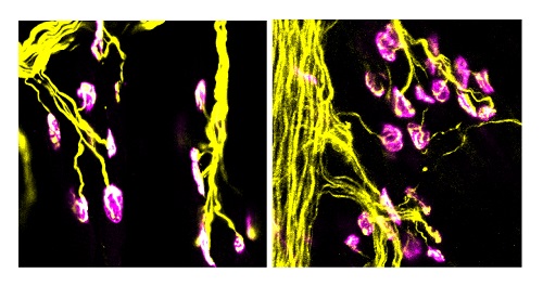 ALS und SMA: Warum Muskeln schwächer werden und schwinden1. Juli 2024 Die Neurobiologin Dr. Mehri Moradi vom Universitätsklinikum Würzburg (UKW) erhält eine DFG-Förderung in Höhe von 420.000 Euro für den Aufbau einer Forschungsgruppe zur Pathogenese der Amyotrophen Lateralsklerose (ALS). (Quelle: Kirstin Linkamp | UKW) Die Neurobiologin Dr. Mehri Moradi vom Universitätsklinikum Würzburg erhält eine DFG-Förderung in Höhe von 420.000 Euro, um die Synapsendegeneration bei der Amyotrophen Lateralsklerose (ALS) zu untersuchen und einen Therapieansatz zu finden. Für ihre Forschung zu einem möglichen Pathomechanismus bei ALS und den Aufbau einer eigenen Arbeitsgruppe hat die Neurobiologin Dr. Mehri Moradi von der Deutschen Forschungsgemeinschaft (DFG) eine Förderung in Höhe von insgesamt 420.000 Euro erhalten. Im Fokus steht eine Mutation im Gen C9orf72, bei der es zu übermäßigen Wiederholungen von DNA-Bausteinen kommt, welche Proteine verändern und toxische Effekte auf Nervenzellen haben. SMA: Durch Gendefekt stirbt zuerst die neuromuskuläre Synapse ab Grundlage für ihre Forschungsarbeiten sind frühere Untersuchungen zu den Pathomechanismen der Spinalen Muskelatrophie (SMA). Die Erkrankung wird durch Mutationen im SMN1-Gen (Survival Motor Neuron 1) verursacht. Dieses Gen ist für die Produktion des SMN-Proteins verantwortlich, das für das Überleben und die Funktion von Motoneuronen notwendig ist. Ein Defekt im SMN1-Gen führt zu einem Mangel an SMN-Protein und damit zum Absterben der Motoneuronen. „Wir haben herausgefunden, dass vor den Motoneuronen die neuromuskuläre Synapse abstirbt, die Verbindung zwischen Motoneuron und Muskelzelle, die die Übertragung von Nervenimpulsen ermöglicht, welche die Muskelkontraktion auslösen. Die Krankheit beginnt also bei den Nervenbahnen“, erklärt Moradi. Rechts ist die Synapse zwischen Motoneuron und Zielmuskel in Mäusen mit Spinaler Muskelatrophie (SMA), links im Wildtyp. Die Nervenbahnen mit präsynaptischem Kompartiment sind gelb, das postsynaptische Kompartiment an der Muskelfaser ist magenta. (Quelle: Mehri Moradi | UKW) Bisherige Therapieansätze basieren auf der Wiederherstellung des SMN-Proteins. „Aber diese Behandlungen wirken nicht hundertprozentig, man braucht eine zusätzliche Therapie für die Synapse“, erläutert die Wissenschaftlerin. Sie hat auch schon ein Ziel: „Wir haben im Mausmodell bereits gezeigt, dass wir die Synapse retten können, wenn wir bestimmte Proteine wiederherstellen, die bei der synaptischen Übertragung eine Schlüsselrolle spielen, zum Beispiel das Protein Munc13-1.“ Führt die Synapsendegeneration auch bei ALS zum Verlust von Motoneuronen? Bei der ALS, die zu zunehmender Muskelschwäche und Muskelschwund (Atrophie) führt, ist die Situation ähnlich, aber viel komplexer. Im Gegensatz zur SMA, die durch einen einzigen Gendefekt verursacht wird, sind die Ursachen der ALS noch weitgehend unklar. Bislang wurden 40 Gendefekte identifiziert, die mit ALS in Verbindung gebracht werden. 80 bis 90 Prozent der Fälle treten jedoch sporadisch auf, und es ist möglich, dass eine Kombination aus genetischen und Umweltfaktoren zur Entstehung der Krankheit beiträgt. „Es gibt vier aggressive Gene, von denen das Gen C9orf72 die häufigste Ursache für ALS in Europa ist“, erklärt Moradi. Im Hinblick auf weitere mögliche Angriffspunkte für therapeutische Interventionen will Moradi die Pathogenese der ALS noch besser verstehen, insbesondere wie es zur Degeneration der Synapse kommt. Könnte der Funktionsverlust des C9orf72-Proteins ein möglicher Verursacher der Synapsendegeneration sein? Was passiert, wenn man die Funktion dieses Proteins umgeht oder andere Proteinpartner gentherapeutisch überexprimiert? Antworten sucht sie in Mausmodellen, vor allem aber in menschlichen Stammzellen von ALS Patienten. Doktorand oder Doktorandin mit Interesse an Synapsenforschung gesucht Die Neurobiologin freut sich darauf, mit Unterstützung der DFG eine eigene Arbeitsgruppe zu leiten. Aufgrund der bevorstehenden Emeritierung von Prof. Michael Sendtner wird Moradi Anfang nächsten Jahres an den Lehrstuhl für Biotechnologie und Biophysik von Prof. Markus Sauer wechseln, wo sie auch von der dortigen Expertise und Infrastruktur in der Superresolution-Mikroskopie profitieren kann. Jetzt fehlt ihr nur noch ein Doktorand oder eine Doktorandin mit Interesse an der Synapsenforschung. Bewerbungen sind herzlich willkommen.