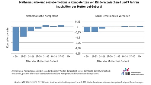 Alter der Mutter beeinflusst kognitive und sozial-emotionale Entwicklung von Kindern27. Juni 2024 Foto: © Michelle Raponi – Pixabay In den vergangenen drei Jahrzehnten ist das Alter von Frauen bei der Geburt ihres ersten Kindes kontinuierlich angestiegen. Welche Konsequenzen dieser Trend für die Kinder hat, hat eine Studie des Bundesinstituts für Bevölkerungsforschung (BiB) und der Universität Oldenburg auf Basis des Nationalen Bildungspanels (NEPS) untersucht – und interessante Ergebnisse ans Licht gebracht. Lag das Alter von Frauen bei der Geburt ihres ersten Kindes im Jahr 1990 in Deutschland durchschnittlich noch bei 24,5 Jahren, stieg es bis 2022 auf 30,8 Jahre an. Dies beeinflusst die kognitive Entwicklung sowie das Sozialverhalten der Kinder positiv, wie die Studie zeigt. Besonders deutliche Unterschiede zeigen sich demnach bei den mathematischen Kompetenzen: Kinder von Müttern, die bei der Geburt jünger als 30 Jahre alt waren, haben mehrheitlich unterdurchschnittliche Testergebnisse in Mathematik. Dagegen weisen Kinder von Müttern, die bei der Geburt 30 Jahre und älter waren, durchschnittliche oder leicht höhere Kompetenzen auf. Ein ähnliches Muster ergibt sich auch für das sozial-emotionale Verhalten der Kinder, wenngleich die Unterschiede hier schwächer ausgeprägt sind. „Die Befunde zeigen, dass sich Kinder deutlich besser entwickeln, wenn ihre Mutter bei der Geburt kein Twen oder gar Teenager ist“, erklärt Dr. Mathias Huebener vom BiB und Mitautor der Studie. Kinder von älteren Müttern sind besser in Mathe und sozial kompetenter. (Quelle: Bundesinstitut für Bevölkerungsforschung) Enger Zusammenhang zwischen kindlicher Entwicklung und familialen Ressourcen „Die Entwicklung von Kindern hängt wesentlich von der Lernumwelt ab, die sie in den ersten Lebensjahren im Elternhaus erfahren“, führt Mitautorin Susanne Schmid von der Universität Oldenburg aus. Ein Kind frühzeitig und bestmöglich zu fördern, sei eng mit den finanziellen und zeitlichen Möglichkeiten der Eltern verbunden. In diesem Kontext hat die Studie drei Erklärungsansätze untersucht, die hinter dem Zusammenhang zwischen dem Alter der Mutter und den Kompetenzniveaus der Kinder stehen könnten: Eine frühe Mutterschaft geht oft mit niedrigeren elterlichen Bildungsabschlüssen und einem geringeren Einkommen einher. Bekommen Frauen ihr erstes Kind hingegen in einer späteren Lebensphase, können sie davor höhere Bildungsabschlüsse erzielen und mehr Berufserfahrung sammeln. Dies begünstigt eine förderliche Lernumwelt des Kindes. Familiale Ressourcen wie das Haushaltseinkommen, das Bildungsniveau oder auch der Partnerschaftsstatus der Mutter sind wichtige Voraussetzungen für die Entwicklung von Kindern. Des Weiteren berücksichtigt die Untersuchung das mütterliche Erziehungsverhalten, das beispielsweise gemeinsame Eltern-Kind-Aktivitäten umfasst oder wie sensibel die Mutter auf das Kind eingeht. Auch das mütterliche Wohlbefinden sowie das Gesundheitsverhalten während der Schwangerschaft spielen eine Rolle, da ein höheres allgemeines Wohlbefinden der Mutter die Entwicklung des Kindes begünstigen kann. Bessere Unterstützung für junge Mütter hilfreich Trotz des positiven Zusammenhangs mit der kindlichen Entwicklung befürwortet die Studie keinesfalls das Aufschieben der Mutterschaft. So ist aus medizinischer Perspektive bekannt, dass Schwangerschaften nach dem 36. Lebensjahr häufiger mit gesundheitlichen Risiken für Mutter und Kind einhergehen. Vielmehr zeigen die Ergebnisse der Studie die Notwendigkeit, die Rahmenbedingungen für junge Frauen nachhaltig zu verbessern: „Eine ressourcenorientierte Unterstützung von jungen Müttern ist hilfreich, um Nachteile in der Entwicklung von Kindern zu vermeiden“, erklärt Prof. Gundula Zoch von der Universität Oldenburg, die ebenfalls an der Studie mitgewirkt hat. „Dazu gehören beispielsweise verlässliche und öffentlich finanzierte Kinderbetreuungsangebote, die eine angemessene Förderung der Kinder sicherstellen. Das kann jüngeren Müttern ermöglichen, eine Ausbildung oder ein Studium erfolgreich abzuschließen, und einen guten Jobeinstieg garantieren.“