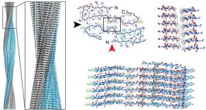 Alzheimer-Auslöser enttarnt25. November 2019 Seitenansicht einer rechts-händigen Aß-Amyloid Fibrille, rekonstruiert aus Fibrillen der Morphologie I (l.). Der Querschnitt einer Fibrill-Ebene zeigt zwei C-förmige Aß-Peptide, die Rücken an Rücken positioniert sind (r.). Die gesamte Fibrille besteht aus mehreren gestapelten Ebenen (r.) (©Kollmer et al., Nature Communications) Wissenschaftlern der Universität Ulm ist es erstmals gelungen, Beta-Amyloid-Fibrillen aus dem menschlichen Gehirn zu isolieren und zu untersuchen. Diese Eiweißfasern stehen im Verdacht, die Alzheimer-Krankheit sowie die Zerebrale Amyloid-Angiopathie mit auszulösen. Dass Morbus Alzheimer mit Proteinablagerungen im Gehirn einhergeht, ist seit vielen Jahren bekannt. Unter Alzheimer-Forschern gelten dabei zwei Proteine, Tau und Beta-Amyloid, als besonders krankheitsverursachend. Diese Eiweiße bilden lange Molekülketten, die sich als Faserklumpen im Gehirn ansammeln. Die genaue Ursache, warum sich körpereigene Proteine krankhaft entwickeln und zu degenerativen Veränderungen des Gehirns führen, ist noch nicht bekannt.Wissenschaftlerinnen und Wissenschaftlern der Universität Ulm ist es jedoch erstmals gelungen, Beta-Amyloid-Fibrillen aus Gewebeproben erkrankter Menschen zu extrahieren und präzise darzustellen. Die Überraschung dabei: Die Fasern unterscheiden sich sehr deutlich von den bisher zur Forschung genutzten, synthetisch erzeugten Fibrillen. Kryo-elektronenmikroskopische Aufnahme von Aß-Amyloid-Fibrillen, welche aus menschlichem Hirngewebe von Alzheimer-Patienten aufgereinigt wurden. Hervorgehoben sind einzelne Fibrillen mit unterschiedlichen Formen (Morphologie I und II). Zu sehen ist außerdem eine Fibrille, welche in unterschiedlichen Bereichen verschiedene Morphologien aufweist (roter Asterisk). (©Kollmer et al., Nature Communications) „Unsere Hauptergebnisse sind, dass wir die Struktur von Beta-Amyloid sichtbar machen konnten, und dass sie sich fundamental von bisherigen Annahmen unterscheidet“, erklärt Prof. Marcus Fändrich, Leiter des Instituts für Proteinbiochemie der Universität Ulm. Zum einen sind die einzelnen Peptide, aus denen sich die Fibrillen zusammensetzen, anders gestaltet als die Exemplare aus dem Reagenzglas, zum anderen sind die nun untersuchten Fibrillen in sich völlig anders verdrillt als die synthetischen Exemplare. „Das ist eine grundsätzlich andere Eigenschaft, die wir so nicht erwartet hatten“, sagt Fändrich.Für ihre Studie untersuchten die Wissenschaftlerinnen und Wissenschaftler Gewebeproben von drei Patienten, in denen sie die gleichen Strukturen fanden. Der Entschlüsselung der Ursachen von Morbus Alzheimer sind die Ulmer Forscherinnen und Forscher damit womöglich einen Schritt näher gekommen. Eine der krankheitsverursachenden Strukturen, die Beta-Amyloid im Gehirn annehmen kann, sei nun viel genauer bekannt. „Die Wissenschaft wird jetzt im Reagenzglas Bedingungen finden müssen, die diese Strukturen hervorrufen“, erklärt Fändrich. Auf Basis dieser Beta-Amyloid-Strukturen könnten weitergehende Untersuchungen folgen. Außerdem müsse sich erweisen, ob die Informationen über die Beta-Amyloid-Struktur für die Entwicklung von pharmazeutischen Wirkstoffen genutzt werden könnten. Originalpublikation:Kollmer M et al.: Cryo-EM structure and polymorphism of Aβ amyloid fibrils purified from Alzheimer’s brain tissue. Nat Comm 2019;10:4760.