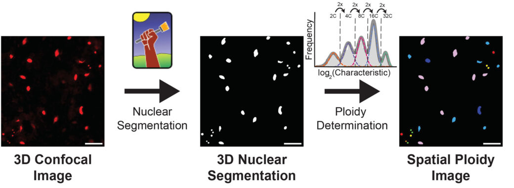 Polyploidie: Neues Tool ermöglicht Analyse in lebenden Geweben29. Dezember 2025 Symbolbild: piyaset/stock.adobe.com Eine neue rechnergestützte Pipeline ermöglicht eine hochdurchsatzfähige Bestimmung der Ploidie in verschiedenen Geweben. Anhand von Mikroskopbildern können polyploide Zellen so in intaktem Gewebe identifiziert werden. Endopolyploidie ist in der Natur weit verbreitet und kommt in pflanzlichen, tierischen und menschlichen Geweben vor. Sie beschreibt einen besonderen Prozess, bei dem Zellen ihr gesamtes Genom vervielfältigen, ohne sich anschließend zu teilen. Stattdessen behalten diese spezialisierten Zellen die zusätzliche DNA und verbleiben als einzelne, vergrößerte Zellen. Diese natürliche Strategie ist für die Entwicklung oder Regeneration von Geweben unerlässlich. Sie wird jedoch auch mit Krankheiten wie Krebs in Verbindung gebracht. Trotz ihrer großen Bedeutung ist noch immer unklar, was diesen Prozess auslöst, welche Zellen ihn durchlaufen und wie sein Auftreten im Gewebe räumlich reguliert wird. Denn eine solche Untersuchung war bislang äußerst schwierig: Entweder kamen Methoden zum Einsatz, die die Gewebearchitektur zerstören, oder es war eine aufwendige manuelle Analyse jedes einzelnen Zellkerns erforderlich. Automatisierte Visualisierung von polyploiden Zellen Mit der neuen Pipeline iSPy (Inferring Spatial Ploidy) ist es einem multidisziplinären, internationalen Team des Max-Planck-Instituts für Pflanzenzüchtungsforschung in Köln, dem Fox-Labor der Duke University und dem Roeder-Labor der Cornell University (beide USA) gelungen, diese langjährige Einschränkung zu überwinden. Die Pipeline ermöglicht es Forschenden, polyploide Zellen direkt in intaktem, lebendem Gewebe zu visualisieren und zu untersuchen. iSPy ist eine automatisierte Pipeline mit hohem Durchsatz, die experimentelle Methoden mit fortschrittlicher Bildsoftwareanalyse kombiniert. Ausgehend von Mikroskopbildern identifiziert eine Segmentierungssoftware die Zellkerne und berechnet bestimmte Kernmerkmale wie das Kernvolumen. Aufbauend auf diesen segmentierten Bildern erkennt iSPy die polyploiden Zellkerne im gesamten Gewebe und erstellt detaillierte Karten ihrer räumlichen Anordnung. Die iSPy-Pipeline zur Quantifizierung der Kernploidie auf einen Blick. Bildquelle: ©Nicholas Russell Die Forschenden demonstrieren den Einsatz von iSPy in verschiedenen Situationen: bei der entwicklungsbedingten programmierten Endopolyploidie in der Blattentwicklung von Arabidopsis, in menschlichen Kardiomyozyten und bei der regenerationsinduzierten Polyploidie in der Fruchtfliege. Pipeline in unterschiedlichen Organismen einsetzbar Somit ist iSPy ein leistungsstarkes und benutzerfreundliches Werkzeug zur Identifizierung und Analyse polyploider Zellen in verschiedenen Geweben unterschiedlicher Organismen. Erstmals können Forschende diese spezifischen Zellen nun über die Zeit hinweg eindeutig identifizieren, verfolgen und ihre Verteilung innerhalb der jeweiligen Gewebearchitektur effizient und im Hochdurchsatz analysieren. Erstautor Nicholas Russell kommentiert: „Die Identifizierung polyploider Zellen ohne die Zerstörung von Gewebe ist seit langem ein Wunsch der Fachwelt, und ich hoffe, dass diese Pipeline im Laufe der Jahre genutzt und angepasst werden kann, um bisher unbekannte räumliche und zeitliche Ploidie-Muster in vielen Organismen zu identifizieren.“ Studienleiter Pau Formosa-Jordan fügt hinzu: „Viele differenzierte Gewebe weisen räumliche Ploidie-Muster in verschiedenen Organismen auf, über die wir nur sehr wenig wissen. Unsere Pipeline wird hoffentlich dazu beitragen, zu verstehen, wie sich lebendes Gewebe entwickelt, altert oder nach Verletzungen repariert wird. Dies könnte neue Wege zum Verständnis bestimmter Krankheiten wie Krebs eröffnen.“ Die Arbeit ist das Ergebnis einer Zusammenarbeit des „Polyploidy Integration and Innovation Institute“, einer neuen, von der National Science Foundation (NSF) finanzierten Initiative, die sich zum Ziel gesetzt hat, die Entstehung, Funktion und Folgen von Polyploidie in verschiedenen Organismen zu erforschen. Veröffentlicht wurden die Ergebnisse in der Fachzeitschrift “Cell Reports Methods”. Das könnte Sie auch interessieren: Neue Methode zur gleichzeitigen Visualisierung von DNA und RNA Neues Foundation-Modell zeigt Organisation von Zellen im Gewebe