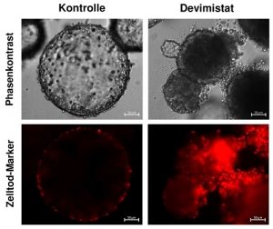 Angriff auf Mitochondrien: Vielversprechender Ansatz zur Verbesserung der Darmkrebstherapie entdeckt21. Dezember 2021 Jörg Fahrer (links) mit Philipp Demuth (rechts) am konfokalen Laser-Scanning-Mikroskop im Labor des Fachbereichs Chemie der TU Kaiserslautern. (Foto: © Thomas Koziel/TU Kaiserslautern) Einem Forschungsteam der Technischen Universität (TU) Kaiserslautern um den Toxikologen Prof. Jörg Fahrer ist es gelungen, mit der Substanz Devimistat einen Wirkstoffkandidaten zu identifizieren, der die Darmkrebstherapie verbessern kann. Das Team hat im Rahmen eines von der Wilhelm Sander-Stiftung geförderten Forschungsprojektes gezeigt, dass Devimistat vor allem in Darmkrebszellen seine toxische Wirkung entfaltet, indem es die Mitochondrien angreift. Dadurch wird die Empfindlichkeit der Krebszellen gegenüber Zytostatika erhöht und das Ansprechen auf die Tumortherapie verbessert. Darmkrebs ist eine der häufigsten Krebserkrankungen weltweit, an der immer mehr junge Menschen erkranken. Trotz des Fortschrittes in der Chirurgie und der Entwicklung zielgerichteter biologischer Krebsmedikamente ist diese bösartige Erkrankung für rund zehn Prozent aller krebsbedingten Todesfälle in den westlichen Industrienationen verantwortlich. „Diese Zahl verdeutlicht, dass neue Therapieansätze und Wirkstoffe bei der Behandlung von Darmkrebs benötigt werden“, sagt Fahrer, der mit seiner Arbeitsgruppe im Fachbereich Chemie an der TU Kaiserslautern forscht. Hemmung zweier wichtiger Stoffwechselenzyme im Citratzyklus Das Team um Fahrer setzte für die Untersuchungen den Wirkstoff Devimistat ein. „Dieser leitet sich von der natürlich vorkommenden Verbindung α-Liponsäure ab und hemmt zwei wichtige Stoffwechselenzyme im sogenannten Citratzyklus“, so Fahrer. Hierbei handelt es sich um einen zentralen Stoffwechselkreislauf in den Mitochondrien, der essentiell für die Energiegewinnung der Zellen ist. Im Rahmen der von der Wilhelm Sander-Stiftung geförderten Studie kam eine Vielzahl von Darmkrebsmodellen zum Einsatz – angefangen von etablierten menschlichen Darmkrebszellen über Kurzzeit-Kulturen aus Darmkrebspatientinnen und -patienten bis hin zu Mausmodellen und Darmtumor-Organoiden. Ermöglicht wurde dies durch eine enge Zusammenarbeit mit Wissenschaftlerinnen und Wissenschaftlern der Universitätsmedizin in Mainz und in Rostock sowie den Universitäten in Konstanz, Gießen und Marburg. Zunächst hat das Forschungsteam gezeigt, dass Devimistat in allen eingesetzten Darmkrebszellmodellen unabhängig von deren genetischen Veränderungen gleich wirksam war, während gesunde Darmzellen wenig beeinträchtigt wurden. „Wichtig war für uns, dass wir diese Befunde mit Hilfe von Organoiden aus der gesunden Darmschleimhaut sowie von Darmtumoren bestätigen konnten,“ erläutert Philipp Demuth, Doktorand in der Arbeitsgruppe von Jörg Fahrer. Zusammen mit Dr. Carina Arnold, die ebenfalls in der Arbeitsgruppe zu diesem Themenkomplex promovierte, hat er wesentliche Versuche der Studie durchgeführt. Dabei hat das Team nachgewiesen, wie Devimistat seine toxische Wirkung entfalten kann: Die Substanz schädigt die Mitochondrien in Krebszellen und hemmt deren Energiegewinnung, was zum Absterben der Krebszellen führt. Darmtumor-Organoide nach Behandlung mit Devimistat (rechts) sowie ohne Behandlung (links). Dargestellt sind die Tumororganoide im Phasenkontrast und nach Färbung mit einem roten Zelltodmarker. (Abbildung: © Jörg Fahrer, TU Kaiserslautern) Weiterhin haben die Forscherinnen und Forscher durch eine Kombination von Zellkulturexperimenten und mathematischen Modellen gezeigt, dass Devimistat mit klinisch eingesetzten Zytostatika synergistisch wirkt. „Dieser Befund machte uns neugierig, über welchen Mechanismus Devimistat zusammen mit Zytostatika den Zelltod in Krebszellen verstärkt“, berichtet Fahrer. Mithilfe von molekulargenetischen und zellbiologischen Untersuchungen haben sie demonstriert, dass ein Protein namens Bim eine tragende Rolle spielt, indem es die mitochondriale Form des programmierten Zelltods, der Apoptose, fördert. Schließlich hat das Forschungsteam seine zentralen Befunde in Darmkrebs-Mausmodelle übertragen und bestätigt. Auch dort wirkte Devimistat synergistisch mit einem Zytostatikum, was das Tumorwachstum stark bremste und das Überleben signifikant verlängerte. „Unsere präklinischen Befunde zeigen, dass Devimistat einen vielversprechenden Kandidaten für die Darmkrebstherapie darstellt und das Ansprechen von Darmkrebszellen gegenüber Zytostatika im Zell- und Mausmodell erhöht“, fasst Fahrer die Forschungsergebnisse zusammen. Im nächsten Schritt sollen die bisherigen, erfolgversprechenden Ergebnisse in klinischen Studien an Darmkrebspatientinnen und -patienten überprüft werden.