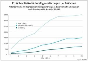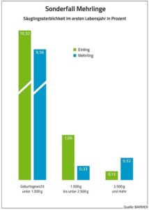 Barmer-Analyse: Frühchen drohen erhebliche Gesundheitsstörungen20. Juni 2023 Foto: © Tobilander – stock.adobe.com Frühgeborene mit niedrigem Geburtsgewicht haben häufiger Gesundheits- und Entwicklungsstörungen als Kinder, die mit normalem Gewicht geboren werden. Ein erheblicher Teil der Probleme wird erst in späteren Lebensjahren offensichtlich. Das zeigt eine aktuelle Analyse des Barmer-Arztreports, für die Daten von rund 274.000 Kindern ausgewertet wurden, die zwischen den Jahren 2006 und 2011 zur Welt kamen. Frühchen mit geringem Geburtsgewicht haben ein deutlich erhöhtes Risiko für kognitive Beeinträchtigungen. (Quelle: Barmer) „Die moderne Geburtsmedizin gibt heute frühgeborenen Kindern gute Überlebenschancen. Allerdings leiden Frühchen häufig auch später an Gesundheitsbeeinträchtigungen. Deshalb ist es wichtig, betroffene Kinder frühzeitig zu unterstützen“, erklärte Prof. Christoph Straub, Vorstandsvorsitzender der Barmer. Frühgeborene Kinder mit einem Geburtsgewicht weniger als 1500 Gramm wiesen gegenüber Normalgewichtigen nach fünf Jahren ein um 53,6 Prozent erhöhtes Risiko einer Beeinträchtigung oder Verzögerung der sprachlichen oder motorischen Entwicklung auf. Hier könnten zunächst die Physiotherapie oder etwas später die Logopädie oder Ergotherapie unterstützen. Zudem würden bei diesen Frühchen nach zehn Jahren kognitive Störungen fünfmal häufiger diagnostiziert als bei Kindern mit normalem Geburtsgewicht. Die Möglichkeit zerebraler Lähmungen, die zu Bewegungsstörungen führten, seien um mehr als den Faktor 20 erhöht. Höheres Gewicht verbessert Überlebenschance Im Barmer-Arztreport wurden ebenfalls die Überlebenschancen Neugeborener untersucht. Von den Kindern mit einem Geburtsgewicht von weniger als 500 Gramm überlebten lediglich 45,8 Prozent die ersten fünf Lebensjahre. Bei einem Gewicht von 750 bis 999 Gramm waren es bereits 92,2 Prozent. Ab 2500 Gramm Geburtsgewicht lag die Fünf-Jahres-Überlebensrate bei 99,8 Prozent. „Die Säuglings- und Kleinkindersterblichkeit in Deutschland ist glücklicherweise gering. Dennoch zeigt die Analyse, welche zentrale Rolle das Geburtsgewicht für die Überlebens- und Entwicklungschancen von Frühchen spielt“, sagte Straub. Es hänge vor allem von der Dauer der Schwangerschaft ab. Sie beeinflusse darüber hinaus auch die Reife des frühgeborenen Kindes und damit dessen Chance, zu überleben. Ein sehr früh geborenes und damit unreifes Kind habe bei identischem Geburtsgewicht schlechtere Überlebenschancen als ein später geborenes reiferes, da einzelne Organsysteme wie etwa die Lunge noch nicht voll ausgebildet seien. Sonderfall Mehrlingsschwangerschaft Frühgeborene aus Mehrlingsschwangerschaften haben bei niedrigem Geburtsgewicht ein geringeres Sterberisiko als Frühgeborene aus Einzelschwangerschaften. (Quelle: Barmer) Das Sterblichkeitsrisiko zu früh geborener Kinder hängt laut der Analyse des Arztreports darüber hinaus stark davon ab, ob sie aus einer Mehrlingsschwangerschaft stammen. So hatten Mehrlinge mit einem Geburtsgewicht ab 2500 Gramm gegenüber allein im Mutterleib herangewachsenen Kindern gleichen Gewichts ein etwa vierfach höheres Sterberisiko. Bessere Überlebenschancen hätten dagegen leichtere Mehrlinge mit einem Gewicht von 1500 bis 2499 Gramm. Bei ihnen sei das Sterblichkeitsrisiko lediglich um das Zweieinhalbfache erhöht. „Bei Zwillingen gilt ein Geburtsgewicht um 2400 Gramm als normal, bei Drillingen sind es sogar nur knapp 2000 Gramm. Das dürfte einen Grund für die vergleichsweise niedrige Sterblichkeit in dieser Gewichtsgruppe darstellen“, so Straub.