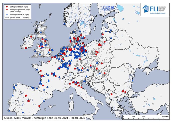 Mehr erfahren zu: "Vogelgrippe: Übersichtskarte zeigt Dynamik des Infektionsgeschehens" Vogelgrippe: Übersichtskarte zeigt Dynamik des Infektionsgeschehens Auf vom Friedrich-Loeffler-Institut (FLI) veröffentlichten Karten zur Verbreitung der Hochpathogenen Aviären Influenza (HPAI), auch als Vogelgrippe bekannt, ist in Europa die Verbreitung des Virus mit dem Herbstvogelzug Richtung Süden abzulesen.