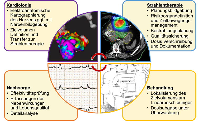 Bestrahlung gegen ventrikuläre Tachykardien: Start des europaweiten STOPSTORM-Behandlungsregisters19. Dezember 2022 Bild: ©Pinkcamo – stock.adobe.com Wie können ventrikulären Tachykardien erfolgreicher behandelt werden? Ein vielversprechender Ansatz ist die stereotaktische Strahlentherapie. Ein neu eingerichtetes Register soll helfen, die Sicherheit und Wirksamkeit dieses neuen Behandlungsverfahrens zu bewerten. Die stereotaktische Strahlentherapie wird bereits seit Jahren zur Behandlung von z.B. Lungen- oder Prostatakrebs standardmäßig eingesetzt. Die nichtinvasive, einmalige Hochpräzisionsbestrahlung wurde 2018 am Universitätsklinikum Schleswig-Holstein, Campus Kiel, erstmalig in Deutschland zur Behandlung der ventrikulären Tachykardie angewendet. Die ersten Erfahrungswerte sind vielversprechend, dennoch muss noch mehr über die Langzeitergebnisse dieser innovativen Behandlung in Erfahrung gebracht werden. Daher hat das vom Forschungs- und Innovationsprogramm Horizon 2020 der Europäischen Union geförderte STOPSTORM-Konsortium eine europaweite Datenbank eingerichtet, um die Sicherheit und Wirksamkeit der Behandlung besser zu verstehen. Ablauf einer STAR-Behandlung mit enger Zusammenarbeit zwischen Kardiologie und Strahlentherapie. Grafik: ©UKSH Europaweites Register Das erste europaweite Behandlungsregister für die stereotaktische Strahlentherapie von Herzrhythmusstörungen (STAR = Stereotactic Arrhythmia Radioablation) ist nun eröffnet worden und wird in Deutschland durch die Klink für Strahlentherapie des UKSH, Campus Kiel, koordiniert. Das STOPSTORM-Konsortium nimmt ab sofort Daten von 30 Partnerorganisationen in acht europäischen Ländern entgegen. Eine Ausweitung auf weitere Länder und Zentren in der EU ist geplant. Ziel des STOPSTORM-Projekts ist es, bis 2025 Daten von über 300 Patientinnen und Patienten in das Register aufzunehmen. Anhand dieser Daten sollen die Indikation, Sicherheit und Wirksamkeit der STAR-Behandlung für ventrikuläre Tachykardien überprüft werden. Begleitende klinische Studie in Deutschland Begleitet wird das STOPSTORM-Projekt durch die RAVENTA-Studie, die bislang weltweit einzige multizentrische klinische Studie, die die Durchführbarkeit und Sicherheit der STAR-Behandlung an 20 Patientinnen und Patienten in Kiel, Lübeck, Mannheim, Berlin, Hannover, München und Dresden untersucht. „Wir sind sehr glücklich, das STOPSTORM-Register mit unseren qualitätsgesicherten prospektiven Daten unterstützen zu können“, erklärt Projektkoordinator Dr. Oliver Blanck aus der Klinik für Strahlentherapie am UKSH, Campus Kiel. „Bislang konnten in der RAVENTA-Studie bereits elf der geplanten 20 Patientinnen und Patienten behandelt werden. Die bisherigen Erfahrungswerte sind sehr vielversprechend“, erläutert Prof. Jürgen Dunst, Studienleiter der RAVENTA-Studie und Direktor der Klinik für Strahlentherapie am Campus Kiel. „Aktuell ist es noch zu früh für eine abschließende Beurteilung, aber wir konnten bereits erhebliche und rasche Abnahmen der ventrikulären Tachykardien bei einem Großteil der Patientinnen und Patienten beobachten. Schwere behandlungsbedingte Nebenwirkungen traten bislang nicht auf“, ergänzt PD Dr. David Krug, stellvertretender Direktor der Klinik für Strahlentherapie am Campus Kiel. Workshop zum Verfahren Jüngst wurde unter der Leitung von Dunst und Prof. Roland Tilz, Direktor der Klinik für Rhythmologie des UKSH, Campus Lübeck, und RAVENTA-Co-Studienleiter, als Schirmherren zusammen mit der Arbeitsgruppe Radiochirurgie und Stereotaktische Strahlentherapie der Deutschen Gesellschaft für Radioonkologie (DEGRO) der 3. Deutsche Workshop zur stereotaktischen Strahlentherapie von Ventrikulären Tachykardien in Timmendorfer Strand abgehalten. „Wir haben uns sehr gefreut, dass wir mit 40 nationalen und internationalen Expertinnen und Experten diese neue Therapiemöglichkeit für Patientinnen und Patienten mit sonst austherapierten Herzrhythmusstörungen diskutieren konnten“, erklärt Tilz. „In Deutschland wurden bereits mehr als 30 Patienten mit einer STAR-Behandlung therapiert. Unsere gemeinsame Aufgabe ist nun die frühe Harmonisierung und Optimierung dieser Behandlung, u.a. im Rahmen der Arbeitsgruppen und des STOPSTORM-Projekts“. Das STOPSTORM-Projekt wird in Deutschland auch von der Arbeitsgruppe Elektrophysiologie der Deutschen Gesellschaft für Kardiologie als Nationale Observer Gruppe begleitet.