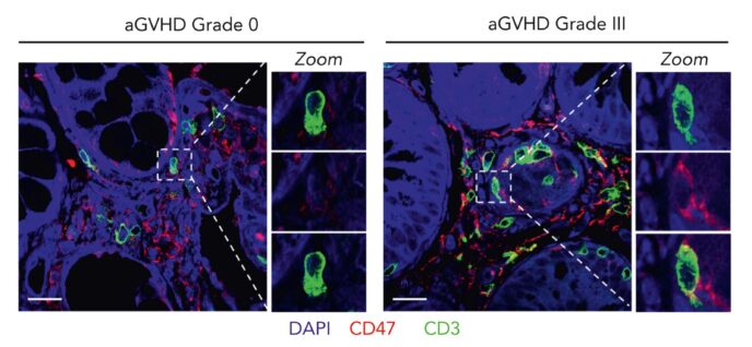 CD47 schützt pathogene T-Zellen nach Stammzelltransplantation6. Oktober 2025 Alloreaktive T-Zellen regulieren CD47 hoch und schützen sich so vor der Phagozytose durch Makrophagen. Hier sind alloreaktive T-Zellen aus einer Patientenbiopsie dargestellt, die in den Darmtrakt eindringen und eine akute Graft-versus-Host-Disease auslösen. (Bild: © Flamann & Shaikh et al., Blood 2025) In einer Studie aus Würzburg wurde das Oberflächenprotein CD47 als Schlüsselfaktor identifiziert, der es alloreaktiven T-Zellen ermöglicht, sich der Beseitigung durch Makrophagen zu entziehen und die Graft-versus-Host-Disease (GvHD) zu verschlimmern. Eine gezielte Bekämpfung von CD47 durch eine Antikörpertherapie könnte die Beseitigung pathogener T-Zellen verbessern und somit die GvHD nach einer allogenen Stammzelltransplantation verhindern. Eine allogene Stammzelltransplantation kann für Patienten, deren eigenes Knochenmark keine gesunden Blutzellen mehr bilden kann, lebensrettend sein. Doch die Therapie birgt auch Risiken: T-Zellen des Spenders können den Körper des Empfängers als fremd erkennen und eine überschießende Abwehrreaktion auslösen, auch als Graft-versus-Host-Disease (GvHD) bezeichnet. Im Rahmen des SFB/TRR 221 untersuchen die Unikliniken Erlangen, Regensburg und Würzburg gemeinsam Strategien zur Steuerung der GvHD- und Transplantat-Leukämie-(GvL)-Effekte. Ziel ist es, die Sicherheit und Wirksamkeit der allogenen hämotopoetischen Stammzelltransplantation zu verbessern. So wurde beispielsweise untersucht, warum die entzündlichen Spender-T-Zellen, die eine GvHD antreiben, von Makrophagen nicht wirksam entfernt werden. Dabei enthüllten die Forschenden einen versteckten Überlebenstrick der schädlichen Spender-T-Zellen. T-Zellen senden mit CD47 ein „Don’t eat me“-Signal an das Immunsystem Die schädlichen Spender-T-Zellen exprimieren ungewöhnlich hohe Konzentrationen des Proteins CD47. Dabei handelt es sich um ein Oberflächenprotein, das den Makrophagen signalisiert: „Don’t eat me“. Diese Überexpression wurde sowohl bei Patienten mit GvHD als auch in Mausmodellen beobachtet. „Damit bringen wir CD47 erstmals eindeutig mit der Transplantat-gegen-Wirt-Reaktion in Verbindung“, sagt Dr. Haroon Shaikh von der Medizinischen Klinik und Poliklinik II des Uniklinikums Würzburg. Der Immunologe aus der Arbeitsgruppe von Prof. Andreas Beilhack publizierte die Ergebnisse in der Fachzeitschrift Blood. Die Erstautorenschaft teilt er sich mit Dr. Cindy Flamann aus der Gruppe von Privatdozent Dr. Heiko Bruns vom Uniklinikum Erlangen. Blockierung des CD47-Signals hilft bei Eliminierung schädlicher T-Zellen „Spannend wurde es, als wir CD47 mit Antikörpern blockiert haben“, berichtet Shaikh. „Denn durch die Blockierung wurde die Fähigkeit der Makrophagen wiederhergestellt, die alloreaktiven T-Zellen zu phagozytieren und somit zu eliminieren. Bei unseren Mäusen konnten wir beobachten, dass die schädlichen Zellen effektiver beseitigt wurden, die Entzündung im Darm zurückging und sich ihre Überlebenschancen verbesserten. Darüber hinaus verursachten Spender-T-Zellen ohne CD47 deutlich weniger Transplantat-gegen-Wirt-Erkrankungen und führten zu besseren Ergebnissen.“ „Unsere Ergebnisse eröffnen ein vielversprechendes klinisches Potenzial für die Blockade von CD47 zur Behandlung von GvHD“, betont Bruns. Auf dieser Basis bereitet das Team bereits erste klinische Studien vor. Langfristiges Ziel ist es, durch gezielte Bekämpfung von CD47 die Eliminierung pathogener T-Zellen zu verbessern und so die GvHD nach einer allogenen Stammzelltransplantation zu verhindern.