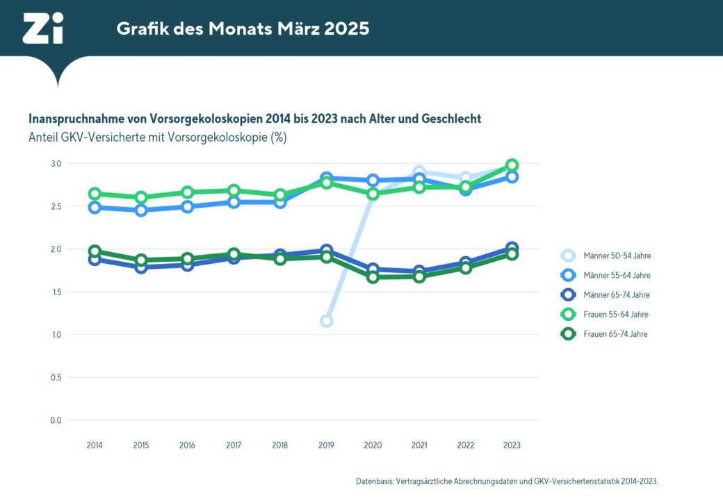 Darmkrebsvorsorge: Inanspruchnahme von Koloskopien mit Beginn des Einladungsverfahrens 2019 leicht gestiegen 31. März 2025 Koloskopie (Abbildung: © Man888/stock.adobe.com) Wie steht es in Deutschland um die Darmkrebsvorsorge? Das Zentralinstitut für die kassenärztliche Versorgung (Zi) hat zum Ende des Darmkrebsmonats März Ergebnisse einer aktuellen Schwerpunktauswertung der vertragsärztlichen Abrechnungsdaten für den Zeitraum 2014 bis 2023 veröffentlicht. Der Auswertung des Zi zufolge blieb der Anteil gesetzlich Versicherter zwischen 55 und 64 Jahren in Deutschland, die eine Vorsorgekoloskopie in Anspruch genommen haben, in den Jahren 2014 bis 2018 nahezu unverändert, während dieser Wert zu Beginn des Einladungsverfahrens im Jahr 2019 etwas anstieg. Ein weiterer leichter Anstieg bis zum Jahr 2023 sei lediglich für 55- bis 64-jährige Frauen zu beobachten, berichtet das Zi. Männer der gleichen Altersgruppe blieben auf dem Niveau von 2019. Insgesamt, so erklärt das Institut, könne man bei den 55- bis 64-Jährigen nur geringfügige Unterschiede zwischen Männern und Frauen beobachten. Von der seit 2019 präventiv fokussierten Bevölkerungsgruppe der Männer zwischen 50 und 54 Jahren werde das Angebot ab 2020 in ähnlichem Maße angenommen wie von 55- bis 64-Jährigen. 65- bis 74-Jährige kämen für die zweite Vorsorgekoloskopie infrage, wobei der Anteil derjenigen mit einer Untersuchung in dieser Altersgruppe signifikant niedriger sei als bei den Jüngeren. Über die Jahre 2014 bis 2019 stellte das Zi dabei kaum eine Veränderung fest. Während der COVID-19-Pandemie (2020-2021) zeigen die vertragsärztlichen Abrechnungsdaten einen Rückgang der Inanspruchnahme-Rate. 2023 wurde das Niveau von 2019 wieder erreicht. Weniger Neuerkrankungen seit Einführung der Vorsorgekoloskopie als Kassenleistung „Mit Beginn des Einladungsverfahrens sehen wir, dass die Teilnahmerate an Vorsorgekoloskopien insbesondere bei jüngeren Patienten etwas gesteigert werden konnte“, erklärt der Zi-Vorstandsvorsitzende Dr. Dominik von Stillfried. „Dass es seitdem keinen substanziellen Anstieg mehr gab, könnte auf die COVID-19-Pandemie zurückzuführen sein. Die sinkende Zahl von Darmkrebs-Neuerkrankungen seit 2002, als die Vorsorgekoloskopie als Leistung der gesetzlichen Krankenkasse eingeführt worden ist, zeigt jedoch deutlich, dass Früherkennungsuntersuchungen vor ernsthaften Erkrankungen wirksam schützen können. Wir müssen allerdings nach wie vor feststellen, dass die Teilnahmeraten zur Darmkrebsvorsorge auch weiterhin deutlich ausbaufähig sind.“ Prozentualer Anteil von gesetzlich Versicherten, die 2014-2023 Vorsorgekoloskopien in Anspruch genommen haben (differenziert nach Alter und Geschlecht). Quelle: © Zi Für den Unterschied der geringeren Inanspruchnahme von Vorsorgekoloskopien durch ältere gegenüber jüngeren Patientinnen und Patienten seien verschiedene Erklärungsansätze denkbar, fährt von Stillfried fort: „Zum einen erhalten ältere Patientinnen und Patienten womöglich auf Grund von Beschwerden öfter eine kurative Koloskopie, so dass der Anlass für die Vorsorgekoloskopie entfällt. Wenn im Alter mehr Koloskopien auf Grund von Symptomen vorgenommen werden, kann das unter Umständen auch für eine unzureichende Vorsorge in jüngerem Alter sprechen. Möglicherweise ist auch die erste Untersuchung als unangenehm empfunden und daher auf die zweite verzichtet worden. Das Einladungsschreiben erhalten gesetzlich Versicherte im Alter von 50, 55, 60 und 65 Jahren. Eventuell kann eine Einladung in höherem Alter die Teilnahme zur zweiten Vorsorgekoloskopie erhöhen. Bekannt ist, dass die Teilnahmerate an Vorsorgekoloskopien bei jüngeren Personen bis 59 Jahre deutlich am höchsten ist und umso geringer ausfällt, je älter die Personen sind. Auch alternative Kommunikationswege bei der Aufklärung zur Darmkrebs-Früherkennung sollten weiter intensiviert werden.“