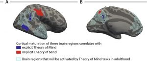 Das Gehirn besitzt zwei Systeme, um sich in andere hineinzuversetzen10. März 2020 Das Gehirn scheint zwei verschiedene Strukturen zu besitzen, durch die wir uns in andere hineinversetzen können. Diese reifen zu unterschiedlichen Zeitpunkten heran, sodass erst Vierjährige die Denkweise eines anderen nachvollziehen können – und nicht, wie bislang angenommen, bereits Einjährige. (Foto: © shutterstock) Das Gehirn scheint zwei verschiedene Strukturen zu besitzen, durch die wir uns in andere hineinversetzen können. Diese reifen zu unterschiedlichen Zeitpunkten heran, sodass erst Vierjährige die Denkweise eines anderen nachvollziehen können – und nicht, wie bislang angenommen, bereits Einjährige. Zu dem Ergebnis kommt eine Studie im Fachmagazin PNAS. Um zu verstehen, was der andere denkt und wie er sich verhalten wird, entwickelt sich im Laufe des Lebens die Fähigkeit, sich in die Perspektive des anderen hineinzuversetzen. Diese Fähigkeit wird auch als Theory of Mind bezeichnet. Bislang waren Forscher uneins darüber, in welchem Alter Kinder erstmals dazu in der Lage sind. Wissenschaftler des Max-Planck-Institut für Kognitions- und Neurowissenschaften (MPI CBS), University College London und Social Neuroscience Lab Berlin haben in einer aktuellen Studie gezeigt: Erst Vierjährige scheinen sich tatsächlich in andere hineinversetzen zu können. Zwar sind schon jüngere Kinder fähig dazu, das Verhalten anderer vorhersagen. Es zeigt sich jedoch: Sie bedienen sich dabei anderer Prozesse und Hirnnetzwerke als jene, die uns später zur Theory of Mind befähigen. Das Gehirn scheint damit zwei unterschiedliche Systeme zu besitzen, die es uns ermöglichen, die Sichtweise des anderen einzunehmen. Untersucht haben die Wissenschaftler diese Zusammenhänge mithilfe eines Videoclips. Darin ist eine Katze zu sehen, die eine Maus dabei beobachtet, wie sie in einer Kiste verschwindet. Anschließend kehrt die Katze der Kiste für einen Moment den Rücken zu, die Maus huscht unbemerkt in die benachbarte Box. Als die Katze sich wieder der Szenerie widmet, will sie nach ihrer Beute schauen – und läuft auf die erste Kiste zu. Mithilfe der sogenannten Eye-Tracking-Methode analysierten die Wissenschaftler das Blickverhalten ihrer kleinen Studienteilnehmer und stellten fest: Sowohl die Drei- als auch Vierjährigen konnten richtig voraussehen, wo die Katze nachschauen wird. Sie erkannten, dass die Katze die Maus noch immer in ihrem ersten Unterschlupf erwartet und dort suchen wird – obwohl sie selbst wussten, dass sich die Maus an anderer Stelle befindet. Das Interessante dabei: Als die Wissenschaftler die Dreijährigen explizit danach fragten, wo die Katze nach der Maus suchen werde, antworteten sie falsch. Sie konnten also zwar mit ihrem Blick richtig vorhersagen, wo die Katze suchen wird, dies aber nicht beantworten, wenn sie explizit gefragt wurden. Erst Vierjährigen gelang es im Schnitt, die richtige Antwort zu geben. Aus Kontrollaufgaben wusste man, dass das nichts damit zu tun hatte, dass die Jüngeren die Frage nicht verstanden hatten. Der Grund ist ein anderer: Bei beiden Entscheidungsprozessen, der non-verbalen Variante über den Blick und der verbalen über die Antwort, sind andere Hirnstrukturen beteiligt. Die Forscher sprechen hier von Arealen für die implizite und die explizite Theory of Mind. Beide Bereiche sind zu unterschiedlichen Zeitpunkten so weit entwickelt, dass sie ihre Funktionen erfüllen können. Im Supramarginalen Gyrus, der Region für die non-verbale Perspektivübernahme, ist die Großhirnrinde bereits früher entsprechend weit ausgereift. Damit können bereits Dreijährige die Handlungen anderer vorhersehen. Am sprachlichen Denken über das, was die Katze denkt, waren andere Hirnregionen beteiligt als an den non-verbalen Prognosen über das Verhalten der Katze. Die Forscher bezeichnen diese Gehirnstrukturen als Regionen entweder für die implizite oder für die explizite Theory of Mind. Diese kortikalen Hirnregionen reifen in verschiedenen Altersstufen heran, um ihre Funktion zu erfüllen. (© MPI CBS) „Erst im Alter von vier Jahren sind dann der temporoparietale Übergang und der Precuneus entsprechend herangereift, die Regionen, durch die wir verstehen, was andere denken – und nicht nur, was sie fühlen und sehen oder wie sie handeln werden“, erklärt Erstautorin Charlotte Grosse Wiesmann vom MPI CBS das zentrale Ergebnis der aktuellen Studie. “In den ersten drei Lebensjahren scheinen also Kinder noch nicht zu verstehen, was der andere denkt und dass das womöglich falsch ist“, erklärt Mitautor Nikolaus Steinbeis vom University College London. „Es scheint einen Mechanismus in der frühen Kindheit zu geben, eine frühe Form der Perspektiveinnahme, bei dem man einfach den Blick des anderen übernimmt. In dieser Entwicklungsphase ist man schlicht darauf angewiesen, das zu übernehmen, was etwa die Eltern wissen und sehen.“ Originalpublikation: Grosse Wiesmann C et al.: Two systems for thinking about others’ thoughts in the developing brain. PNAS, 9. März 2020