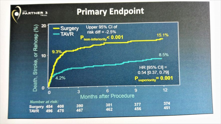 DGK: Neuer Goldstandard bei der Behandlung der Aortenklappenstenose26. April 2019 Prof. Michael Böhm (li.), Prof. Helge Möllmann (Mitte) und Prof. Karl-Heinz Kuck bei der DGK-Pressekonferenz “TAVI – Partner 3”. Foto: © Frins Große Studien, die in den letzten Wochen erschienen sind, bescheinigen dem minimalinvasiven, kathetergestützten Aortenklappenersatz eine deutliche Überlegenheit gegenüber dem chirurgischen Verfahren. Die Deutsche Gesellschaft für Kardiologie – Herz- und Kreislaufforschung e. V. (DGK) sprach sich gestern während ihrer Jahrestagung für eine Anpassung der Leitlinien und der regulatorischen Vorschriften zum Aortenklappenersatz aus. „Es haben sich in den letzten Wochen dramatische Änderungen der Datenlage ergeben. Ein alter Goldstandard gerät ins Wanken und wird durch eine neue Therapie ersetzt“, stellt Prof. Helge Möllmann, stellvertretender Sprecher der Arbeitsgruppe Interventionelle Kardiologie (AGIK) der DGK, fest. Er bezieht sich dabei auf die im März in den USA erschienene PARTNER 3-Studie. Tausend Patienten waren in die Studie eingeschlossen, die den kathetergestützten Aortenklappenersatz (TAVI) mit der chirurgischen Implantation neuer Aortenklappen (AKE) verglich. DGK: Bahnbrechende Daten sprechen für die TAVI Unterschiede beim primären Endpunkt zwischen chirurgischem Aortenklappenersatz und TAVI in der PARTNER-3-Studie. Foto: Frins „Es gibt keine Studie, die das chirurgische Verfahren jemals an einer so großen Patientengruppe untersucht hat, wie PARTNER 3“, so Möllmann während der Pressekonferenz am Donnerstag. Die Studie zeigte eine statistisch deutliche Überlegenheit der TAVI-Methode gegenüber dem chirurgischen Verfahren: Nach zwölf Monaten waren 15,1% der chirurgisch behandelten Patienten verstorben, erlitten einen Schlaganfall oder mussten wegen Komplikationen erneut stationär in einem Krankenhaus behandelt werden. Bei der TAVI waren es lediglich 8,5% der Patienten. Wurden ausschließlich die Punkte Tod und behindernder Schlaganfall betrachtet, konnten durch die TAVI-Prozedur rund zwei Drittel der Ereignisse reduziert werden. „Die Risikoreduktionen, die PARTNER 3 zeigt, sind so ausgeprägt, dass Kritikern der Methode jeder Wind aus den Segeln genommen ist“, sagt Möllmann. „So eindeutige Daten gibt es nicht noch einmal.“ Gute Haltbarkeit der TAVI-Prothesen ist nachgewiesen Lediglich die Haltbarkeit der bei einer TAVI eingesetzten Prothesen wird immer wieder infrage gestellt. Es fehlten die Langzeitdaten, monieren Kritiker. Möllmann: „Für die wenigsten chirurgischen Aortenklappenprothesen gibt es echte Langzeitdaten. Die Prothesen werden weiterentwickelt und die Berechnungen zur Haltbarkeit aus alten Studien extrapoliert. Darüber hinaus liegen uns Daten vor, die zeigen, dass es in den ersten 7 Jahren nach der Implantation keine Anzeichen für Degenerationen bei den TAVI-Klappen gibt. Im Gegenteil: kürzlich publizierte Daten weisen zumindest für die ersten 6 Jahre statistisch deutlich signifikante Vorteile für die TAVI-Klappen aus.“ Neue Regelungen des Gemeinsamen Bundesausschusses und der Krankenkassen dringend notwendig Die Experten der DGK sehen nun die unbedingte Notwendigkeit, die Behandlungsleitlinien dieser Datenlage zügig anzupassen, da eine therapieverändernde neue Evidenz durch die Daten entstanden ist. Prof. Karl-Heinz Kuck sagte während der Pressekonferenz: „Zuvor werden wir schon zeitnah mit der Erstellung eines Positionspapieres beginnen, in das wir unsere herzchirurgischen Kollegen gern einbinden möchten. Eindeutig ist es an der Zeit, TAVI zum Goldstandard in der Therapie der Aortenklappenstenose zu erklären und die regulatorischen Voraussetzungen seitens des Gemeinsamen Bundesausschusses und der Krankenkassen an die dramatisch veränderte Datenlage anzupassen.“ Besonders gestärkt werden müsse, so die Experten, die gleichberechtigte Herangehensweise im Heartteam. „Alle Patienten müssen gemeinsam hinsichtlich der optimalen Behandlungsmöglichkeit von Kardiologen und Chirurgen begutachtet werden, auch die, die initial an die chirurgischen Kollegen überwiesen wurden“, fordert Möllmann. „Die optimale Therapie wird, das zeigen uns die Daten, in den allermeisten Fällen die TAVI sein.“