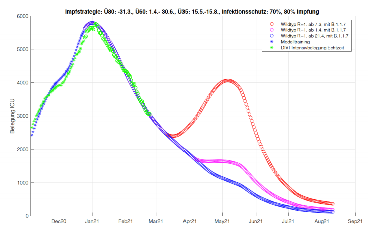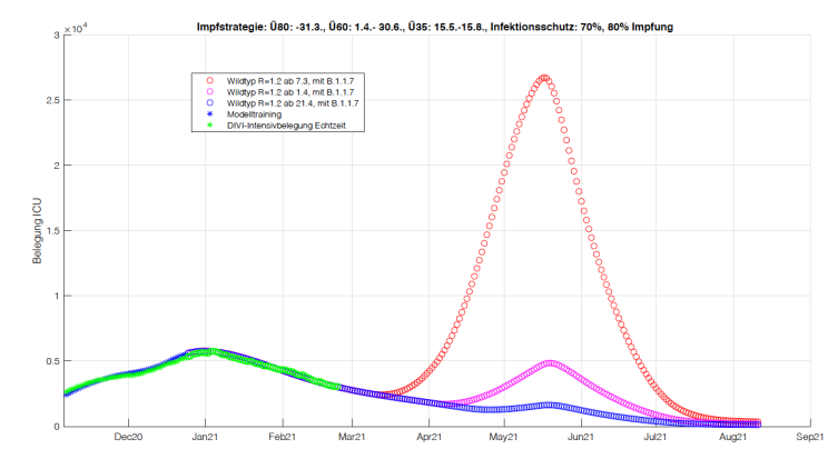 DIVI: Mit der Impfwelle vor die dritte Infektionswelle kommen26. Februar 2021 Bild: ©Nuthawut – stock.adobe.com Die Deutsche Interdisziplinäre Vereinigung für Intensiv- und Notfallmedizin (DIVI) hat ein Prognosemodell zur Simulation der Intensivbettenauslastung für COVID-19 in Abhängigkeit von der Infektionsdynamik und dem zu erwartenden Impfeffekt in Deutschland entwickelt. Basierend auf Berechnungen dieses Modells empfiehlt die DIVI den derzeitigen Lockdown über den 07. März hinaus um drei Wochen bis zum 1. April zu verlängern, um eine dritte Infektionswelle, welche auch die Intensivstationen erneut schwer belasten könnte, zu vermeiden. Das Virus SARS-CoV-2 hat Deutschland noch immer fest im Griff. Das Auftreten neuer Virusmutationen wie B.1.1.7 oder B.1.351 mit erhöhter Übertragbarkeit könnte dazu führen, dass die aktuellen Lockdown-Beschränkungen bald nicht mehr ausreichen, die Inzidenz auf einem stabilen Niveau zu halten. Steigt der effektive R-Wert über eins, befinden wir uns zum wiederholten Male in einer exponentiell steigenden Infektionsdynamik, in deren Folge die DIVI eine erneute starke Belastung der Intensivbettenbelegung mit COVID-19-Erkrankten erwartet. Um diese Infektionsdynamik, verknüpft mit der Intensivbettenbelegung, für die Zukunft genauer beziffern zu können, entwickelten Prof. Steffen Weber-Carstens und Prof. Christian Karagiannidis, beide wissenschaftliche Leiter des DIVI-Intensivregisters und Sprecher der DIVI-Sektion „Lunge – Respiratorisches Versagen“, gemeinsam mit Prof. Andreas Schuppert, Leiter des Instituts für Computational Biomedicine an der RWTH Aachen, das DIVI-Prognosemodell. Mit dessen Hilfe kann die Belegung der Intensivstationen in Deutschland anhand wissenschaftlich valider Daten mit hoher Wahrscheinlichkeit vorausgesagt werden kann. Das Rechenmodell von Schuppert berücksichtigt dabei sowohl die schnellere Verbreitung von SARS-CoV-2 durch Mutationen, als auch die fortschreitende Zahl Geimpfter. Simulation möglicher Zukunftsszenarien Auf einer Fachpressekonferenz stellten die drei genannten Experten gemeinsam mit dem aktuellen DIVI-Präsidenten Prof. Gernot Marx und dem Past-Präsidenten Prof. Uwe Janssens sowohl das Prognosetool als auch verschiedene damit simulierte Zukunftsszenarien vor. Insgesamt zeigen die Simulationen, dass Lockerungsszenarien im März, die zu einem R-Wert von eins für den Wildtyp bzw. 1,35 für die Mutante B.1.1.7 führen, in Kombination mit einer langsamen Impfstrategie, zu einer erneuten Spitzenbelastung von etwa 4000 COVID-19-PatientInnen auf Intensivstationen führen könnten. Eine spätere Öffnung im April geht hingegen allenfalls mit einem nur geringen Anstieg der COVID-19-PatientInnen auf der Intensivstation einher. Abbildung 1: Intensivbettenbelegung bei Kontrolle des R-Wertes für den Wildtyp (WT) um 1(=1,35 für B.1.1.7) in Abhängigkeit vom Zeitpunkt der Lockerung mit Erreichen des R-Wertes von 1 für den WT. Quelle: DIVI Steigt die Infektionsdynamik in Deutschland jedoch auf einen R-Wert von 1,2 für den Wildtyp bzw. 1,55 für B.1.1.7 an, kommt es den Simulationen zufolge zu einer unkontrollierten Spitzenbelastung der Intensivstationen mit COVID-19-PatientInnen bei einer Lockerung im März. Eine Lockerung im April hingegen ist selbst unter diesen Bedingungen mit einer Spitzenbelastung maximal in der Höhe des bisherigen Spitzenwertes des Januars 2021 verbunden. Abbildung 2: Intensivbettenbelegung bei Kontrolle des R-Wertes für den Wildtyp (WT) um 1,2(=1,55 für B.1.1.7) in Abhängigkeit von dem Zeitpunkt der Lockerung mit Erreichen des R-Wertes von 1,2 für den WT. Quelle: DIVI Eine Beschleunigung der Impfungen mit einer Impfung von 80 Prozent der über 35-Jährigen ist in allen Simulationen mit einer deutlich geringeren Belastung der Intensivstationen verbunden. „Ein dauerhaft erhöhter R-Wert größer eins sollte auf Grund der hohen Infektionsbelastung möglichst vermieden werden“, heißt es daher von der DIVI. Es müsse alles dafür getan werden, die Impfung der Bevölkerung mit allen zur Verfügung stehenden Impfstoffen so schnell wie möglich voran zu treiben. Man müsse „mit der Impfewelle vor die Infektionswelle“ gelangen, wie Karagiannidis deutlich machte. Im Herbst seien dann zuverlässige Öffnungen möglich, fügte Janssens an. Aus Sicht des DIVI-Präsidenten Marx ist eine R-Wert gesteuerte Öffnungsstrategie entscheidend, die jedoch bis zum 1. April verschoben werden müsse. Weitere Details zum DIVI-Prognosemodell, mit geplanten wöchentlichen Updates, finden Sie unter https://www.divi.de/register/divi-prognosemodell (ah)