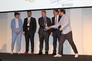 DKOU 2019: Science-Slam geht in die zweite Runde24. Oktober 2019 Faire Geste unter Slammern: Peter Westerhoff (r.) gratuliert dem Science-Slam-Sieger 2019 Tobias Schöbel. Dabei auch das Team Johanna Ueberberg und Lukas Heilmann (l.) und Max Daniel Kauther (Foto: hr, Biermann Medizin). Nach der erfolgreichen Premiere 2018 lieferten sich ein Team und drei Einzelkämpfer auch in diesem Jahr einen “Battle” um die Gunst der Zuhörer mit unterhaltsamen Vorträgen und skurrilen Erkenntnissen aus der Wissenschaft. Unter den Kriterien wissenschaftlicher Anspruch und Originalität des Beitrages, die von einer sechsköpfigen Jury bewertet wurden, sowie der Messung des Publikumapplauses kamen nach einem engen Abstimmungsergebnis das Team mit Johanna Überberg und Lukas Heilmann vom Uniklinikum Münster mit ihrem “Joint Battle – Hand versus Schulter” sowie Tobias Schöbel vom Uniklinikum Leipzig mit seinem Vortrag “Podcast in der Orthopädischen Lehre – hilfreiches Lehrtool oder günstige Netflix-Alternative” in das finale Stechen. Aus diesem ging nach dem entscheidenden tosenden Applaus der Zuhörer Schöbel als glücklicher Sieger hervor. Er durfte sich über ein Slam-Stipendium der DGOU in Höhe von 1000 Euro und den freien online-Zugriff auf Fachpublikationen eines großen Verlages freuen. In seinem Beitrag stellte der junge Vortragende eine Studie vor, die das Besucherverhalten von Medizinstudenten einer Hauptvorlesungsreihe in der Orthopädie analysierte. Dabei untersuchte er folgende Fragestellungen:1. Wollten die Studierenden in die Vorlesung gehen?2. Waren die Studierenden in der Vorlesung?3. (Wann) haben sich die Studierenden den Podcast angeschaut?4. Was haben sie stattdessen gemacht? Traurige Erkenntnisse: Der Eifer von Studierenden eine Vorlesung regelmäßig zu besuchen scheint weiterhin auf einem niedrigen Niveau zu stagnnieren und ist oft abhängig von “weichen Faktoren” wie der Attraktivität der/des DozentIn. Wenn überhaupt, dann schauten sich die Studierenden nur in der Woche vor der Klausur den Podcast an und bevorzugen stattdessen klassisches TV-Programm (auf dem absteigenden Ast, da old-fashioned) und zunehmend Netflix und Co. Für Lacher und gute Unterhaltung mit schrägen Erkenntnissen aus ernster Forschung sorgten ebenso die vor dem Finale unterlegen Vorträge der mutigen Slammer Peter Westerhoff vom Julius Wolff Institut der Charité mit dem Vortrag zu “Instrumented Implants” sowie Max Daniel Kauther mit einer “Verletzungsrisikoanalyse zum Unterwasserrugby”. Für einen gelungenen Ablauf, die Einheizung des Publikums und gute Laune sorgten zudem die Organisatorinnen und Moderatorinnen Marie Samland aus Leipzig und Ricarda Seemann aus Berlin. (hr)