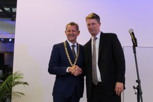 DOG 2019: Hans Hoerauf ist neuer Präsident – Fachgesellschaft feiert 2020 ihr Von-Graefe-Jahr30. September 2019 Prof. Hans Hoerauf, Direktor der Universitätsaugenklinik Göttingen, zeigt sich als neuer DOG-Präsident Arm in Arm mit Albrecht von Graefe, an dessen 150. Todestag die DOG 2020 erinnern wird. Foto: Kaulard/Biermann Medizin Prof. Hans Hoerauf, Direktor der Universitätsaugenklinik Göttingen, ist neuer DOG-Präsident. Auf der Farewell-Feier des DOG-Kongresses 2019 am Sonntag im Foyer des Berliner Estrel-Hotels überreichte ihm Prof. Claus Cursiefen (Köln) traditionsgemäß die Amtskette der Fachgesellschaft – doch dann sollte es nicht mehr ganz so traditionell weitergehen… „Das hab` ich ja noch nie gemacht, mich auf offener Bühne ausziehen“, lachte Hoerauf ins Mikrofon, als er begann, seine Krawatte zu lösen, um dann Sakko und Oberhemd aufzuknöpfen. Und als ob die altehrwürdige DOG versuchen wollte, ihn daran zu hindern, blieb der neue DOG-Präsident beim Abstreifen der Kleidungsstücke mehrfach in der langen, schweren Amtskette hängen. Dann aber war es geschafft – und der Gag gelungen: Hoerauf präsentierte sich im Motto-T-Shirt des DOG-Kongresses 2020: „AvG – Graefe“. Auf schwarzem Untergrund zeigt das T-Shirt in Comic-artiger blauer und gelber Strichzeichnung den Gründer der DOG als Rapper mit Baseball-Cap und cooler Sonnenbrille. Der Applaus und das herzhafte Lachen der Farewell-Gäste ließen Hoeraufs Erklärung fast ein wenig untergehen, dass die Fachgesellschaft 2020 das Von-Graefe-Jahr feiert. Anlass ist der 150. Todestag (20. Juli 1870) des Begründers der modernen Augenheilkunde. Auf ein Schwerpunktthema für das Kongressprogramm wird die DOG im kommenden Jahr bewusst verzichten, denn, so Hoerauf: „… von Graefe – das spricht für sich.“ Unterdessen war es auf der kleinen Bühne im Foyer ein wenig voller geworden. Neben Hoerauf stand plötzlich überlebensgroß „AvG“ wie man ihn kennt: im langen Mantel, mit dem Augenspiegel in der rechten Hand … ohne Baseball-Cap. Cursiefen, nun neuer zweiter DOG-Vizepräsident, hatte den Aufsteller aus der Requisite ins Rampenlicht geholt, und Hoerauf nahm sofort die Gelegenheit wahr, sich mit von Graefe Arm in Arm zu zeigen – ein Motiv, das später viele Farewell-Gäste gerne nachstellten. Ausblicke auf 2020 Wer während der DOG 2020 auf von Graefes Spuren durch Berlin wandeln will, wird dazu die Möglichkeit bei einer Exkursion haben, die Prof. Jens Rohrbach leiten wird. „Grandios“, versprach Hoerauf schon jetzt. Alles Wissenswerte zum Leben und Wirken von Graefes wird darüber hinaus in einer neuen Biografie nachzulesen sein. Als Highlight des Von-Graefe-Jahres 2020 kündigte Hoerauf weiterhin an, dass das EBO-Examen erstmals in Berlin stattfinden wird. Eine Premiere wird zudem das erste Joint-Meeting der DOG mit der internationalen Ocular Trauma Society sein. Als Beispiele für die inhaltlichen Schwerpunkte des kommenden 118. DOG-Kongresses nannte Hoerauf die Themen „Ökonomie und Medizin“ sowie „Fehlanreize in der Patientenversorgung“. Das Thema der Guest Lecture 2020 lässt ebenfalls aufhorchen: „Seinlassen als ärztliche Leistung“. Kurz und knapp So flott wie „AvG“ auf dem Motto-T-Shirt daherkommt, so schnell war diesmal auch der offizielle Teil der Amtsübergabe beendet. Cursiefen machte wortwörtlich nicht viele Worte, dankte so lang wie nötig und so kurz wie möglich allen am Kongresserfolg Beteiligten, um dann als letzte Amtshandlung die Präsidenten-Kette zu überreichen. Prof. Claus Cursiefen (r.) mit seinem Amtsnachfolger Prof. Hans Hoerauf. Foto: Kaulard/Biermann Medizin „Lief gut, habe ich gedacht“, gratulierte Hoerauf seinem Kollegen Cursiefen zu einem zukunftsweisenden Kongress mit neuen Formaten, die sofort gut angenommen worden seien. Als 1. Vizepräsident hätte er den Kongress diesmal ganz anders erlebt, sagte Hoerauf, und man merkte ihm Freude aufs Amt, aber vielleicht auch steigende Anspannung an. „Du strahlst so eine Ruhe aus, bist Du immer so?“, fragte der neue den alten Präsidenten, wünschte ihm aber trotzdem, nun wieder etwas mehr Zeit fürs Private finden zu können. Als kleines persönliches Geschenk mit lokaler Note überreichte er Cursiefen eine Flasche Gin, gebrannt aus Ingredienzien des Kräutergartens des Göttinger Klinikgründers. Und dann war da noch etwas im Geschenkpäckchen: ein „AvG“-T-Shirt. (dk)