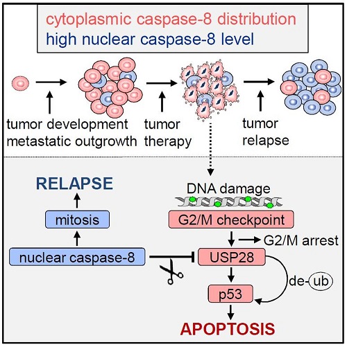 Dresdner Forscher entdecken Mechanismus bei aggressivem Krebs27. Januar 2020 Blick in Tumorgewebe des malignen Melanoms: Das Enzym Caspase 8 (dunkelrote Punkte) reichert sich in den Zellkernen an und aktiviert den für Patienten fatalen Überlebensmechanismus der Zelle. Bild: © Institute of Pharmacology, University of Bern Enzym blockiert Wächterfunktion gegen unkontrollierte Zellteilung Wissenschaftler des Universitätsklinikums Carl Gustav Carus Dresden im Nationalen Centrum für Tumorerkrankungen Dresden (NCT/UCC) haben gemeinsam mit einem internationalen Forscherteam in Laborversuchen einen bislang unbekannten Überlebensmechanismus im Zellkern besonders aggressiver Tumorzellen entschlüsselt. Eine wichtige Rolle hierbei spielt das proteinspaltende Enzym Caspase 8, das sich ausschließlich bei aggressiven Krebszellen im Zellkern anreichert. Ließe sich das Enzym an dieser Stelle chemisch hemmen, wäre es denkbar, verschiedene Krebserkrankungen auch in fortgeschrittenen Stadien wirkungsvoll zu bekämpfen. Ein neu entdeckter Mechanismus zeigt, wie das Enzym Caspase 8 am so genannten G2/M-Schadenskontrollpunkt die Wächterfunktion des Proteins p53 blockiert, den programmierten Zelltod verhindert und die geschädigten Krebszellen stattdessen in den Zellzyklus überführt. Bildquelle: Molecular Cell Die Aufdeckung des Mechanismus bietet daher einen vielversprechenden Ansatz für die Entwicklung neuer zielgerichteter Therapien. Neben dem malignen Melanom und Prostatatumoren konnte der entsprechende Mechanismus für weitere Tumorarten, darunter Bauchspeicheldrüsenkrebs, Blasenkrebs, Brustkrebs, Darmkrebs, Eierstockkrebs, Hodenkrebs, Lungenkrebs, Nierenkrebs und Tumoren des Hirns nahegelegt werden. Die Ergebnisse der Untersuchung sind am 22. Januar 2020 auf der Website des Fachmagazins „Molecular Cell“ (www.cell.com, DOI 10.1016/j.molcel.2019.12.023) veröffentlicht worden. Tumorzellen vermehren sich meist besonders schnell und setzen dabei Kontrollmechanismen außer Kraft, mit denen der Körper die Teilung kranker Zellen zu verhindern sucht. Häufig spielen hierbei Mutationen des im Zellkern enthaltenen Proteins p53 eine Rolle, das eine wichtige Kontrollfunktion im Zellzyklus ausübt. Gerade in besonders aggressiven Krebszellen, die bei metastasierenden Tumorerkrankungen wie dem malignen Melanom eine wichtige Rolle spielen, liegt p53 allerdings zumeist in seiner funktionsfähigen Normalform vor. Trotzdem kann es seiner Wächterfunktion offensichtlich nicht nachkommen. Verantwortlich hierfür ist ein bislang unbekannter Mechanismus, der bewirkt, dass der p53-Spiegel im Kern besonders aggressiver Krebszellen zu gering ist, um geschädigte Krebszellen in den programmierten Zelltod – eine Art Selbstmordprogramm der Zelle – zu treiben. Eine wichtige Rolle in diesem Mechanismus spielt das Enzym Caspase 8, das normalerweise nur im Zytoplasma vorkommt, sich bei aggressiven Krebszellen jedoch im Zellkern anreichert. „Wir konnten erstmals zeigen, dass Caspase 8 im Zellkern ein spezielles Protein – USP28 – spaltet, das dafür verantwortlich ist, den p53-Spiegel in Krebszellen mit erhöhter DNA-Schädigung anzureichern. In der Folge wird p53 zu stark abgebaut und kann seine Kontrollfunktion nicht mehr ausüben. Zellen mit geschädigter DNA werden dann nicht mehr in den programmierten Zelltod getrieben, sondern stattdessen der Zellteilung zugeführt“, erklärt Prof. Dagmar Kulms, Leiterin des Bereichs „Experimentelle Dermatologie“ des Universitätsklinikums Carl Gustav Carus Dresden im Nationalen Centrum für Tumorerkrankungen Dresden (NCT/UCC). „Wie wirkungsvoll dieser Mechanismus ist, zeigen die schlechten Überlebensraten von Patienten, bei denen sich eine Anreicherung von Caspase 8 im Zellkern von Tumorzellen nachweisen lässt. Gerade diese Zellen finden sich oft auch gehäuft in der restlichen Tumormasse, die sich bei vielen aggressiven Krebserkrankungen der zunächst erfolgreichen Behandlung entzieht“, sagt Dr. Mads Daugaard vom Vancouver Prostate Centre (Kanada). Die Wissenschaftler konnten den Mechanismus im Labor anhand zahlreicher Zelllinien sowie Patientengewebe für das maligne Melanom und Prostatakrebs belegen. Zum gleichen Ergebnis führten Untersuchungen an Zelllinien weiterer Tumorarten, darunter Bauchspeicheldrüsenkrebs, Blasenkrebs, Brustkrebs, Darmkrebs, Eierstockkrebs, Hodenkrebs, Lungenkrebs, Nierenkrebs und Tumoren des Hirns. Besonders vielversprechend ist, dass Caspase 8 nur bei besonders aggressiven Krebszellen im Zellkern vorkommt und dort das Protein USP28 spaltet. Ließe sich die Interaktion von Caspase 8 und USP28 mit einem chemischen Wirkstoff hemmen, könnten die aggressiven Tumorzellen künftig sehr gezielt bekämpft werden. „Dies könnte im Idealfall dazu führen, dass bei metastasierten Krebserkrankungen, bei denen heutige Tumortherapien versagen, möglicherweise das Wachstum und die Ausbreitung gestoppt werden könnten. Der Mechanismus spielt in einer Vielzahl von Krebsarten eine Rolle. Daher sind unsere Ergebnisse von besonders großer klinischer Relevanz“, sagt Prof. Stefan Beissert, Direktor der Klinik für Dermatologie des Universitätsklinikums Dresden. Gemeinsam mit spezialisierten Chemikern wollen die Wissenschaftler künftig an einem entsprechenden Wirkstoff forschen. Publikation: Ines Müller, Elwira Strozyk, Sebastian Schindler, Stefan Beissert, Htoo Zarni Oo, Thomas Sauter, Philippe Lucarelli, Sebastian Raeth, Angelika Hausser, Nader Al Nakouzi, Ladan Fazli, Martin E. Gleave, He Liu, Hans-Uwe Simon, Henning Walczak, Douglas R. Green, Jiri Bartek, Mads Daugaard and Dagmar Kulms: Cancer cells employ nuclear caspase-8 to overcome the p53-dependent G2/M checkpoint through cleavage of USP28 Molecular Cell dx.doi.org/10.1016/j.molcel.2019.12.023