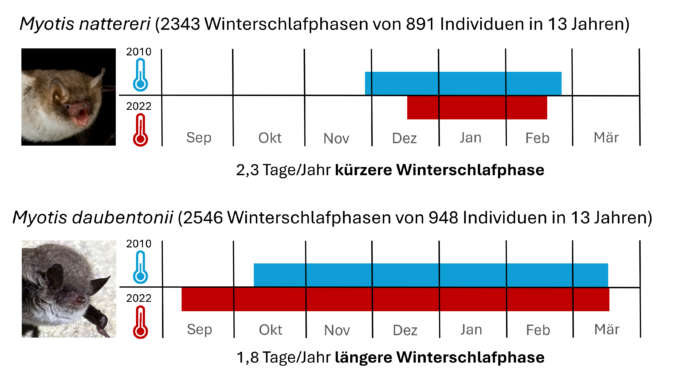 Mehr erfahren zu: "Unerwartete Reaktion auf Klimawandel: Wasserfledermäuse halten längeren Winterschlaf" Unerwartete Reaktion auf Klimawandel: Wasserfledermäuse halten längeren Winterschlaf Biologen der Universität Greifswald zeigen, dass Wasserfledermäuse mit einem immer längeren Winterschlaf auf die Auswirkungen des Klimawandels reagieren. Bei anderen Arten verhält sich dies anders.