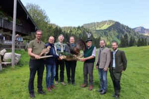 Erfolgreiche Zwischenbilanz des Auerhuhn-Monitorings in Bayern24. Mai 2023 Auerhahn mit zwei Auerhennen. Foto: © Panthermedia, Petr Simon Wie entwickeln sich die bayerischen Auerwildvorkommen in den letzten Jahren? Wie geht es dem Auerhuhn in Bayern heute? Um diese Fragen einschätzen zu können, startete die Bayerische Forstverwaltung 2022 ein langfristig angelegtes Auerhuhn-Monitoring. Im Spätsommer und Herbst letzten Jahres begaben sich 66 geschulte Auerhuhn-KartiererInnen – ehrenamtliche Verbandsvertreter, Naturschutzfachkräfte, Forstleute und private Auerhuhn-Freunde – auf Spurensuche nach dem seltenen Waldvogel. Die Zwischenbilanz dieser von vielen Schultern mitgetragenen Kooperation stellte die Bayerische Landesanstalt für Wald und Forstwirtschaft auf der Schwarzentennalm bei Kreuth vor. Für die beteiligten Akteure liegt der besondere Erfolg des Vorhabens in der breit gefächerten Zusammenarbeit. „Das Auerhuhn-Monitoring umfasst großflächig alle Vorkommensgebiete des Auerhuhns in ganz Bayern. Eine solche Mammutaufgabe kann nur gelingen, wenn alle beteiligten Institutionen und Einzelpersonen gut zusammenarbeiten, dies ist hier perfekt gelungen “, so Dr. Peter Pröbstle, Präsident der Bayerischen Landesanstalt für Wald und Forstwirtschaft (LWF). Zentrale Zielsetzung des Monitorings ist der Schutz und die Erhaltung strukturreicher Nadelmischwälder der Alpen und Mittelgebirge. Das Auerhuhn steht stellvertretend als wichtige „Schirmart“ für diese Wälder. Da es sehr hohe Ansprüche an seine Lebensräume stellt und große, ungestörte Flächen benötigt, werden mit seiner Erhaltung hier auch zahlreiche weitere Arten geschützt und quasi „beschirmt“. Hahn wird bis zu sechs Kilogramm schwer In Deutschland steht das Auerhuhn auch als „vom Aussterben bedrohte Tierart“ auf der „Roten Liste“. „Deshalb haben wir für den Schutz unseres größten Waldvogels – der Hahn wird bis zu 6 kg schwer und hat eine Flügelspannweite von über einem Meter – eine ganz besondere Verantwortung“, betonen Dr. Norbert Schäffer, Vorsitzender des Landesbundes für Vogelschutz (LBV) in Bayern und Hans Kornprobst, Waldexperte vom Bund Naturschutz in Bayern (BN). Vorstellung des Auerhuhn-Monitorings auf der Schwarzentennalm mit Ehrengästen. Foto: © Bayerische Landesanstalt für Wald und Forstwirtschaft Die Erhebungen der ersten Auerhuhninventur erfolgten im Bayerischen Wald, im Fichtelgebirge und in den bayerischen Alpen. Auf insgesamt 2.632 Stichprobenflächen wurde nach Auerhuhnnachweise (z.B. Sichtungen, Federn oder Kot) gesucht. Erfreulicherweise wurden an 228 dieser Inventurpunkte insgesamt 304 Nachweise erbracht. Weitere 503 Nachweise fanden sich außerhalb der Inventurpunkte. Während in den Bayerischen Alpen und im Bayerischen Wald viele Nachweise erfolgten und mehrere Monitoringflächen eine erfreulich hohe Aktivitätsdichte aufwiesen, wurde bislang im Fichtelgebirge leider lediglich eine Auerhenne gesichtet. Im Bergwald verändert der Klimawandel rasant den natürlichen Lebensraum Auch wenn die bisherigen Nachweise bereits wichtige Erkenntnisse lieferten, lassen sich nach der ersten Inventur noch keine gesicherten Aussagen über die Auerhuhn-Populationen und ihre Lebensräume machen. Dies werden erst die kommenden Monitoring-Durchgänge in den nächsten Jahren zeigen. Das Monitoringkonzept sieht vor, dass die Untersuchungen alle 3 Jahre wiederholt und zukünftig auch lokal mit genetischen Untersuchungen zur Bestimmung der Individuenzahlen ergänzt werden. Die Experten bewerten es als außerordentlich positiv, dass bereits seit vielen Jahren seitens der Naturschutzverbände, der Bayerische Forstverwaltung und den Bayerischen Staatsforsten sehr viel für den Waldnaturschutz getan wird. Sowohl innerhalb wie außerhalb von Schutzgebieten werden umfassende Managementpläne und Schutzkonzepte für das Auerhuhn erstellt, sowie Maßnahmen zur Verbesserung der Lebensräume umgesetzt. Das ist auch wichtig und notwendig, denn das Auerhuhn steht unter zunehmendem Druck. Im Bergwald verändert der Klimawandel rasant den natürlichen Lebensraum des Auerhuhns und auch Störungen durch immer vielfältigere Trendsportarten und wachsenden Erholungsverkehr nehmen zu,“ betont Martin Lauterbach, Auerhuhn-Experte der LWF. „Auch um zu prüfen, ob Schutzmaßnahmen wirksam sind und ob sich Waldlebensräume und Auerhuhn-Populationen verändern, brauchen wir das langfristige Monitoring!“