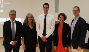 Erster Promovend der Uni-Augenklinik: Matthias Mauschitz absolviert erfolgreich Bonner PhD-Programm für Ärzte19. September 2019 Dr. Matthias Mauschitz (Mitte) und das Promotionskomitee (v. l.): Prof. Frank G. Holz, Prof. Monique M. B. Breteler, Prof. Caroline C. W. Klaver und Prof. Robert P. Finger. Foto: Universitäts-Augenklinik Bonn Nach fast fünf Jahren Forschungszeit erhält Dr. med. Matthias Marten Mauschitz als erster Absolvent der Universitäts-Augenklinik Bonn den PhD (Doctor of Philosophy) im Fach Epidemiologie von der Medizinischen Fakultät der Universität Bonn. Seit Ende 2014 ist es laut Mitteilung der Universitäts-Augenklinik Bonn möglich, sich in verschiedenen Fächern wie zum Beispiel Medizinische Neurowissenschaften oder auch Epidemiologie für das PhD-Programm zu bewerben. Das Vollzeitprogramm umfasst mindestens drei Jahre, in denen neben der Forschungstätigkeit der Besuch diverser Fortbildungsveranstaltungen obligatorisch ist. Mauschitz etablierte im Rahmen seiner Vollzeit-PhD-Forschungszeit die Augenuntersuchungen innerhalb der Rheinland Studie (www.Rheinland-Studie.de), einer großangelegten Populationsstudie unter Leitung von Prof. Monique M. B. Breteler im Deutschen Zentrum für Neurodegenerative Erkrankungen (DZNE e.V.) in Bonn. Die Dissertation mit dem Titel „Ophthalmic assessments and retinal biomarkers in ageing and neurodegenerative diseases. The Rhineland Study” befasst sich mit Netzhautbiomarkern und deren Einflussfaktoren auf Populationsebene. Sie basiert auf einer Kooperation des DZNE mit der Universitäts-Augenklinik Bonn unter Prof. Frank G. Holz und Prof. Robert P. Finger. Das vierte Mitglied des Promotionskomitees ist die Augenärztin und Epidemiologin Prof. Caroline C. W. Klaver aus Rotterdam. Mittlerweile, so heißt es weiter, hat Mauschitz seine Facharztausbildung an der Universitäts-Augenklinik Bonn begonnen und ist weiterhin in die Rheinland-Studie involviert. Quelle: Universitäts-Augenklinik Bonn