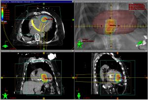 Erstmalig in Deutschland: Erfolgreiche Bestrahlungstherapie lebensbedrohlicher Herzrhythmusstörung10. Dezember 2018 Abb. 1: Mithilfe eines der weltweit modernsten Mappingsysteme wurde aus mehr als 10.000 Datenpunkten eine hochauflösende Darstellung der linken Herzkammer im elektrophysiologischen Labor erstellt, um so die Zielregion für die Bestrahlung zu identifizieren. Bild. © UKSH Als einer der ersten Patienten weltweit und als erster Patient in Deutschland konnte am 30. November 2018 ein 79-jähriger Mann mit lebensbedrohlichen und therapierefraktären Herzrhythmusstörungen mittels einer hochpräzisen einmaligen Bestrahlung erfolgreich behandelt werden. Die neuartige Behandlungsmethode wurde in enger Kooperation der Klinik für Innere Medizin III und der Klinik für Strahlentherapie am Universitätsklinikum Schleswig-Holstein (UKSH), Campus Kiel, durchgeführt. Der Patient leidet an einer schweren Herzmuskelerkrankung und erhielt trotz einer maximalen antiarrhythmischen medikamentösen Therapie von seinem implantierten Defibrillator fast täglich eine Schockabgabe. „Nach der erfolgreichen Bestrahlung sind die bösartigen Herzrhythmusstörungen bislang nicht wieder aufgetreten“, sagt Prof. Hendrik Bonnemeier, stellvertretender Klinikdirektor der Klinik für Innere Medizin III und Leiter der Abteilung für Elektrophysiologie und Rhythmologie. Gemeinsam mit dem Direktor der Klinik für Strahlentherapie, Prof. Jürgen Dunst, wurde dieser individuelle Heilversuch akribisch geplant und über ein halbes Jahr vorbereitet. „Die höchst innovative und zukunftsweisende Therapie ist ein sehr gutes Beispiel für die herausragende interdisziplinäre Kooperation am UKSH und zeigt das Potential universitärer Spitzenmedizin“, sagt Dunst. Zur Vorbereitung der Strahlenbehandlung erstellten Bonnemeier und OA Dr. Thomas Demming mittels eines der weltweit modernsten Mappingsysteme aus mehr als 10.000 Datenpunkten eine hochauflösende Darstellung der linken Herzkammer im elektrophysiologischen Labor, um so die Zielregion für die Bestrahlung zu identifizieren (s. Abb. 1). Abb. 2. Bild: © UKSH Anschließend wurde die gezielte Bestrahlung durch ein Team von Strahlentherapeuten und Medizinphysikexperten um OA Dr. David Krug und Prof. Dr. Frank-Andre Siebert geplant, berechnet und schließlich bei dem Patienten erfolgreich durchgeführt (Abb. 2). Die hochpräzise Bestrahlung zeigt eine neue, höchst innovative und möglicherweise wegweisende Therapieoption für bestimmte Patienten mit therapierefraktären ventrikulären Tachykardien auf. Eine prospektive Studie unter Leitung des UKSH Campus Kiel soll ab dem kommenden Jahr diese Methode bei betroffenen Patienten genauer untersuchen. Weitere Informationen: http://www.uksh.de/181207_pi_herzpatient_strahlenth.html