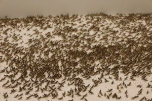 Experiment von einzigartigem Ausmaß: 10.000 Heuschrecken unter Beobachtung25. April 2023 Der Heuschreckenschwarm aus Sicht der getrackten Bewegungsdaten. Bild: © Centre for the Advanced Study of Collective Behaviour Im Imaging Hangar der Universität Konstanz wurde ein Heuschreckenschwarm markiert und mit Spezialkameras beobachtet. Dies ermöglichte erstmals das Studieren der Bildung von Heuschreckenschwärmen im Labor. Faszinierend war das Ausmaß der Versuchsanordnung. 60.000 Heuschreckenfüße laufen in einer Arena. Sie marschieren von links nach rechts, von rechts nach links. Von dem tapsenden Geräusch der Heuschrecken ist der Imaging Hangar, das größte Labor der Universität Konstanz, erfüllt. Das Experiment ermöglicht erstmals das Studieren der Bildung von Heuschreckenschwärmen im Labor. Blick in den Imaging Hangar. In einer Arena von fünf Metern Durchmessern befinden sich 10.000 Heuschrecken. Über ein Kamerasystem werden die Tiere genau beobachtet.Bild: © Elisabeth Böker, Centre for the Advanced Study of Collective Behaviour Die Forschenden verfolgen das Ziel, die Organisation und die Dynamiken, aber auch das Verhalten bei der Nahrungssuche bezüglich Futterverfügbarkeit oder die Kommunikation bei Gefahren in großen Schwärmen zu verstehen. Dafür haben sie rund 4.000 der Tiere mit reflektierenden Markern versehen. Von einem Motion-Capture-System werden die Marker erkannt. Damit kann der Standpunkt und die Bewegungsabläufe jedes einzelnen Tiers nachvollzogen werden.„Ohne Zweifel, ein Höhepunkt meiner Karriere“, sagt Iain Couzin, der mit dem 15-köpfigen Forschungsteam die Schwarmbildung vom Kontrollraum aus beobachtet. Der Sprecher des Exzellenzclusters Centre for the Advanced Study of Collective Behaviour (CASCB) der Universität Konstanz und Direktor des Max-Planck-Instituts für Verhaltensbiologie leitet das Gesamtprojekt.Besonders ist das Experiment aufgrund der Anzahl der Tiere und der eingesetzten Technik. Bisher gab es kein vergleichbares Experiment, schildern die WissenschaftlerInnen vom Exzellenzcluster CASCB der Universität Konstanz und dem Max-Planck-Institut für Verhaltensbiologie. Laborexperimente mit Heuschreckenschwärmen umfassten bislang typischerweise um die hundert Tiere.