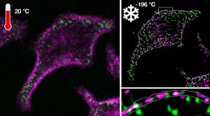 Mehr erfahren zu: "Coole Mikroskopie" Coole Mikroskopie Die Anwendung der Fluoreszenzmikroskopie in lebenden Zellen wird durch sehr schnelle und unaufhörliche Molekularbewegungen und durch die licht-induzierte Zerstörung der Fluoreszenzsonden fundamental eingeschränkt. Der ultraschnelle Kryo-Arrest direkt während der Beobachtung […]