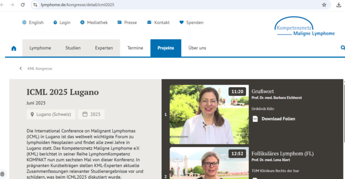 Mehr erfahren zu: "Lymphom-Sommer: KML-Experten stellen aktuelle Daten vom EHA 2025 und 18-ICML vor" Lymphom-Sommer: KML-Experten stellen aktuelle Daten vom EHA 2025 und 18-ICML vor In der Reihe „LymphomKompetenz KOMPAKT“ berichten renommierte Experten mit kurzen Videovorträgen von den diesjährigen Sommerkongressen − dem 30. Kongress der European Hematology Association (EHA) so wie der 18. International Conference […]