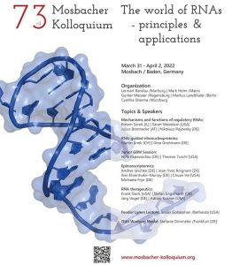 Mehr erfahren zu: "73. Mosbacher Kolloquium: The World of RNAs – Principles and Applications" 73. Mosbacher Kolloquium: The World of RNAs – Principles and Applications Das jährliche Mosbacher Kolloquium der Gesellschaft für Biochemie und Molekularbiologie (GBM e.V.) findet traditionell in Mosbach/Baden statt. Hier wird die GBM gemeinsam mit den wissenschaftlichen Organisatoren Prof. Lennart Randau (Marburg), […]