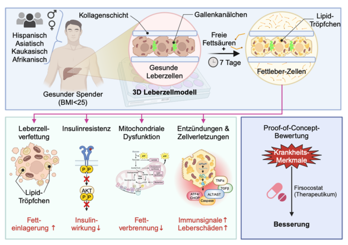 Fettlebererkrankungen: Zelluläres Modellsystem für die Arzneimittelentwicklung erstellt10. September 2024 Darstellung einer Fettleber. (Abbildung: © Sebastian Kaulitzki/stock.adobe.com) Wissenschaftler der Medizinischen Fakultät Mannheim der Universität Heidelberg haben ein Modellsystem entwickelt, mit dem Arzneimittel auf ihre Wirksamkeit bei Fettlebererkrankungen hin überprüft werden können. Es handelt sich um ein dreidimensionales (3-D) In-vitro-Zellkultursystem auf der Basis primärer menschlicher Leberparenchymzellen (Hepatozyten). Das Modellsystem kann laut den Entwicklern auch dabei unterstützen, neuartige Zielmoleküle für die Behandlung von Fettlebererkrankungen zu identifizieren. Und es kann dazu genutzt werden, Behandlungsstrategien zu entwickeln, die Unterschiede zwischen den Geschlechtern und der ethnischen Zugehörigkeit der Patienten berücksichtigen. Die Zahl der mit einer Stoffwechseldysfunktion in Zusammenhang stehenden steatotischen Lebererkrankungen (MASLD) nimmt bekanntlich weltweit zu, ohne dass Medikamente für diese Indikation zur Verfügung stehen. Therapien, die auf verschiedene molekulare Signalwege abzielen, sind noch in der Erprobung. Daher konzentrieren sich die Behandlungsstrategien weitestgehend darauf, Ursachen und Risikofaktoren, die die Entwicklung einer MASLD begünstigen, zu beseitigen. Diese Maßnahmen, die Lebensstil und Ernährung betreffen, gehen allerdings mit einer geringen Compliance der Patienten einher. Daher besteht ein dringender Bedarf an zuverlässigen und wirksamen Medikamenten zur Behandlung von mit Stoffwechselstörungen assoziierten Fettlebererkrankungen. Das von einem Forscherteam der Abteilung „Grundlagen Metabolischer Erkrankungen“ am European Center for Angioscience (ECAS) unter der Leitung von Prof. Anja Zeigerer entwickelte System unterscheidet sich von anderen In-vitro-Zellkulturmodellen darin, dass hier anstelle immortalisierter humaner Zell-Linien, wie sie in der Forschung oft verwendet werden, primäre menschliche Hepatozyten zum Einsatz kommen. Das Modellsystem: Gesunde Leberzellen unterschiedlicher Herkunft werden in einem 3D-Kollagen-Sandwich-System kultiviert und die Entwicklung hin zu Fettleberzellen mittels freien Fettsäuren induziert. Zellen weisen sämtliche Pathologien einer Fettleber auf. (Grafik erstellt mit BioRender). Quelle: © Kwon et al. Die direkt aus der Leber isolierten und in einem 3-D-Kollagen-Sandwich-System kultivierten Zellen haben den Vorteil, dass sie ihre für Leberzellen typische bipolare Morphologie und damit auch ihre zelltypspezifischen und metabolischen (Zucker- und Fettstoffwechsel-)Funktionen beibehalten. Die Leberzellen stammen von mehreren gesunden Spendern. Um die Primärzellen in typische Fettleberzellen mit den dafür charakteristischen Pathologien zu überführen, reicht eine einfache Behandlung mit niedrigen Konzentrationen von freien Fettsäuren über ein paar Tage hinweg aus. Diese Behandlung macht aus den primären Hepatozytenkulturen ein ideales In-vitro-System für die Untersuchung der MASLD. Tatsächlich hat das Modellsystem laut seinen Entwicklern bereits zu einer neuen Erkenntnis geführt: Entgegen der wissenschaftlichen Annahme, dass Nahrungsfett und die Neusynthese von Fettsäuren in der Leber – zusätzlich zu freien Fetten aus dem Fettgewebe – zur Entstehung von MASLD beitragen, zeigt dieses System, dass freie Fettsäuren allein ausreichen, um die Krankheit in vitro realistisch zu simulieren. Zum gegenwärtigen Zeitpunkt stellt die Plattform vor allem ein vorklinisches Validierungssystem dar, mit dem die Wirksamkeit von Medikamenten nahe am menschlichen System untersucht werden kann. In künftigen Studien werden die Mannheimer Forscher das System dafür nutzen, um die Pathogenese von Fettlebererkrankungen genauer zu erforschen, etwa indem sie die Beteiligung verschiedener Nährstoffe bei der Krankheitsentstehung untersuchen.