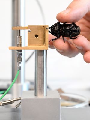 Forschung mit Biss22. Juni 2022 Auf dem Laptop sind die Bisskurven einer Gottesanbeterin zu erkennen, die mit dem forceX System gemessen wurden. Im Hintergrund Peter T. Rühr, der die Messung durchführt. Foto: © Volker Lannert/Uni Bonn Wie stark können Insekten zubeißen? Wer über einen kräftigen Kauapparat verfügt, kann härtere Nahrung zerkleinern und auch besser im Kampf gegen Feinde bestehen. Biologen der Universität Bonn stellen nun ein mobiles System (forceX) zur Messung der Beißkräfte von kleinen Tieren einschließlich der Auswertungs-Software (forceR) vor. Mithilfe des Systems wird es möglich nachzuvollziehen, wie Beißkräfte, zum Beispiel von Insekten, in Abhängigkeit von der Umwelt evolvierten. Die finale Fassung ist im Journal „Methods in Ecology and Evolution” veröffentlicht worden. Die Gottesanbeterin zappelt ein wenig in der Hand des Wissenschaftlers. Als sich das Insekt dem Sensor nähert, beißt es zur Abwehr auf die beiden Metallplättchen, die den Druck auf einen Piezokristall übertragen. Der Kristall erzeugt kraftabhängig eine Spannung, die über einen Verstärker auf ein Laptop übertragen wird. Auf dem Bildschirm entstehen Kurven, die teils steil ansteigen und zuckend ein Plateau erreichen, bevor sie wieder auf den Nullwert absinken. Manchmal sind Auf- und Abstieg auch flacher – je nachdem wie schnell sich das jeweilige Insekt der Maximalkraft beim Zubeißen annähert.Kaum Daten zur Beißkraft„Wie stark Insekten zubeißen können, dazu liegen kaum Daten vor”, berichtet Peter Rühr, Doktorand am Institut für Evolutionsbiologie und Ökologie der Universität Bonn. Mit ihrem Sensorsystem „forceX” wollen die Wissenschaftler untersuchen, wie sich Kiefer, Muskulatur und die Kopfform von Insekten evolutiv an die Herausforderungen ihrer jeweiligen Umgebung angepasst haben. „Nicht für jedes Insekt ist es vorteilhaft, stark zubeißen zu können, da hohe Beißkräfte auch mit höheren energetischen Kosten für das Tier einhergehen”, sagt Rühr. Die Beißkraft kann etwa davon abhängen, welche Nahrung ein Insekt zu sich nimmt oder ob es die Kiefer zur Verteidigung braucht.Das Team um Prof. Dr. Alexander Blanke, der einen Starting Grant des Europäischen Forschungsrats (ERC) eingeworben hat, entwickelte bestehende Systeme zur Messung von Beißkräften weiter. In der Messanordnung der Forscher der Universität Bonn dient ein Binokular – ähnlich einer starken Lupe – dazu zu erkennen, ob die Kiefer des zu untersuchenden Insekts an der richtigen Stelle mit den Metallplättchen des Aufbaus in Berührung kommen. Das untere Plättchen ist unbeweglich, während das obere über eine Wippe die Kraft auf den Sensor überträgt. Hirschkäfer (Lucanidae sp.), der auf die Metallplättchen des Sensors beißt. Foto: © Peter T. Rühr/Uni Bonn Flexible Anpassung an die Kiefergröße möglich„Je nach Größe und Öffnungswinkel der Kiefer verwenden wir unterschiedlich große Beiß-Plättchen, die sich austauschen lassen”, erläutert Rühr die Weiterentwicklung. „Damit lässt sich der Sensor über eine relativ große Spannweite auf die jeweiligen Erfordernisse der Tiere einstellen.” Das komplette System ist akkubetrieben und damit mobil für Messungen einsetzbar – auch in der „freien Wildbahn”.Für stechende Insekten nutzen die Wissenschaftler eine Halterung aus Kunststoff. In der Hülse verschwinden die Tiere vollständig, nur der Kopf mit den Mundwerkzeugen ragt vorne aus einem kleinen Loch heraus. Rühr: „Damit können wir die Insekten besser positionieren, ohne sie in der Hand halten zu müssen.” Meist lassen sich die Tiere nicht lange überreden, bis sie zubeißen. Sie fühlen sich in der fremden Umgebung unwohl und wehren sich mit Abwehrbissen. Bleibt dieses instinktive Verhalten aus, streichen ihnen die Forschenden mit einem zarten Pinsel über den Kopf – spätestens dann schließen die Insekten ihre Kiefer.Hohe Genauigkeit der MessungFür die Veröffentlichung in „Methods in Ecology and Evolution” haben die Forscher die Genauigkeit des Systems bestimmt: Hierfür beschwerten sie das bewegliche Metallplättchen mit unterschiedlichen Gewichten von einem Gramm bis fast einem Kilogramm. Insgesamt 1.600 Wiederholungen zeigen, dass die Abweichung zwischen den Messungen maximal 2,2 Prozent beträgt. „Das ist sehr exakt”, sagt Rühr. Mit dem System lassen sich etwa auch die Kräfte von Skorpions- oder Krebsscheren messen.Rühr und Blanke haben das System während ihrer Zeit an der Universität zu Köln unter anderem mit der dortigen Feinmechanikwerkstatt gebaut. An der Universität Bonn haben es beide weiter optimiert und die Genauigkeits-Messungen durchgeführt. Mit dazu gehört auch die Software „forceR”, mit der sich die Beißkraftwerte und die Form der Bisskurven detailliert auswerten und vergleichen lassen. Auf den Markt bringen wollen die Wissenschaftler das Beißkraftsensorsystem nicht. „Die in `Methods in Ecology and Evolution´ vorgestellten Ergebnisse stellen vielmehr die Grundlage für Nachbauten dar”, sagt Rühr. Wesentliche Teile des Sensors lassen sich nach dieser Vorlage sogar am 3D-Drucker nachbilden.