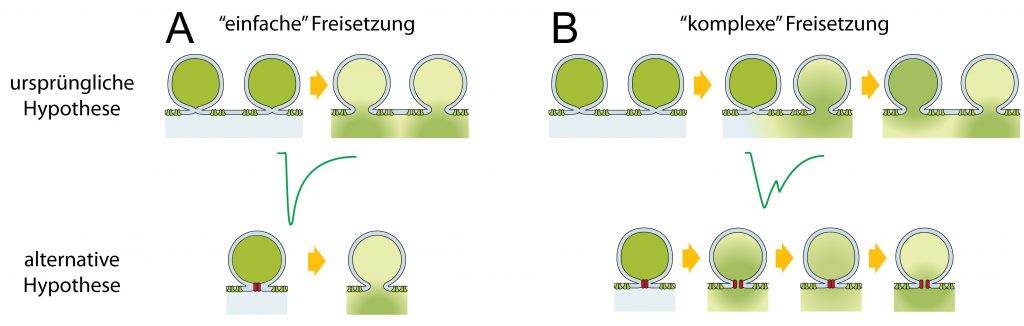 Fundamentale Frage der Informationsübertragung im Innenohr geklärt26. November 2018 Foto: © Jürgen Fälchle – Fotolia.com Göttinger Sinnesforscher entschlüsseln mittels höchstauflösender Elektrophysiologie das elementare Datenpaket der Informationsübertragung im Innenohr und weisen damit einzigartige Effizienz beim Hören nach. Göttinger Wissenschaftler sind dem Verständnis, wie der Mensch hört, einen wichtigen Schritt nähergekommen. Die Umwandlung von akustischer Information in ein Nervensignal erfolgt an den Bandsynapsen zwischen Haarsinneszellen und Hörnervenzellen im Innenohr. Dort wird Information über den Schall mittels Freisetzung synaptischer Vesikel weitergegeben, die mit Botenstoffen gefüllt sind. Anders als bisher angenommen, konnten die Göttinger Sinnesforscher nun nachweisen, dass bei der Umwandlung von akustischer Information in ein Nervensignal an der Haarzellsynapse im Innenohr überwiegend einzelne synaptische Vesikel freigesetzt werden. Damit ist das elementare Datenpaket der hochspezialisierten Haarzellsynapse grundsätzlich vergleichbar mit dem anderer Synapsen des Nervensystems. Die Forschungsergebnisse der Untersuchungen unter der Leitung von Prof. Tobias Moser, Direktor des Instituts für Auditorische Neurowissenschaften an der Universitätsmedizin Göttingen (UMG) und Sprecher des Sonderforschungsbereichs 889 „Zelluläre Mechanismen Sensorischer Verarbeitung“, und Dr. Chad Grabner in der Forschungsgruppe „Synaptische Nanophysiologie“ am Max-Planck-Institut für biophysikalische Chemie wurden im November in der renommierten Fachzeitschrift Proceedings of the National Academy of Sciences veröffentlicht. Einzigartige Effizienz des Hörvorgangs – Einzelne Vesikel reichen aus Die neuen Ergebnisse der Wissenschaftler deuten gleichzeitig auf eine einzigartige Effizienz des Hörvorgangs hin: Denn die Erkenntnisse legen nahe, dass es an der Haarzellsynapse bei moderatem Schall sogar ausreicht, nur ein einzelnes, mit dem Botenstoff Glutamat gefülltes synaptisches Vesikel freizusetzen, um in der Hörnervenzelle einen Nervenimpuls auszulösen. Bislang galt über zwei Jahrzehnte hinweg die Annahme, dass jedes Freisetzungsereignis im Mittel sechs synaptische Vesikel umfasst, die – über einen unbekannten Mechanismus koordiniert – gleichzeitig mit der Zellmembran verschmelzen (s. Bild). Dies beruhte unter anderem auf der Beobachtung, dass die durch Botenstoffe aktivierten Nervenzellen neben „einfachen“ (in der Abb. links) auch „komplexere“ Antworten von vergleichbarer Stärke zeigten (in der Abb. rechts), welche bisher durch leicht zeitversetzte Freisetzung mehrerer Vesikel erklärt wurden. Hypothesen zur Botenstofffreisetzung an der Haarzellsynapse. A: ursprüngliche Hypothese. B: alternative Hypothese. Quelle: Dr. Jakob Neef Damit wird klar, dass einzelne Vesikel ausreichen, um in der Hörnervenzelle einen Nervenimpuls auszulösen. Daran zeigt sich, dass die Hörnervenzelle extrem empfindlich für Glutamat ist, dessen Freisetzung sehr effizient genutzt wird. Diese hohe Effizienz hat aber nach Einschätzung der Forscher auch ihren Preis: Zu lauter Schall kann diese empfindliche Zelle durch Glutamat-Übererregung unwiederbringlich schädigen. Im Jahr 2014 hatten Göttinger Wissenschaftler des Sonderforschungsbereichs (SFB) 889 und des Bernstein Zentrums für Theoretische Neurowissenschaften auf der Grundlage von Experimenten und Computer-Simulationen erstmals Zweifel an der Annahme von sechs Vesikeln als kleinstmögliches Signal angemeldet und eine alternative Hypothese vorgestellt: die statisch-unabhängige Freisetzung einzelner synaptischer Vesikel. Hier würden die „komplexen“ Antworten durch ein schnelles Öffnen und Schließen einer kleinen Pore entstehen, durch welche das Vesikel seine Botenstoffe ausschüttet. Nanophysiologie erlaubt Analyser kleinster Funktionseinheiten von Zellen Der resultierende wissenschaftliche Dissens erforderte dringend weitere Untersuchungen. Diese sollten idealerweise unabhängig von der Ableitung von Hörnervenzellen sein und die Freisetzung von Botenstoffen direkt an der Haarzelle untersuchen. Ein besonders geeigneter Zugang bestand in der höchstauflösenden Messung der Kapazität der Zellmembran, die als „Nanophysiologie“ die Verschmelzung einzelner synaptischer Vesikel auflösen kann. Dr. Chad Grabner und Prof. Tobias Moser nutzten dieses in Göttingen von Nobelpreis-träger Prof. Erwin Neher und Prof. Manfred Lindau entwickelte Messverfahren, um ihre Hypothese zu überprüfen. Für die Anwendung auf die Haarzellsynapse mussten sie diesen Messaufbau aufwändig optimieren. Es gelang ihnen, durch elektrische Vermessung der Membranoberfläche nachzuweisen, dass sich diese tatsächlich durch die Verschmelzung einzelner synaptischer Vesikel mit der Zellmembran vergrößert. Bisher war mit Kapazitätsmessungen von der gesamten Haarzelle nur die Verschmelzung hunderter solcher Vesikel nachweisbar, da jedes Vesikel während der Botenstoff-Freisetzung die ohnehin schon winzige Oberfläche der Zelle um weniger als ein 1/2.000.000 (ca. 40 x 10-18 Farad) erweitert. „Es war sehr aufwändig, die Messempfindlichkeit auf das erforderliche Niveau zu bringen, aber es hat sich gelohnt“, sagt Dr. Chad Grabner, Erstautor der Studie. „Die Ergebnisse legen die statisch-unabhängige Freisetzung einzelner synaptischer Vesikel an der Synapse nahe und brechen so mit dem aktuellen Dogma.“ Bedeutung für das Verständnis des Hörens „Das Hochleistungssystem der Haarzellsynapse ist auf Effizienz getrimmt. Die Möglichkeit, dass ein einzelnes von der Haarzelle freigesetztes synaptisches Vesikel ausreicht, einen Nervenimpuls in der Hörnervenzelle auszulösen, ist faszinierend. Eine solche Effizienz ist unseres Wissens nach bislang einzigartig in der Natur“, sagt Seniorautor Prof. Tobias Moser, Max Planck Fellow und designierter Sprecher des Göttinger Exzellenzclusters „Multiscale Bioimaging: From Molecular