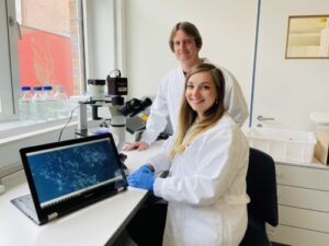 Für die Zusammensetzung des Darmmikrobioms wichtiger Enzymkomplex näher beleuchtet3. April 2023 Die proteolytische Spaltung von Galectin-3 durch Meprin-α/β im Darm wird durch das Mikrobiom reguliert (A), moduliert aber andererseits auch die Zusammensetzung des Mikrobioms (B). Dieses proteolytische Ereignis spielt eine wichtige Rolle bei der bakteriellen Agglutination (C) und ist mit entzündlichen Prozessen (D) assoziiert. Daher ist die Spaltung von Galectin-3 durch den Meprin-α/β-Enzymkomplex entscheidend für die Homöostase des Wirtsmikrobioms. (Abbildung: © Cynthia Bülck, Biochemisches Institut, CAU; Abbildung erstellt mit BioRender) In einer aktuellen Veröffentlichung zeigen Forschende des Exzellenzclusters „Precision Medicine in Chronic Inflammation“ (PMI), wie ein Enzymkomplex in Darmzellen die Besiedlung mit Mikroorganismen reguliert. Das Mikrobiom des Darms wirkt sich nachweislich auf den Stoffwechsel und das Immunsystem des Menschen aus. Wie ein gesundes Mikrobiom im Zusammenspiel mit dem Wirt reguliert wird und wie sich Fehlbesiedlungen mit krankmachenden Keimen verhindern lassen, ist bisher immer noch nicht richtig verstanden. Einen wichtigen Mechanismus für die Beeinflussung des Darmmikrobioms hat ein Forschungsteam um Prof. Christoph Becker-Pauly vom Biochemischen Institut der Christian-Albrechts-Universität zu Kiel (CAU) in Kooperation mit anderen Arbeitsgruppen im Mausmodell aufgeklärt. Die Ergebnisse sind jetzt in der Fachzeitschrift „Science Advances“ erschienen. „Wir konnten erstmals zeigen, dass ein Komplex der Enzyme Meprin α und Meprin β lokalisiert auf den Darmzellen durch Umsetzung des Substrates Galektin-3 die Zusammensetzung des Mikrobioms beeinflusst“, erklärt Erstautorin Cynthia Bülck, Doktorandin am Biochemischen Institut der CAU. „Dieser Enzymkomplex wird in seiner Aktivität wiederum durch das Mikrobiom direkt beeinflusst“, ergänzt Becker-Pauly, Mitglied des Exzellenzclusters PMI und Leiter der Arbeitsgruppe Proteolytische Netzwerke. „Das heißt, das Mikrobiom beeinflusst Wirtsproteine, die wiederum das Mikrobiom beeinflussen.“ Dieses Wechselspiel der Regulation des Enzymkomplexes haben die Forschenden in Mausmodellen mit unterschiedlicher Bakterienbesiedlung untersucht. Enzymatische Spaltung beeinflusst Bindung an Bakterien Im Zentrum der Forschung standen die proteinspaltenden Enzyme Meprin α und Meprin β, die im gesunden Darm produziert werden und bei Chronisch-entzündlichen Darmerkrankungen (CED) deutlich vermindert sind. „Wir wollten einerseits die Funktion der Meprine im Dünn- und Dickdarm aufklären und andererseits verstehen, wie die Zusammensetzung der Bakterien im Darm grundlegend reguliert wird“, sagt Bülck. Die Proteasen kommen im gesamten Darm vor, sind aber keine typischen Verdauungsenzyme. „Bereits in früheren Studien konnten wir zeigen, dass diese Enzyme für die ständige Ablösung und Erneuerung der Darmepithel-schützenden Schleimschicht verantwortlich sind“, so Becker-Pauly. Um die weiteren Funktionen der Meprine aufzuklären, die im Dickdarm als Meprin α/β-Komplex vorkommen, haben die Forschenden zunächst mittels eines Massenspektrometrie-Verfahrens nach Substraten gesucht, die von diesem Enzymkomplex umgesetzt werden. Becker-Pauly: „Wir haben Galektin-3 als wichtiges Substrat im Dickdarm identifiziert.“ Doktorandin Cynthia Bülck (vorn) und Christoph Becker-Pauly vom Biochemischen Institut der CAU haben einen wichtigen Mechanismus aufgeklärt, über den die Zusammensetzung des Darmmikrobioms reguliert wird. (Foto: © Kira Bickenbach, Biochemisches Institut, CAU) Galektin-3 wird permanent in den Darmzotten produziert. Es befindet sich in den Zellen aber auch außerhalb der Zelle in der Schleimschicht und kann dort mit Bakterien interagieren, diese zum Beispiel verklumpen (agglutinieren). Die proteolytische Spaltung von Galektin-3 durch Meprin α/β führte zu veränderten Eigenschaften der Bakterienbindung und gleichzeitig verändert sich die enzymatische Verarbeitung in Abhängigkeit von der bakteriellen Zusammensetzung. „Das heißt, je nachdem welche und wie viele Bakterien vorhanden sind, hat auch einen Einfluss darauf wie viel Galektin-3 prozessiert und exprimiert wird“, verdeutlicht Bülck. „Der Wirt reagiert über die Spaltung von Galektin-3 auf das Mikrobiom, welches dann wieder anders moduliert wird.“ In der Arbeit konnte außerdem gezeigt werden, dass die enzymatische Spaltung von Galektin-3 zu einer starken Agglutination und Eliminierung des Krankheitserregers Pseudomonas aeruginosa führt. Schlüsselrolle bei der Homöostase des Mikrobioms „Das Verständnis über die physiologische Rolle dieses Enzymkomplexes im Darm könnte neue Einblicke in die Entstehung von Krankheiten liefern sowie neue Wege zur Vorbeugung und Behandlung von Darmerkrankungen aufzeigen“, betont Becker-Pauly. Bei CED liege nicht nur der Enzymkomplex vermindert vor, auch vom Substrat, also Galektin-3, sei weniger vorhanden. „Dadurch wird möglicherweise das Darmmikrobiom aus dem Gleichgewicht gebracht, so dass pathogene Keime sich leichter ausbreiten können“, vermutet der Kieler Biochemiker. Diese Konstellation sei sicher nicht ausschlaggebend für die Entstehung chronisch-entzündliche Darmerkrankungen, da hier viele Faktoren eine Rolle spielten, aber es sollte bedacht werden. In weiteren Forschungen wird es jetzt darum gehen, die Mechanismen detailliert aufzuklären, die zur Verklumpung bestimmter Bakterienarten führen. Außerdem wurden weitere immunmodulatorische Substrate des Meprin α/β-Komplexes identifiziert, deren Funktion nun analysiert werden sollen.