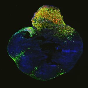 Gehirntumore aus der Petrischale31. Juli 2018 Künstlerische Interpretation neoplastischer Organoide, an denen sich untersuchen lässt, wie bestimmte Mutationen die Tumorentstehung beeinflussen. (© BeataScienceArt) Forscher des Instituts für Molekulare Biotechnologie der Österreichischen Akademie der Wissenschaften (IMBA) haben ein neuartiges Modellsystem für Hirntumoren entwickelt, um die Wirkung von Krebsgenen gezielt zu erforschen und Krebs-Medikamente zu testen. Gehirntumoren werden durch eine Vielzahl verschiedener Mutationen in Kombination mit äußeren Faktoren ausgelöst. In den letzten Jahren haben riesige Krebsgenom-Sequenzierungsprojekte Tausende von Mutationen katalogisiert, die in Patiententumoren gefunden wurden. Bis dato fehlte allerdings ein geeignetes Modell, um die Wirkung dieser Mutationen im menschlichen Gehirn zu erforschen. Die Forschungsgruppe um Jürgen Knoblich hat nun ein neues Modellsystem für Hirntumoren entwickelt. Das Novum: Die neue Technologie erlaubt es den Forschern, den Prozess der Krebsentstehung im Gehirn nun in der Petrischale nachzuspielen. Die Forsche können dadurch praktisch dabei zusehen, wie dem Organoid ein Tumor wächst. Neues Modellsystem für die Krebsforschung “Diese kleinen Organoide reproduzieren einzigartige Aspekte des menschlichen Gehirns detailgetreu, wie seine verschiedenen Zelltypen und Entwicklungsstadien. Sie erlauben uns daher, die Art und Weise, wie Tumoren entstehen, nachzuvollziehen und bieten ein System, um neue Therapien zu erproben,“ so Knoblich, Interimistischer Wissenschaftlicher Direktor am IMBA. Neoplastisches Gehirn-Organoid mit GFP-positiven Tumorregionen (grün), das eine Glioblastom-ähnliche Zellularität aufweist. (© IMBA) Mutationen sind genetischen Defekte, die durch natürliche Fehler beim Kopieren von DNA oder durch die Aktivität von Krebsgenen entstehen oder andere Ursachen haben. Sie lösen bei gesunden Zellen schwerwiegende Veränderungen aus, die dazu führen, dass sie außer Kontrolle geraten und sich erstaunlich schnell teilen. Doch jedes Mal, wenn sich eine solche Zelle teilt, kann sie neue Mutationen erzeugen, was die WissenschaftlerInnen vor ein Rätsel stellt. “Einige dieser Mutationen sind Triebkräfte in Tumoren, sie entscheiden, ob Krebs entstehen wird”, sagt Shan Bian, Erstautor der Studie, “andere sind einfach Nebenwirkungen. Diese unterschiedlichen Mutationen in menschlichem Gewebe gezielt zu erfassen, war bis dato ein Problem.” Mutationen kartieren und Medikamente testen Mithilfe moderner Genom-Editing Systeme wie etwa CRISPR / Cas9 und sogenannter Sleeping Beauty Transposons wollen die Wissenschaftler bestimmte Mutationen genau unter die Lupe nehmen, um festzustellen, ob der jeweilige Gendefekt auch für das langfristige Überleben des Tumors essenziell ist. Denn jede genetische Veränderung, die dazu führt, dass der Tumor schrumpft oder verschwindet, könnte ein guter Kandidat für zukünftige Therapien sein. Die Wissenschaftler haben dieses Prinzip bereits mit einem Medikament namens Afatinib getestet, das derzeit in klinischen Studien zur Behandlung von Glioblastomen eingesetzt wird. Sie fanden heraus, dass nach 40 Tagen Verabreichung des Medikaments die Anzahl der Tumorzellen in jenen zwei Mutationskombinationen signifikant zurückging, in denen ein Molekül namens EGFR überexprimiert wird – denn Afatinib hemmt EGFR. Die Forscher wiederholten das Experiment mit vier zusätzlichen Wirkstoffen, die EGFR hemmen und derzeit in Therapien zum Einsatz kommen. Während ein Medikament namens Erlotinib die Anzahl der Tumorzellen signifikant reduzierte, waren die Effekte anderer Wirkstoffe minimal. “Diese Ergebnisse zeigen, dass Gehirn-Organoide auch einen erheblichen Nutzen für die Krebsforschung beziehungsweise die öffentliche Gesundheit haben. Vor allem, weil es nun möglich ist, Organoide von Patienten mit Gehirntumoren herzustellen und daran die Wirksamkeit verschiedener Therapie-Kombinationen zu testen”, sagte Knoblich. „Nun wäre es ein wichtiger Schritt, weitere klinische Partnerschaften zu fördern. Wir sind davon überzeugt, dass unsere Modelle in Zukunft Anhaltspunkte für die klinische Behandlung von Hirntumoren liefern könnten.“ Originalpublikation: Bian S et al.: Genetically engineered cerebral organoids model brain tumor formation. Nature Methods, 23. Juli 2018