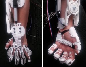 Gelähmte Hand wird durch Exoskelett wieder funktionsfähig6. Februar 2019 An der Universität Stuttgart wurde ein Hand-Exoskelett entwickelt, mit welchem die Greif-Fähigkeit einer gelähmten Hand wiederhergestellt werden kann. Foto: Universität Stuttgart Mit einem neu entwickelten Hand-Exoskelett können Patienten ihre gelähmte Hand wieder bewegen. Das Exoskelett besteht aus einem zentralen Montagemodul sowie einzelnen, beweglichen Fingermodulen. Im Vergleich zu bereits bestehenden Hand-Exoskeletten hat das an der Universität Stuttgart entwickelte Modell entscheidende Vorteile: Zum einen können die Module individuell für jeden Patienten ausgestaltet und vor allem die Fingermodule sehr flexibel gestaltet werden. Damit erhält der Patient auch die Möglichkeit, seine Hand zu spreizen und seitlich zu bewegen und einzelne Finger zu bewegen. Greifen, Halten, Öffnen und Schließen – die Funktionen einer menschlichen Hand sind ein komplexes Zusammenspiel aus Muskeln, Knochen und Nervenfasern. Durch Erkrankungen wie Muskelschwäche, Spastik oder motorische Defizite kann die Funktionalität der Hand gestört sein. An der Universität Stuttgart wurde nun ein Hand-Exoskelett entwickelt, mit welchem die Greif-Fähigkeit einer gelähmten Hand wiederhergestellt werden kann. Nach Hirn- oder Rückenmarksverletzungen können Beeinträchtigungen wie Verlust der Muskelkraft, Apraxien oder Ataxien, Spastik oder Lähmungen der Hand auftreten. Durch die Einschränkungen im beruflichen und privaten Bereich ist dies für die Betroffenen ein großer Verlust an Lebensqualität. Forscher des Instituts für Industrielle Fertigung und Fabrikbetrieb (IFF) der Universität Stuttgart haben nun ein Hand-Exoskelett entwickelt, das aus einem zentralen Montagemodul sowie einzelnen, beweglichen Fingermodulen besteht. Im Vergleich zu bereits bestehenden Hand-Exoskeletten hat das in Stuttgart entwickelte Modell entscheidende Vorteile: Zum einen können die Module individuell für jeden Patienten ausgestaltet und vor allem die Fingermodule sehr flexibel gestaltet werden. Damit erhält der Patient auch die Möglichkeit, seine Hand zu spreizen und seitlich zu bewegen und einzelne Finger zu bewegen. Zum anderen ist durch diese Art der Ausgestaltung das Exoskelett leichter zu handhaben und die Patienten können es selbstständig anlegen. Durch das offene Schalensystem können die Patienten sich die Module einzeln an die Hand anstecken, wie Erfinder Jonathan Eckstein erläutert, der als wissenschaftlicher Mitarbeiter im Bereich Antriebssysteme und Exoskelette am IFF arbeitet. Die einzelnen Module werden angesteckt und können dann per Motor gestreckt oder gebeugt werden. Das neu entwickelte Hand-Exoskelett wird aus einem speziellen Kunststoff hergestellt. Dadurch ist es möglich, die einzelnen Module mit einer geringen Wandstärke zu fertigen, was vor allem bei den Fingermodulen wichtig ist. Das Exoskelett wiegt mit Motoren und Elektronik ungefähr 400 Gramm – das Handmodul wiegt ca. 80 Gramm. Damit ist es sehr leicht, gleichzeitig stabil und damit tragbar. Ein nächster Schritt im Projekt wird die Steuerung des Hand-Exoskeletts sein, wie Jonathan Eckstein erklärt. Derzeit ist das Modul als eigenständiges, am Unterarm tragbares Gerät mit EMG- und Abstandssensoren verbunden, um zunächst die elektromechanische Funktionalität des Exoskeletts zu evaluieren. Eckstein: „Das Exoskelett soll in der kommenden Entwicklungsphase zusätzlich mit Hirnströmen gesteuert werden, die beispielsweise mit Augenbewegungen kombiniert werden.“ Dies erforschen die Projektpartner der Uniklinik Tübingen und der Universität Tübingen, während die Wissenschaftler der Hochschule Reutlingen an der 3D-Objekterkennung arbeiten, um alltägliche Gegenstände erkennen zu können und das Handexoskelett entsprechend des benötigten Griffmodus voreinzustellen. Die Erfindung ist im Rahmen des Projektes „KONSENS NHE“ (Neurorobotik) entstanden. Dieses von der Baden-Württemberg Stiftung geförderte Forschungsprojekt unter der Leitung von Dr. med. Surjo Soekadar hat zum Ziel, ein Hand-Exoskelett für Schlaganfallpatienten zu entwickeln. Bereits seit April 2017 arbeiten Wissenschaftler der Universitätsklinik Tübingen, der Universitäten Tübingen und Stuttgart sowie der Hochschule Reutlingen zusammen. Langfristiges Ziel des Projekts ist, dass Patienten das System selbstständig im Alltag nutzen können. Die Wissenschaftler forschen zu den einzelnen Projektbausteinen Neurotechnologie, Mechatronik, Sensortechnik und -steuerung, Machine Learning sowie 3D-Objekterkennung und bauen auf den Erfahrungen auf, die bereits im Jahr 2016 mit einem Prototyp eines hirngesteuerten Exoskeletts gemacht wurden. Die Erfindung wurde patentrechtlich geschützt. Das deutsche Patent wurde erteilt. Die Technologie-Lizenz-Büro (TLB) GmbH unterstützt die Universität Stuttgart und die Baden-Württemberg Stiftung bei der Patentierung und Vermarktung der Innovation. TLB ist im Auftrag der Universität mit der weltweiten wirtschaftlichen Umsetzung dieser zukunftsweisenden Technologie beauftragt und bietet Unternehmen Möglichkeiten der Zusammenarbeit und Lizenzierung der Schutzrechte.
