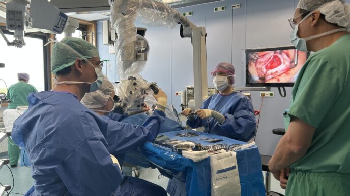Gentherapie: Hoffnung für gehörlose Kinder12. Mai 2025 Für die Gentherapie wird mithilfe eines Vektors eine gesunde Kopie des OTOF-Gens chirurgisch direkt in die Cochlea eingebracht. (Foto: © Universitätsklinikum Tübingen) An der Klinik für Hals-, Nasen- und Ohrenheilkunde des Universitätsklinikums Tübingen wurde im Rahmen einer klinischen Studie die in Deutschland erste gentherapeutische Behandlung eines Kindes durchgeführt, das aufgrund einer Mutation im Otoferlin-Gen nicht hören kann. Bis zu 80 Prozent aller Fälle von Schwerhörigkeit bei Neugeborenen und Kindern vor dem Spracherwerb sind genetisch bedingt. Unter diesen genetisch bedingten Fällen sind etwa ein bis acht Prozent auf krankheitsverursachende Mutationen im Otoferlin-Gen (OTOF) zurückzuführen. Kinder mit dieser seltenen Erkrankung sind meist von Geburt an beidseitig hochgradig schwerhörig oder gehörlos. Mutationen im OTOF-Gen können bewirken, dass die Cochlea den Schall zwar aufnimmt, aber die Signale nicht an den Hörnerv weiterleiten kann. Bisher erhalten betroffene Kinder Cochlea-Implantate, die bei hochgradiger Schwerhörigkeit oder Gehörlosigkeit in einem chirurgischen Eingriff eingesetzt werden und über eine in die Cochlea eingeführte Elektrode den Hörnerv stimulieren. Für viele betroffene Kinder sind die Implantate eine lebensverändernde und sehr effektive Lösung. Cochlea-Implantate sind auch für andere Formen des Hörverlusts anwendbar – und werden weiterhin die derzeit bestmögliche Therapie für diejenigen Kinder sein, die aus verschiedenen Gründen nicht für die klinische Gentherapiestudie in Frage kommen. Der Eingriff, der im April 2025 von Prof. Hubert Löwenheim, Ärztlicher Direktor der Universitätsklinik für Hals-, Nasen- und Ohrenheilkunde, durchgeführt wurde, ist möglicherweise der Beginn eines neuen medizinischen Ansatzes zur ursächlichen Behandlung genetisch bedingter Schwerhörigkeit. Die Gentherapie zielt darauf ab, das natürliche Gehör auf molekularer Ebene wiederherzustellen. Wie funktioniert die Gentherapie? Mithilfe eines Vektors wird eine gesunde Kopie des OTOF-Gens chirurgisch direkt in die Cochlea eingebracht. Hierdurch kann das Innenohr eventuell Signale an den Hörnerv wieder übertragen, der ursächliche Defekt wird behoben. „Die erfolgreiche Einführung der Gentherapie bei genetischem Hörverlust könnte eine völlig neue medizinische Perspektive für die Herstellung des Hörvermögens eröffnen. Wir treten in die Ära der ‚Molekularen Otologie‘ ein, in der wir die etablierten mechanischen und elektrischen Lösungen durch eine molekulare Behandlungsmethode ergänzen. Wir versuchen, an der genetischen Ursache der Erkrankung anzusetzen“, erklärt Löwenheim. Internationale Studie zeigt vielversprechende Ergebnisse Der Eingriff wurde im Rahmen der internationalen klinischen Studie CHORD (Clinical trial of Hearing Restoration with Otoferlin gene Delivery) durchgeführt, die von dem US-Unternehmen Regeneron Pharmaceuticals, Inc. in Tarrytown im Bundesstaat New York gesponsert wird und im Mai 2023 gestartet ist. Die Studie untersucht den Einsatz der experimentellen Gentherapie DB-OTO zur Behandlung von Hörverlusten, die durch krankheitsverursachende Veränderungen im Otoferlin-Gen verursacht werden. Eingeschlossen werden Kinder im Alter von 0 bis 17 Jahren in vier Ländern (Deutschland, Vereinigtes Königreich, Spanien, USA). Bisher wurde die Sicherheit und Wirksamkeit dieser Versuchstherapie noch von keiner Zulassungsbehörde bewertet. Erste Ergebnisse sind allerdings vielversprechend: Regeneron berichtete im Februar 2025, dass zehn von elf Teilnehmenden der CHORD-Studie nach der Behandlung mit DB-OTO zum Teil deutliche Verbesserungen des Hörvermögens zeigten. Besonders erwähnenswert ist ein Fall an einem Klinikum im Vereinigten Königreich, bei dem ein zehn Monate altes Kind nach der Gentherapie innerhalb von sechs Wochen deutliche Verbesserungen des Hörvermögens zeigte. 24 Wochen nach der Behandlung konnte es auf leise Töne und Sprache reagieren, was das Potenzial von DB-OTO zur Wiederherstellung des Hörvermögens bei Kindern mit OTOF-bedingter Taubheit belegt. Wie sich das Hörvermögen des Patienten am Uniklinikum Tübingen in den nächsten Wochen und Monaten entwickeln wird, überprüfen die Mediziner in strukturierten Nachuntersuchungen. Um umfassende Daten über die Wirksamkeit und Sicherheit der Therapie zu sammeln, werden in den kommenden Monaten weitere Teilnehmende in mehreren Ländern in die Studie eingeschlossen. Der potenzielle Erfolg der Gentherapie bei der Behandlung von OTOF-bedingter Schwerhörigkeit ebnet den Forschenden zufolge zudem den Weg für ähnliche Ansätze, die auf andere genetische Ursachen von Hörverlust abzielen. „Ähnlich wie die Cochlea-Implantation sollten Gentherapien für angeborene Schwerhörigkeit oder Taubheit möglichst früh im Leben der betroffenen Kinder durchgeführt werden. Deshalb ist es wichtig, Kinder mit Auffälligkeiten in diesem Bereich möglichst früh genetisch zu untersuchen, um eine spezifische Ursache feststellen zu können. Nur so kann sich das Gebiet der Molekulare Otologie wirklich weiterentwickeln“, betont Löwenheim. Hoffnung für Menschen mit seltenen Erkrankungen „Dieser Fortschritt bringt nicht nur Hoffnung für Menschen mit angeborenem Hörverlust, sondern ist auch wissenschaftlich ein Modell dafür, was bei einer Vielzahl seltener Erkrankungen erreicht werden kann. Wir freuen uns sehr, dass das Zentrum für Seltene Hörerkrankungen den Rahmen für die Entwicklung von klinischer Expertise, Patientenbetreuung und langfristigem Engagement für Innovation und Interdisziplinarität geschaffen hat, um diesen neuen gentherapeutischen Ansatz in einer klinischen Studie untersuchen zu können“, erklärt Prof. Hendrik Rosewich, Sprecher des Zentrums für Seltene Erkrankungen am Universitätsklinikum Tübingen und Direktor der Klinik für Kinder- und Jugendmedizin, Abteilung III. Se