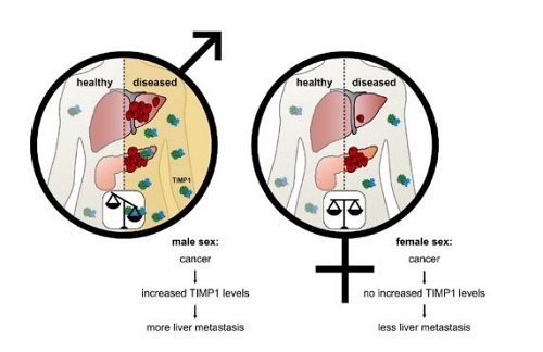 Geschlechtsspezifisch höheres Sterberisiko: TIMP1 als Ursache für schwereren Verlauf von Krebs bei Männern6. Oktober 2021 Das Forschungsteam vom Institut für Experimentelle Onkologie und Therapieforschung am Klinikum rechts der Isar der TUM mit einem TIMP1-Modell: Chris Hermann, Achim Krüger, Benjamin Schoeps, Celina Eckfeld, Daniel Häußler (v.l.n.r.) Foto: © Thomas Einberger / TUM Auffällig viele lebensbedrohliche Krankheiten verlaufen bei Männern schwerer als bei Frauen. Ein aktuelles Beispiel dafür ist die durch SARS-CoV-2 verursachte COVID-19-Erkrankung. Aber auch bei Krebserkrankungen tragen Männer ein deutlich höheres Risiko für einen schweren Verlauf. Eine molekulare Ursache für diesen Unterschied zwischen den Geschlechtern hat nun ein hat Forschungsteam der Technischen Universität München (TUM) im Rahmen eines von der Wilhelm Sander-Stiftung geförderten Forschungsprojektes entdeckt. Männer haben gegenüber Frauen ein auffällig erhöhtes Risiko für einen schweren Krankheitsverlauf von lebensbedrohenden Krankheiten wie etwa Krebs. So versterben in Deutschland jährlich über 130.000 Patienten, aber nur etwa 100.000 Patientinnen an Krebserkrankungen.Umfangreiche epidemiologische Studien der letzten Jahre ergaben, dass das erhöhte Risiko von Männern für schwere Verläufe einer Krebskrankheit keineswegs allein auf einen riskanteren Lebensstil beispielsweise durch deren im Mittel höheren Tabak- bzw. Alkoholkonsum zurückzuführen ist.Deshalb müssen auch Lebensstil-unabhängige Faktoren eine Rolle spielen. Umso wichtiger ist es, Parameter zu identifizieren, die so ein geschlechtsabhängiges Fortschreiten der Krankheit verursachen, und daraus geeignete Schlüsse für die Behandlung von Patienten zu ziehen.Ein Protein als UrsacheEin Forschungsteam um Prof. Achim Krüger vom Institut für Experimentelle Onkologie und Therapieforschung am Klinikum rechts der Isar der Technischen Universität München (TUM) hat nun in einem von der Wilhelm Sander-Stiftung geförderten Forschungsprojekt einen Faktor gefunden, der diesen Geschlechterunterschied erklären und zudem auch die Risikodiagnostik für den klinischen Verlauf verbessern könnte. Auf der Basis von Patientenkohorten aus Deutschland und Kanada fand das Forschungsteam heraus, dass Männer, deren Blut eine erhöhte Konzentration des körpereigenen Proteins TIMP1 aufweist, ein deutlich erhöhtes Risiko haben, an Krebs zu versterben.Weitergehende Analysen zeigten, dass der Anstieg von TIMP1 eine Verstärkung der Lebermetastasierung zur Folge hat, die bei Bauchspeicheldrüsenkrebs, Darmkrebs und beim Melanom zum Tode führt.Erhöhter Wert zeigt hohes Risiko„TIMP1 ist nicht bei allen Männern erhöht, aber die Entdeckung von TIMP1 als im Blut nachweisbaren Risikoparameter ermöglicht es der Klinik nun, diejenige Gruppe von Männern mit einem hohen Risiko für die Bildung lebensbedrohlicher Lebermetastasen zu identifizieren“, so Krüger.„Aus früheren Studien kennen wir bereits die molekularen Zusammenhänge, wie TIMP1 die Lebermetastasierung fördert“, ergänzt Krüger. „In Verbindung mit unserer aktuellen Entdeckung bieten sich jetzt neue Möglichkeiten für eine personalisierte Medizin mit optimierten Diagnose- und zielgerichteten Therapieoptionen.“ Bildquelle: © 2021 Hermann et al. Originally published in the “Journal of Experimental Medicine” https://doi.org/10.1084/jem.20210911 Die Ergebnisse des Münchener Forschungsteams wurden jüngst im “Journal of Experimental Medicine” veröffentlicht.Im nächsten Schritt möchte Krüger mit seiner Arbeitsgruppe auch den molekularen Ursachen der männerspezifisch veränderten Bildung von TIMP1 weiter auf den Grund gehen.Ergänzung zur schematischen Abbildung:Das Schema zeigt den Unterschied der TIMP1-Spiegel zwischen den Geschlechtern und die Folgen beim Krankheitsverlauf: Bei Personen männlichen Geschlechts (links) sind bei Gesunden die TIMP1-Spiegel relativ niedrig und steigen bei Patienten, die ein hohes Verlaufsrisiko haben stark an. Bei Personen weiblichen Geschlechts (rechts) liegen bei Gesunden höhere TIMP1-Spiegel vor, die im Fall der Krebskrankheit nicht weiter ansteigen. Der männerspezifische Anstieg verursacht ein deutlich höheres Risiko, sowohl für die Metastasierung des Tumors in die Leber als auch für das frühere Versterben.Wilhelm Sander-Stiftung: Partner innovativer KrebsforschungDie Wilhelm Sander-Stiftung hat das Forschungsprojekt in zwei Förderphasen mit insgesamt rund 400.000 Euro unterstützt. Stiftungszweck ist die Förderung der medizinischen Forschung, insbesondere von Projekten im Rahmen der Krebsbekämpfung. Seit Gründung der Stiftung wurden insgesamt über 250 Millionen Euro für die Forschungsförderung in Deutschland und der Schweiz ausbezahlt. Damit ist die Wilhelm Sander-Stiftung eine der bedeutendsten privaten Forschungsstiftungen im deutschen Raum. Sie ging aus dem Nachlass des gleichnamigen Unternehmers hervor, der 1973 verstorben ist. Publikation: Hermann CD, Schoeps B, Eckfeld C, Munkhbaatar E, Kniep L, Prokopchuk O, Wirges N, Steiger K, Häußler D, Knolle P, Poulton E, Khokha R, Grünwald BT, Demir IE, Krüger A. TIMP1 expression underlies sex disparity in liver metastasis and survival in pancreatic cancer. J Exp Med. 2021 Nov 1;218(11):e20210911. doi: 10.1084/jem.20210911. Epub 2021 Sep 17. PMID: 34533565. https://doi.org/10.1084/jem.20210911