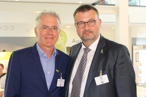 Herz der VSOU-Kongresspräsidenten schlägt für die Ukraine28. April 2022 Prof. Reinhard Hoffmann spendet für die Ukraine, neben ihm Kongresspräsident Dr. Johannes Flechtenmacher. (Foto: hr, Biermann Medizin) Dr. Johannes Flechtenmacher und Prof. Mario Perl setzen sich für die Menschen der Ukraine sicht- und hörbar bei der VSOU-Tagung ein – mit Aufrufen zu Spenden und kurzfristig ins Programm aufgenommenen Vorträgen und Podiumsdiskussionen. Der Krieg in der Ukraine ist auf der diesjährigen VSOU-Tagung präsent. Eine Spendenstand mit der Hilfsorganisation „Ärzte ohne Grenzen“ in der Industrieausstellung und auch eine eigens eingerichtete Highlight-Veranstaltung „Ukraine“ mit Podiumsdiskussion (ein ausführlicher Bericht folgt in der Juni/Juli-Ausgabe der Orthopädischen-Unfallchirurgischen Nachrichten) finden sich in der Industrieausstellung und dem Programm. Fundierte Berichte über die Verletzungen und die Versorgungslage von kriegsschwerstverletzten Menschen aus der Ukraine wie vom incoming DKOU-Kongresspräsidenten für die DGU, Oberstarzt Prof. Benedikt Friemert (Bundeswehrkrankenhaus Ulm), beleuchten den Ernst der Lage und die neuen Herausforderungen vor denen das deutsche Gesundheitssystem mit der Versorgung und Rehabilitation dieser Personengruppe steht. Zeigen ihre Solidarität mit der Ukraine: Johannes Flechtenmacher (l.) und Mario Perl mit den Ukraineschleifen am Revers (Foto: hr, Biermann Medizin) Die Kongresspräsidenten betonten in verschiedenen Veranstaltungen ihre Empathie mit dem ukrainischen Volk und riefen zur (erneuten) Spende am Stand von „Ärzte ohne Grenzen“ in der Industrieausstellung auf. „Wir wollen damit einen kleinen Beitrag zur Solidarität und Situation in der Ukraine leisten“, erklärte Perl. „Das Thema ist uns sehr wichtig und es bedrückt uns. Wir können den Krieg nicht verstehen und wir sind bei den Menschen“, sagte Flechtenmacher und hielt ein flammendes Plädoyer dafür, den Mindesteinsatz von 50 Euro zu spenden: „Ein Fuffy geht immer – auch wenn Sie schon gespendet haben!“ Spenderinnen und Spender erhalten am Stand von „Ärzte ohne Grenzen“ als sichtbares Zeichen eine kleine Schleife zum Anstecken in den blau-gelben Nationalfarben der Ukraine in Form der bekannten Solidaritäts-Aidsschleife. (hr)