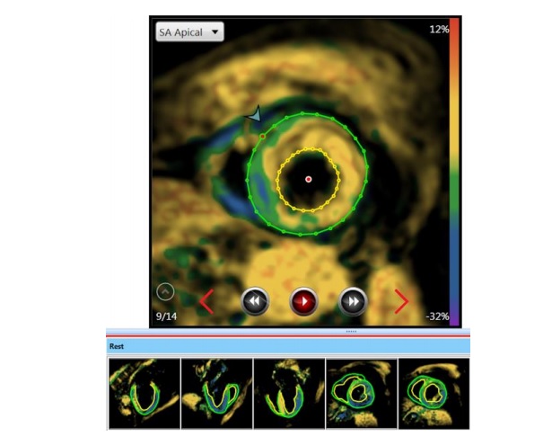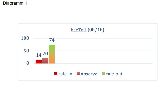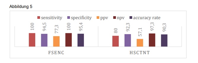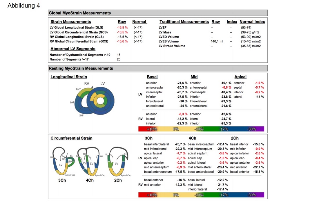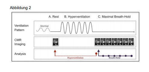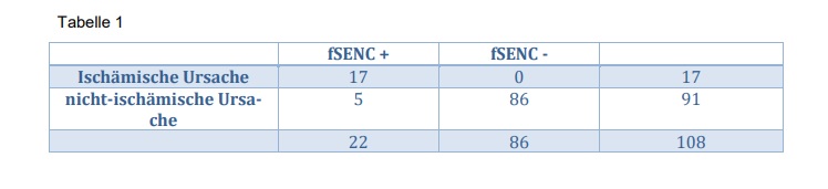 Herztage 2019: fSENC-MRT-Analyse der myokardialen Deformation bei Patienten mit akutem Thoraxschmerz25. Oktober 2019 Abbildung 1. Quelle: Wissenschaftliche Pressemitteilung der DGK, 10.10.2019 Bei den Herztagen 2019 stellte Deborah Siry vom Universitätsklinikum Heidelberg die fSENC-MRT-Analyse der myokardialen Deformation bei Patienten mit akutem Thoraxschmerz vor. Einleitung Gemäß Leitlinie beruht die Diagnose des akuten Koronarsyndroms (ACS) auf klinischer Symptomatik, EKG sowie der seriellen Bestimmung von Biomarkern wie dem hochsensitiven Troponin T (hsTnT). (Roffi et al., 2016) Laut aktueller Leitlinie ist es auch möglich, innerhalb einer Stunde ein Rule-In/-Out eines ACS zu treffen. (Reichlin et al., 2012) Allerdings können nach einer Stunde nicht alle Patienten sicher diagnostisch abgeklärt werden. 15 % werden der sogenannten „Observationszone“ zugeteilt und benötigen weitere diagnostische Tests. Davon handelt es sich bei einem Drittel letzten Endes um einen NSTEMI. (Nestelberger et al., 2016; Twerenbold et al., 2018) Mittels fSENC-MRT (fast Strain-Encoded Imaging) ist es möglich, den myokardialen Strain (fraktionelle Längenänderung der Myokardfibrillen zwischen Endsystole und Enddiastole) sehr genau zu erfassen. Es können sowohl regionale als auch der globale longitudinale und circumferentielle Strain (GLS/ GCS) gemessen werden. (Osman et al., 2001) Ein großer Vorteil von fSENC ist ihre schnelle Aufnahmezeit. Es ist möglich, innerhalb eines einzigen Herzschlags Aufnahmen des gesamten Herzzyklus zu generieren. Weiterhin werden keine Medikamente oder Kontrastmittel, keine längeren Atemanhaltemanöver und kein aufwändiges post-processing benötigt. (Pan et al., 2006) Bisher wurde fSENC noch nicht im akuten Setting getestet. Fragestellung Ziel dieser prospektiven Studie war die Evaluierung von fSENC bei Patienten mit akutem Thoraxschmerz, die sich in der CPU vorstellten bezüglich eines korrektes Rule-In/ -Out einer ischämischen Ursache. Es sollte hierbei eine Triage der Patienten durchgeführt werden. Dabei sollte entweder eine akute ischämische Ursache ausgeschlossen oder eine ischämische Ursache des Thoraxschmerzes identifiziert werden. Darüber hinaus sollten noch die Patienten identifiziert werden, die zwar kein Anhalt auf eine Ischämie zeigten, jedoch eine andere kardiale Pathologie aufwiesen (Abbildung 1). Weiterhin wurden innerhalb des Rule-In Kollektivs die betroffenen Koronararterien anhand von regionalen Wandbewegungsstörungen (Koronarterritorien) identifiziert. Eine zusätzliche Besonderheit dieser Studie war die Anwendung eines Hyperventilationsmanövers als nicht-invasivem Stress-Test. Es konnte bereits gezeigt werden, dass mittels dieses Atemmanövers eine stärkere Vasodilatation bzw. Oxygenierungszunahme erzielt werden kann als mit der intravenösen Gabe von Adenosin. Die Hyperventilation führt physiologisch zur Vasokonstriktion, während das Atemanhalten zu einer maximalen Vasodilatation führt. In stenosierten Arealen kommt es allerdings nicht zur Vasodilatation. Aufgrund des sogenannten „steal-Effekts“ über die anderen vasodilatierten Koronararterien kommt es sogar zu einer Abnahme der myokardialen Sauerstoffsättigung im stenosierten Koronarstromgebiet. (Fischer et al., 2016; Roubille et al., 2017) Somit wäre ein Ischämienachweis auch ohne Gabe von Medikamenten oder Kontrastmittel möglich. Die Kombination aus Atemmanöver und Strain-Imaging sollte hinsichtlich ihrer diagnostischen Aussagekraft untersucht werden. Methoden Diese und alle folgenden Abbildungen stammen aus der wissenschaftlichen Pressemitteilung der DGk vom 10.10.2019 Im Rahmen dieser Studie wurden Patienten, die sich in der Chest pain unit der Universitätsklinik Heidelberg mit Thoraxschmerz vorstellten und einen kontrollbedürftigen hsTnT-Wert (5-52 pg/ml) aufwiesen, rekrutiert. Das fSENC-MRT erfolgte vor der zweiten hscTnT-Messung. Das Protokoll beinhaltete die Analyse des GCS, GLS in Ruhe. (Abbildung 2) Abbildung 3 Zusätzlich dazu wurde eine dynamische Aufnahme bei Belastung mittels Atemmanöver nach folgendem Schema generiert: (Abbildung 3) Die Patienten wurden dazu aufgefordert, eine Minute lang zu hyperventilieren und daraufhin kurz die Luft anzuhalten. Während des Atemanhaltens wurden die Aufnahmen generiert. Die Rohbilder wurden in einem farblich kodierten Schema wiedergegeben, wobei blau normal kontrahierendes Myokard darstellt. Grün repräsentiert leicht reduzierte myokardiale Deformation und gelb stellt sogenannte „dysfunktionale Segmente“ dar (Strain > -10), also Segmente mit stark reduzierter myokardialer Deformation. (Abbildung 4 und 5) Ausschlaggebend für die Analyse war die visuelle Interpretation der fSENC Maps. Weiterhin erfolgte eine Quantifizierung der myokardialen Deformation anhand der GCS und GLS sowie der Anzahl dysfunktionaler Segmente. Ergebnisse 108 Patienten wurden in diese Studie eingeschlossen: 58 männlich und 50 weiblich (Alter: 57 ±17). Nach Abgleich mit dem Referenzstandard (serielle hsTnT-Messungen und ggf. Koronarangiographie-Befund) konnte die Ursache des Thoraxschmerzes bei 17 Patienten korrekt anhand von fSENC in Kombination mit der Hyperventilation als „ischämisch bedingt“ gewertet werden. Bei 86 Patienten wurde ein akutes ischämisches Geschehen mittels fSENC und Hyperventilation ausgeschlossen. Dies stimmte mit den Ergebnissen des Referenzstandards überein. Insgesamt sind fünf falsch-positive Ergebnisse zu vermerken. (Tabelle 1) Insbesondere innerhalb der „Observationszone“ brachte fSENC zusätzlich zu serieller hsTnT-Messung einen hohen Informationsgewinn. (Diagramm 1 und 2) 20 Patienten wurden mittels hsTnT nach 1h der „Observationszone“ zugeteilt. Bei 10 dieser Patienten wurde eine Koronarangiographie durchgeführt, die in sieben Fällen ein oder mehrere signifikante Koronarstenosen aufzeigte. Demzufolge wurden 13 Patienten, die initial der „Observationszone“ zugeteilt wurden, für ein ischämis