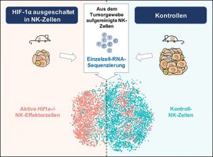 HIF-1α bremst Natürliche Killerzellen aus26. Mai 2020 Einzelzell-RNA-Sequenzierung zeigt ein erhöhtes Aktivitätspotenzial von Tumor-infiltrierten NK-Zellen, in denen HIF-1α ausgeschaltet ist. Jeder Punkt entspricht dem Transkriptionsprofil einer einzigen NK-Zelle. (Grafik: © Universitätsmedizin Mannheim) Die Krebsimmuntherapie nutzt das körpereigene Abwehrsystem, um Krebszellen zu vernichten. Im Fokus der Forschung steht dabei vor allem die erworbene, gezielte Immunabwehr, mit den Hauptakteuren T- und B-Lymphozyten, die spezifisch auf Antigene reagieren können. Zunehmend finden aber auch die Natürlichen Killerzellen (NK-Zellen), die zum angeborenen Immunsystem zählen, in der Bekämpfung von Tumoren Beachtung. Der Name der NK-Zellen ist Programm: Sie bilden eine unspezifische, schnelle und natürliche Abwehr gegen veränderte körpereigene Zellen und sind daher eine der ersten Verteidigungslinien im Kampf gegen Infektionen und Krebs. Leider verlieren NK-Zellen aber schnell ihre gegen den Tumor gerichtete Aktivität, sobald sie ins Tumorgewebe eingewandert sind. Wissenschaftlern der Medizinischen Fakultät Mannheim der Universität Heidelberg, unter der Leitung von Prof. Adelheid Cerwenka, und des Deutschen Krebsforschungszentrums, unter der Leitung von Prof. Thomas Höfer, ist es jetzt gelungen, ein Schlüsselmolekül zu identifizieren, das die Aktivität der Natürlichen Killerzellen bei der Tumorabwehr bremst. Diese Bremse zu lösen könnte eine vielversprechende Strategie sein, um NK-Zell-basierte Immuntherapien gegen solide Tumore zu verbessern. Hypoxie ist ein häufiges Merkmal solider Tumoren. Die Zellen reagieren auf den Sauerstoffmangel, indem sie den Hypoxie Induzierten Transkriptionsfaktor-1α (HIF-1α) hochregulieren. Durch das spezifische Ausschalten dieses Moleküls in NK-Zellen konnte die Aktivität der Killerzellen stark erhöht und die Tumore in ihrem Wachstum im Mausmodell verlangsamt werden. Einzelzell-RNA-Sequenzierung der in den Tumor eingewanderten NK-Zellen zeigte, dass in NK-Zellen ohne HIF-1α eine ganze Kaskade von gegen den Tumor wirksamen Faktoren ausgelöst wird. Die Hemmung von HIF-1α setzt offenbar eine gegen den Tumor gerichtete Aktivität der NK-Zellen frei, die für die Krebstherapie genutzt werden könnte. Cerwenka erforscht am „Mannheim Institute for Innate Immunoscience“ (MI3) der Medizinischen Fakultät Mannheim NK-Zell-basierte Therapien gegen Krebs. „Der Grund dafür, dass NK-Zellen rasch ihre Angriffslust verlieren, sobald sie in das Tumorgewebe eingewandert sind, ist der Sauerstoffmangel in soliden Tumoren. Wenn es uns gelingt, diesen Bremsmechanismus auszuhebeln, können die Killerzellen ihr volles Potenzial im Kampf gegen den Tumor entfalten.“ Aus dem Transkriptionsmuster einzelner NK Zellen erkannten die Wissenschaftler, dass ein Ausschalten von HIF-1α zu einer erhöhten Expression von Aktivierungsmarkern und Effektormolekülen und einer verstärkten Aktivierung des NF-κB Signalwegs führte. NF-κB ist ein wichtiger Transkriptionsfaktor, der die gegen den Tumor gerichteten Aktivität von Immunzellen maßgeblich steuert. Nicht nur kultivierte NK-Zellen der Maus, sondern auch solche des Menschen zeigten eine erhöhte, gegen den Tumor gerichtete Reaktivität, wenn HIF-1α ausgeschaltet oder gehemmt wurde. Darüber hinaus konnten die Wissenschaftler zeigen, dass diese Aktivität vom Vorhandensein von Interleukin 18, einem körpereigenen Regulator-Protein des Immunsystems, abhing. „Unsere Studie zeigt, dass der Transkriptionsfaktor HIF-1α als Immunkontrollpunkt fungiert, der die Natürlichen Killerzellen im Mikromilieu des Tumors hemmt. Auf diesen Ergebnissen aufbauend untersuchen wir nun in menschlichen NK-Zellen, ob wir die Ausschaltung von HIF-1α für eine therapeutische Anwendung nutzen können“, skizziert Dr. Ana Stojanovic, eine der Erstautorinnen der aktuell im renommierten Fachjournal Cell Immunity erschienen Arbeit, das weitere Vorgehen.