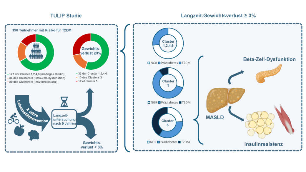 Hohes Diabetesrisiko trotz langfristigem Gewichtsverlust?28. April 2026 Symbolbild: Muhammed/stock.adobe.com Gesunde Ernährung, Abnehmen und mehr Bewegung können Typ-2-Diabetes wirksam vorbeugen. Allerdings profitieren nicht alle Menschen mit erhöhtem Diabetesrisiko in gleichem Maße von Lebensstilinterventionen, wie eine Tübinger Studie zeigt. Bereits vor einigen Jahren konnten Forschende des Deutschen Zentrums für Diabetesforschung (DZD) Menschen mit einem erhöhten Risiko für Typ-2-Diabetes sechs klar voneinander abgrenzbaren Risikogruppen zuordnen (Wagner et al., 2021). Diese unterscheiden sich hinsichtlich der Manifestation des Diabetes und der Entwicklung von Folgeerkrankungen deutlich. Dabei weisen die Cluster 3 und 5 ein besonders hohes Risiko für die Entwicklung eines Typ-2-Diabetes auf. In einer aktuellen Analyse untersuchten Forschende des Universitätsklinikums Tübingen, des DZD und von Helmholtz Munich nun, ob sich auch die Wirksamkeit der Diabetesprävention zwischen den Risikogruppen unterscheidet. Die Ergebnisse zeigen: Trotz eines über Jahre stabilen und deutlichen Gewichtsverlusts, weisen Personen des Risikoclusters 5 einen Anstieg der Blutzuckerwerte, den stärksten Rückgang der Insulinsekretion sowie weiterhin ein hohes Diabetesrisiko auf. Hohes Diabetesrisiko bleibt in Cluster 5 bestehen Grundlage der Studie waren Daten aus dem Tübinger Lebensstil-Interventionsprogramm (TULIP). Teilnehmende mit erhöhtem Typ-2-Diabetes-Risiko absolvierten eine zweijährige Lebensstilintervention und wurden anschließend über einen Zeitraum von etwa neun Jahren nachbeobachtet. „Wir waren besonders daran interessiert, ob sich Personen aus den Risikoclustern 3 und 5 im Vergleich zu den anderen Clustern hinsichtlich der Verbesserung der Blutzuckerwerte und der Prävention von Typ-2-Diabetes unterscheiden“, erläutert Prof. Norbert Stefan, Hauptautor der aktuellen Studie. Im Fokus der Auswertung standen Personen, die ihr Körpergewicht langfristig deutlich reduzieren konnten. So erzielten 60 Personen einen Gewichtsverlust von mehr als drei Prozent, die durchschnittliche Gewichtsreduktion lag sogar bei acht Prozent. Dennoch entwickelten 41 Prozent der Personen in Cluster 5 (n = 17) einen Typ-2-Diabetes. Im Vergleich dazu entwickelte keine der Personen aus den Clustern 1, 2, 4 und 6 (n = 33) und nur zehn Prozent aus Cluster 3 (n = 10) einen Typ-2-Diabetes. „Wir waren sehr überrascht festzustellen, dass trotz eines großen und anhaltenden Gewichtsverlusts […] bei Personen aus dem Risikocluster 5 die Blutzuckerwerte stiegen, die Insulinsekretion sank und sie ein hohes Risiko für Typ-2-Diabetes aufwiesen“, so Stefan. Fettleber und Insulinresistenz als Erklärung? Doch warum schützt eine Lebensstilintervention Menschen des Risikoclusters 5 weniger gut vor Diabetes? Die Autoren untersuchten die Mechanismen, die den negativen Verlauf bei Personen des Clusters 5 erklären könnten. Ihre Daten deuten darauf hin, dass eine Insulinresistenz bei Personen dieses Clusters zu einem Anstieg des Blutzuckerspiegels führte. Dabei ist die Insulinresistenz höchstwahrscheinlich durch eine ausgeprägte Fettleber bedingt, die eine Beeinträchtigung der Insulinsekretion aus den Betazellen verursacht. Diese Ergebnisse stimmen mit früheren Beobachtungen überein. Demnach sind Fettleber und Insulinresistenz die vorherschenden Pathomechanismen bei Personen des Tübinger Typ-2-Diabetes-Risikoclusters 5. Dadurch werden diese anfällig für Typ-2-Diabetes und Herz-Kreislauf-Erkrankungen. Bildquelle: Norbert Stefan, Created with BioRender.com Präzise Präventionsstrategien Die vorliegenden Ergebnisse deuten darauf hin, dass Menschen aus dem Risikocluster 5 trotz eines deutlichen und anhaltenden Gewichtsverlusts nicht im gleichen Umfang von einer Lebensstilintervention profitieren wie Personen aus anderen Clustern – insbesondere mit Blick auf den Glukosestoffwechsel. Bislang ist die Anzahl der untersuchten Patientinnen und Patienten allerdings noch überschaubar. Sollte sich dieses Ergebnis jedoch in einer prospektiven Studie bestätigen, brauche es einen maßgeschneiderten Ansatz zur Diabetesprävention, so die Forschenden. Hochrisikophänotypen wie Cluster 5 erforderten dann möglicherweise intensivere oder gezieltere Interventionen.