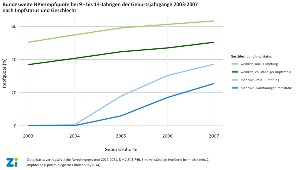 HPV-Impflücke schließt sich langsam25. Januar 2023 Verstärkte Aufklärung durch Ärztinnen und Ärzte über die HPV-Impfung zeigt allmählich Wirkung. Foto: terovesalainen – stock. adobe.com 50 Prozent der Mädchen und 25 Prozent der Jungen im Kinder- und Jugendalter bis 14 Jahren sind nach Angaben des Zentralinstituts für die kassenärztliche Versorgung (Zi) vollständig gegen Humane Papillomviren (HPV) geimpft. Die Ergebnisse einer aktuellen Auswertung der vertragsärztlichen Abrechnungsdaten für den Zeitraum 2012 bis 2021, die das Zi am 25.01.2023 veröffentlicht hat, lauten im Detail: Von den im Jahr 2007 Geborenen und 2021 14-Jährigen gesetzlich Versicherten sind 50,4 Prozent der Mädchen und 25,5 Prozent der Jungen vollständig gegen Humane Papillomviren (HPV) geimpft. 63,3 Prozent der Mädchen und 37,2 Prozent der Jungen haben mindestens eine Impfung erhalten. Zwischen den Bundesländern variiert die vollständige Impfquote der im Jahr 2007 geborenen 14-jährigen Mädchen zwischen 38,8 Prozent in Baden-Württemberg und 70,7 Prozent in Sachsen-Anhalt. In den Kreisen Jerichower Land, Börde und Frankfurt an der Oder sind mit 75,6 bis 77,8 Prozent die höchsten und in den Kreisen Schwäbisch Hall, Bad Tölz-Wolfratshausen und Offenbach mit 26,5 bis 27,4 Prozent die niedrigsten vollständigen Impfquoten dieser Personengruppe zu beobachten. In den letzten Jahren zeigen die Daten einen kontinuierlichen Anstieg der Impfquoten. In der Geburtskohorte 2003 lag die Impfquote von 14-Jährigen Mädchen 2017 noch bei 36,9 Prozent (vollständig geimpft) bzw. 50,4 Prozent (mindestens einmal geimpft). Bei Jungen ist, bedingt durch die spätere Impfempfehlung seit Juni 2018, erst für im Jahr 2005 Geborene, die 2019 14 Jahre alt wurden, eine substanzielle Impfquote zu beobachten. „Die HPV-Impfung bietet einen wichtigen Schutz vor späteren Krebserkrankungen nach entsprechenden Infektionen. Leider sind noch immer zu wenige Mädchen und Jungen gegen dieses Virus geimpft. Noch immer gehören HPV zu den Erregern, die in der breiten Bevölkerung eher unbekannt sind”, sagte der Zi-Vorstandsvorsitzende Dr. Dominik von Stillfried. “Erfreulicherweise zeigen die von uns aktuell analysierten Daten, dass die Impfquoten in den letzten Jahren stetig ansteigen. Dies ist auch ein Verdienst der Kinder-und Jugendärztinnen und -ärzte, die gemeinsam mit den Gynäkologinnen und Gynäkologen durch verstärkte medizinische Aufklärung dazu beigetragen haben, dass sich die Impflücke insbesondere bei den Mädchen langsam zu schließen beginnt. So erreicht bei 2004 geborenen Mädchen die Quote der mindestens zweifach Geimpften im Alter von 17 Jahren bereits 64,4 Prozent. Aufholbedarf besteht bei männlichen Jugendlichen: Für die 2004 geborenen Jungen liegt die Quote der mindestens zweifach Geimpften im Alter von 17 Jahren bei 23,3 Prozent.“ Jungen hinken hinterher HPV-Infektionen gehören zu den häufigsten sexuell übertragbaren Infektionen. Die meisten sexuell aktiven Menschen infizieren sich mindestens einmal im Leben mit HPV. Meistens heilen die Infektionen von alleine ab und sind nach ein bis zwei Jahren nicht mehr nachweisbar. Allerdings bleiben rund zehn Prozent der Infektionen bestehen. In diesen Fällen kann es im Laufe der Zeit zu Hautveränderungen und Krebsvorstufen bis hin zur Krebserkrankung kommen. Bei Frauen dominiert das Zervix-Karzinom (Gebärmutterhalskrebs), das zu nahezu 100 Prozent durch HPV verursacht wird. Insgesamt erkranken laut Krebsregisterdaten in Deutschland jedes Jahr etwa 6250 Frauen und ca. 1600 Männer an Krebs, der durch HPV-Infektionen bedingt ist. Außer am Gebärmutterhals kann der Krebs im Bereich der Vagina, der Vulva, des Penis, des Anus oder im Mund-Rachen-Bereich auftreten. „HPV-Impfstoffe schützen zu nahezu 100 Prozent vor einer Infektion mit den in den Impfstoffen enthaltenen HPV-Typen und können damit entscheidend zur Krebsprävention beitragen. Wenn die Impfung gegen diese Viren früh genug vorgenommen wird, baut der Organismus eine sehr wirkungsvolle, dauerhafte Immunabwehr auf“, bekräftigte der Zi-Vorstandsvorsitzende. Die Ständige Impfkommission empfiehlt die Impfung gegen HPV seit 2007 für Mädchen und seit Juni 2018 auch für Jungen. Die HPV-Impfung sollte idealerweise vor Aufnahme erster sexueller Kontakte vorgenommen werden. Die STIKO empfiehlt zwei Impfungen im Alter von 9 bis 14 Jahren. Ist die Impfung nicht bis zum Alter von 14 Jahren erfolgt, sollte diese noch bis zum Alter von 17 Jahren nachgeholt und um eine dritte Impfung ergänzt werden. Die Strategie zur Eliminierung von Zervix-Karzinomen der Weltgesundheitsorganisation (WHO) sieht eine HPV-Impfquote von 90 Prozent vor. (Zi/ms)