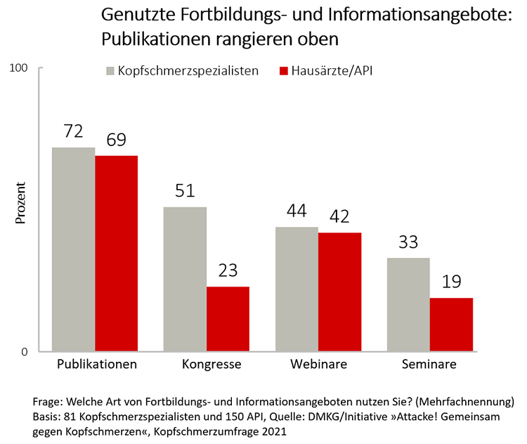 Indikation Kopfschmerz: Hausärzte wünschen sich besseres Fortbildungsangebot14. Mai 2021 Foto: © HNFOTO – stock.adobe.com Eine Umfrage der Deutschen Migräne- und Kopfschmerzgesellschaft (DMKG) unter Kopfschmerzspezialisten und Hausärzten zeigt, dass vor allem Hausärzte mit dem Fortbildungsangebot zu Kopfschmerzen unzufrieden sind. Zur Fortbildung bevorzugen beide Arztgruppen Publikationen und Webinare. Kongresse sind bei Spezialisten eine weitere häufig genannte Art der Fortbildung. Die Befragten wünschen sich jederzeit abrufbare digitale Fortbildungen und sind interessiert an Informationsmaterial für sich und für ihre Patienten. An diesem Bedarf setzt die DMKG-Initiative „Attacke! Gemeinsam gegen Kopfschmerzen“ mit ihrem Angebot an. Drei Viertel der Kopfschmerzspezialisten schätzen das Fortbildungsangebot rund um das Thema Kopfschmerz als gut bis sehr gut ein. Lediglich sieben Prozent sind eher unzufrieden. Unter Hausärzten ist dagegen nur ein Viertel mit den Fortbildungsmöglichkeiten zufrieden, ein weiteres Viertel gibt an, eher unzufrieden zu sein. Zufriedenheit von Kopfschmerzspezialisten und Hausärzten mit den Fortbildungsangeboten im Vergleich. Quelle: DMKG Von November 2020 bis Januar 2021 hat die Initiative „Attacke! Gemeinsam gegen Kopfschmerzen“ der DMKG mit zwei Online-Umfragen Hausärzte (n=150, 65% Allgemeinmedizin, 35% Innere Medizin) [1] und Kopfschmerzspezialisten (n=81) [2] zu Diagnose und Behandlung von Kopfschmerzpatienten befragt. Etwa die Hälfte der Befragten, die sich als Kopfschmerzspezialisten einstuften, waren Neurologen, die andere Hälfte Anästhesiologen, Psychiater und weitere Fachgruppen. Publikationen rangieren oben Befragt man die Ärzte, welche Fortbildungs- und Informationsangebote sie am häufigsten nutzen, geben ca. 70 Prozent an, vor allem Publikationen und Literatur zu verwenden. Während 51 Prozent der Spezialisten auch Kongresse und Tagungen zur Fortbildung nutzen, ist das in der Gruppe der API (Allgemeinarzt/Praktiker/Internist) lediglich knapp ein Viertel. Webinare werden von gut 40 Prozent sowohl der Spezialisten als auch der Hausärzte genutzt. Genutzte Fortbildungsangebote von Kopfschmerzspezialisten und Hausärzten im Vergleich. Quelle: DMKG Digitale zeitunabhängige Fortbildungen sowie Patientenmaterialien sind gefragt Beide Arztgruppen wünschen sich vor allem zeitunabhängige digitale Fortbildungsangebote. Hausärzte begrüßen zudem Patienteninformationsmaterial in Form von Broschüren und Aufklärungsbögen sowie Informationsbroschüren und interaktive Wissensplattformen für die eigene Nutzung. Thematisch stehen bei API die Differentialdiagnostik von Kopfschmerzarten sowie Migräne bzw. Migräneprophylaxe im Vordergrund. Bei Spezialisten sind es die Themen nicht-medikamentöse Therapien, Therapie-Updates, neue Therapieformen und seltene Kopfschmerzarten. Engagement für Ärzte mit Kopfschmerzpatienten „Als Fachgesellschaft unterstützen wir Ärzte und Therapeuten der unterschiedlichsten Fachrichtungen bei der Behandlung von Kopfschmerzpatienten. Ihre Bedürfnisse zu kennen, ist sehr wertvoll, um unsere Angebote passend auszurichten“, so Privatdozentin Dr. med. Stefanie Förderreuther, 1. Vizepräsidentin der DMKG. „Unsere Initiative hält ein fundiertes Informations- und Fortbildungsangebot für Fachkreise bereit.“ Von Professionals für Professionals: attacke-kopfschmerzen.de Auf den Webseiten der Initiative wird der Migräne- und Kopfschmerz-Guide (mk-Guide) zur Verfügung gestellt. Er ist eine Informations- und Fortbildungsplattform, die fundiertes, praxisrelevantes Wissen von Kopfschmerzspezialisten zusammenträgt, wie die DMKG angibt. „Durch seinen übersichtlichen und modularen Aufbau unterstützt der mk-Guide Behandler ganz gezielt bei akuten Fragen rund um das vielfältige Thema Kopfschmerz“, heißt es von der DMKG. Die Inhalte basieren auf den derzeit gültigen Standardwerken zur Behandlung von Migräne- und Kopfschmerzen (u.a. ICHD-3 und den offiziellen Leitlinien) und verweist auf wichtige Sekundärliteratur. Im Bereich „Service“ finden sich umfangreiche Materialien für die eigene Nutzung und zur Weitergabe an Patientinnen und Patienten, die dort kostenfrei zum Download bereitstehen oder bestellt werden können. Der „Fortbildungskalender“ gibt eine Übersicht über Fortbildungen und Kongresse zu Migräne und anderen Kopfschmerzerkrankungen, geprüft und zertifiziert von der DMKG. Daneben gibt es weitere Inhalte wie aktuelle Meldungen, einen „Schnelltest Kopfschmerzwissen“, Lehrvideos sowie ein Expertenverzeichnis. Quellen:[1] DMKG/Initiative »Attacke! Gemeinsam gegen Kopfschmerzen«: API-Kopfschmerzumfrage 2021,DocCheck Research Online-Befragung Dezember 2020[2] DMKG/Initiative »Attacke! Gemeinsam gegen Kopfschmerzen«:Kopfschmerzspezialistenumfrage 2021, Online-Befragung November 2020-Februar 2021