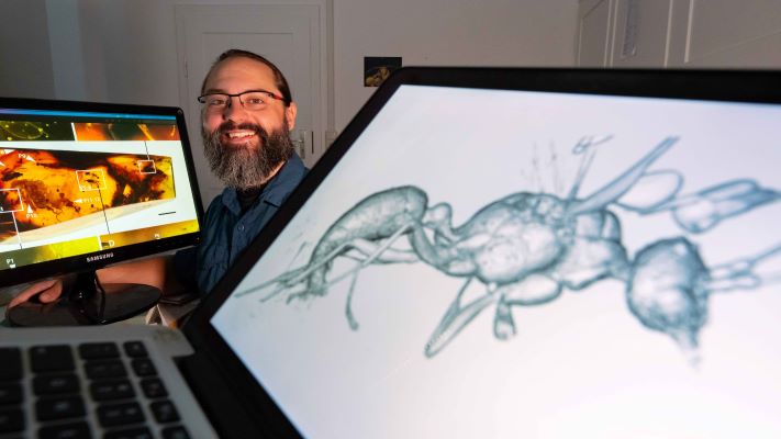 Internationales Forschungsteam entdeckt in einem Bernstein eine neue Ameisenart1. September 2022 Dreidimensionale Darstellung der bisher unbekannten ausgestorbenen Ameisenart. Grafik: © Hammel/Lauströer Ein Team von Wissenschaftlern der Friedrich-Schiller-Universität Jena, der Universität Rennes in Frankreich, der Universität Gdansk in Polen sowie des Helmholtz-Zentrums Hereon in Geesthacht hat eine bisher unbekannte ausgestorbene Ameisenart entdeckt. Das Team hatte mit der Röntgenlichtquelle PETRA III am Deutschen Elektronen-Synchrotron (DESY) in Hamburg die entscheidenden fossilen Überreste von 13 individuellen Tieren untersucht und erkannt, dass sie keiner bekannten Art zugerechnet werden können. Die neue Art und Gattung erhält den Namen †Desyopone hereon gen. et sp. nov. Damit honorieren die Wissenschaftler die beiden beteiligten Forschungseinrichtungen DESY und Hereon, die mit modernen Bildgebungsverfahren erheblich zum Fund beigetragen haben. Letztlich war die Identifizierung der neuen Art und Gattung nur durch die Kombination von umfangreichen Phänotypendaten aus Scans und neueren Erkenntnissen aus Genomanalysen lebender Ameisen möglich. Über seine Entdeckung berichtet das Team im Forschungsmagazin „Insects“. Durch erste anatomische Vergleiche gingen die Wissenschaftler davon aus, dass es sich bei den vorliegenden Tieren um eine Art der Aneuretinae handelt, einer nahezu ausgestorbenen Unterfamilie der Ameisen, die bisher nur durch Fossilien und durch eine lebende Art aus Sri Lanka bekannt ist. Doch dank der hochauflösenden, durch Synchrotron-Mikro-Computertomographie gewonnenen Bilder, mussten sie diese These revidieren: „Das komplexe Taillensegment und die großen aber rudimentären Mandibeln, die Mundwerkzeuge, sind uns eher von den Ponerinae – also den Urameisen – bekannt“, sagt Brendon Boudinot, der derzeit im Rahmen eines Humboldt-Forschungsstipendiums an der Universität Jena arbeitet. „Deshalb ordnen wir die neue Art und Gattung dieser Unterfamilie zu, auch wenn sie darin eine bisher einzigartige Gestalt aufweist, da die lange Taille und der ansonsten nicht eingeschnürte Hinterleib eher an die Aneuretinae erinnern.“ Die vorliegenden Forschungsergebnisse tragen darüber hinaus dazu bei, die Männchen der Ameisen stärker in den Fokus der Evolutionsforschung zu rücken. „Aufgrund ihrer so unterschiedlichen Körperform im Vergleich zu den Arbeiterinnen hat die Forschung sie lange Zeit vernachlässigt. Denn die fossilen Männchen werden schlicht zu oft übersehen, da sie nicht richtig zugeordnet werden können“, sagt der Ameisenexperte. „Unsere Ergebnisse aktualisieren nicht nur die Literatur zur Identifizierung männlicher Ameisen, sondern zeigen auch, dass wir durch das Verständnis männlich-spezifischer Merkmale, wie etwa der geschlechtsspezifischen Form des Unterkiefers, mehr über die evolutionären Muster weiblicher Ameisen erfahren können.“ Denn in der vorliegenden Arbeit haben die Forscher ein grundlegendes Muster erkannt, das bei allen Ameisen vorkommt, nämlich dass männliche und weibliche Mandibeln bei den meisten Arten demselben Entwicklungsmuster folgen, auch wenn sie sehr unterschiedlich aussehen. Bernstein stammt aus einzigem Bernsteinvorkommen in Afrika, das fossile Insekten aufweist Auch die Datierung des Fundes stellte die Wissenschaftler vor einige Herausforderungen, den der Bernstein selbst ist ebenso einzigartig wie sein Innenleben. „Das Stück stammt aus dem einzigen Bernsteinvorkommen in Afrika, das fossile Organismen in Einschlüssen aufweist. Überhaupt gibt es nur wenige fossile Insekten von diesem Kontinent. Zwar wird der Bernstein in der Region schon seit langem von Einheimischen als Schmuck verwendet, seine wissenschaftliche Bedeutung offenbart sich den Forschern aber erst seit etwa zehn Jahren“, erklärt Vincent Perrichot von der Universität Rennes. „Das Exemplar bietet deshalb den derzeit einmaligen Einblick in ein uraltes Waldökosystem in Afrika.“ Es stamme aus dem frühen Miozän und ist 16 bis 23 Millionen Jahre alt, so der Experte. Seine komplizierte Datierung sei nur indirekt durch die Altersbestimmung der fossilen, im Bernstein eingeschlossenen Palynomorphen – also der Sporen und Pollen – möglich gewesen. Forschungsergebnisse wie diese sind nur durch den Einsatz modernster Technik möglich. Da das Genmaterial von Fossilien nicht analysiert werden kann, sind genaue Daten und Beobachtungen zur Morphologie der Tiere besonders wichtig. Diese lassen sich umfassend durch hochauflösende Bildgebungsverfahren gewinnen – etwa durch die Mikro-Computertomographie (CT), bei der die Probe mit Röntgenstrahlen buchstäblich durchleuchtet wird. „Da die zu untersuchenden im Bernstein eingeschlossenen Ameisen sehr klein sind und bei der klassischen CT nur einen sehr schwachen Kontrast zeigen, haben wir die CT an unserer Messstation durchgeführt, die auf solche Mikro-Tomographie spezialisiert ist“, erklärt Jörg Hammel vom Helmholtz-Zentrum Hereon. „So erhielten die Forschenden einen Stapel von Bildern, die im Prinzip die untersuchte Probe scheibchenweise abbilden.“ Zusammengesetzt ergaben diese dann detaillierte dreidimensionale Abbildungen der inneren Struktur der Tiere, anhand derer sie die Anatomie genau nachvollziehen konnten. Nur so ließen sich die Details genau erkennen, die schließlich zur Bestimmung der neuen Art und Gattung führten. Dr. Brendon E. Boudinot von der Universität Jena. Im Vordergrund ist eine 3D-Darstellung der von ihm und seinem Team entdeckten neuen Ameisenart zu sehen. Auf dem Bildschirm im Hintergrund sieht man einen Millionen Jahre alten Bernstein mit Einschlüssen. Foto: Jens Meyer/Uni Jena