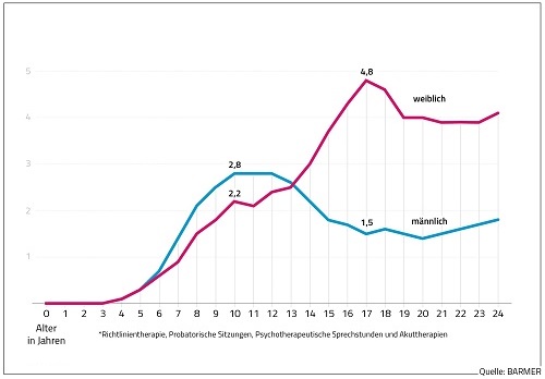 Junge Frauen dreimal häufiger in Therapie als Männer9. Juni 2021 Junge Frauen im Alter von 17 Jahren sind besonders häufig in psychotherapeutischer Behandlung. Dies ist das Ergebnis einer Analyse der Barmer unter Kindern, Jugendlichen und jungen Erwachsenen bis 24 Jahren. Im Jahr 2019 nahmen hochgerechnet rund 17.900 beziehungsweise 4,8 Prozent aller 17-jährigen Frauen eine klassische Psychotherapie in Anspruch. Damit ist ihr Anteil dreimal so hoch wie bei den gleichaltrigen männlichen Jugendlichen mit 1,5 Prozent oder hochgerechnet rund 6200 Betroffenen. „Depressionen sind der häufigste Grund für eine psychotherapeutische Behandlung. Dass vor allem junge Frauen davon betroffen sind, könnte daran liegen, dass das Auftreten von Depressionen eng mit dem Hormonhaushalt verknüpft ist, der sich in der Pubertät ändert. Darüber hinaus spielen auch gesellschaftliche Einflüsse wie ein zweifelhaftes Schönheitsideal und soziale Medien eine Rolle“, sagt Dr. Ursula Marschall, Leitende Medizinerin bei der Barmer. So seien junge Frauen vergleichsweise häufig wegen Essstörungen in Behandlung. Angststörungen und posttraumatische Belastungsstörungen seien ebenfalls zahlreich ausschlaggebend. Jungen vor allem zwischen zehn und zwölf Jahren in Therapie Während die jungen Frauen insbesondere ab dem Ende der Pubertät vermehrt in Behandlung seien, lägen die Jungen vor und zum Beginn der Pubertät noch vorn. Im Alter von zehn Jahren seien 2,8 Prozent oder circa 10.700 Jungen in Behandlung. Dem stünden 2,2 Prozent der Mädchen beziehungsweise rund 7800 Betroffene gegenüber. Anteil der Personen bis 24 Jahre in klassischer Psychotherapie nach Geschlecht und Alter im Jahr 2019 in Prozent (Quelle: Barmer) Besonders häufig seien Jungen wegen Störungen des Sozialverhaltens, ADHS sowie Lese- und Rechtschreibstörungen in Therapie. „Je früher psychische Störungen erkannt werden, desto eher kann man sie behandeln, bevor sie sich dauerhaft manifestieren“, so Marschall. Hilfe bei der Früherkennung bietet das Kinder- und Jugend-Programm der Krankenkasse. Es beinhalt unter anderem Vorsorgeuntersuchungen, die darauf abzielten, psychische Auffälligkeiten, gesundheitliche Defizite oder Entwicklungsstörungen junger Menschen möglichst frühzeitig zu erkennen und zu behandeln. Derzeit nehmen der Krankenkasse zufolge fast 580.000 Kinder und Jugendliche an dem Programm teil.