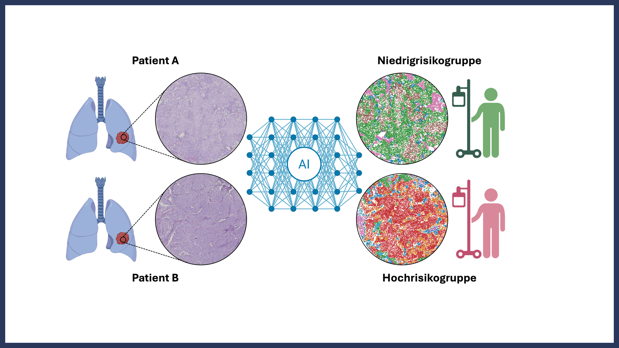 KI verbessert Lungenkrebsdiagnostik14. November 2025 Eosin-Färbung eines Plattenepithelkarzinoms, Bild: ©Charité/BIFOLD Ein interdisziplinäres Forschungsteam hat eine neuartige, KI-gestützte Methode entwickelt, um präzisere Prognosen für Lungenkrebspatienten treffen zu können. Die Studie wurde jetzt in „Nature Communications“ veröffentlicht. Beteiligt waren Wissenschaftler des BIFOLD (Berlin Institute for the Foundations of Learning and Data), der Technischen Universität Berlin, des Universitätsklinikums Köln, der Charité – Universitätsmedizin Berlin, des KI-Unternehmens Aignostics und der Ludwig-Maximilians-Universität München (LMU). Wahrscheinlichkeit für Rezidive abschätzen Grafik: ©Charité/BIFOLD Genauer gesagt hat das Team ein neues Verfahren entwickelt, um die Wahrscheinlichkeit für Rezidive bei Lungenkrebs besser abzuschätzen. Bisher ist dies anhand von Merkmalen wie Tumorgröße oder Lymphknotenbefall insbesondere in frühen Krankheitsstadien nur unzureichend möglich. Das Staging erfasst jedoch nicht die detaillierte Interaktion des Tumors mit den verschiedenen Zelltypen des Immunsystems und Bindegewebes in seiner Umgebung. In ihrer Arbeit kombinieren die Forschenden histologische Daten, Multiplex-Immunfluoreszenz-Bildgebung und multimodales maschinelles Lernen, um die komplexen zellulären Strukturen und Wechselwirkungen in der Tumorumgebung von 1168 Patienten aus zwei großen deutschen Krebszentren zu analysieren. 43 Zelltypen charakterisiert und zelluläre Nischen identifiziert Dabei konnten die Wissenschaftler 43 verschiedene Zelltypen und deren räumliche Beziehung im Tumormikromilieu charakterisieren und zelluläre Nischen identifizieren. Das sind kleine „Nachbarschaften“ von Zellen (Radius ca. 34 µm), in denen jeweils die Zusammensetzung der Zelltypen (Tumorzellen, T- und B-Lymphozyten, Makrophagen etc.) analysiert wurde. Durch die KI-gestützte Kombination dieser Muster mit etablierten klinischen Parametern gelang eine deutliche Verbesserung der Risikostratifizierung. „KI hilft uns, die räumliche Zellorganisation und die Bildung spezifischer Zellnischen im Tumor besser zu verstehen und dieses Wissen in klinisch relevante Entscheidungen zu übersetzen“, erläutert PD Dr. Simon Schallenberg, Pathologe an der Charité und einer der Erstautoren der Studie. Durch Nischenmuster mehr erfahren „Diese Nischenmuster liefern prognostisch relevante Informationen zusätzlich zum klassischen Staging. Wir konnten zeigen, dass die Zusammensetzung der Zellen im Tumorumfeld eng mit dem Überleben der Patientinnen und Patienten zusammenhängt, insbesondere bei frühen Lungenkrebsstadien“, erklärt Prof. Frederick Klauschen, Forschungsgruppenleiter am BIFOLD und Pathologe an der LMU München. „Viele dieser Betroffenen können allein durch eine Operation erfolgreich behandelt werden, aber nicht alle. Unsere Methode hilft nun, jene mit höherem Rückfallrisiko zu erkennen, die von einer ergänzenden Therapie profitieren könnten.“ Neue Einblicke, die mit konventionellen Verfahren nicht erreichbar wären „Unsere Ergebnisse zeigen, dass multimodale, erklärbare KI Einblicke in die klinische Relevanz biomedizinischer Daten ermöglichen kann, die mit konventionellen Verfahren nicht zu erreichen sind. Das Verfahren kombiniert KI-gestützte Bildanalyse mit KI-basierten Vorhersagemodellen, ist automatisiert und soll in prospektiven Studien weiter validiert werden“, erläutert Prof. Dr. Klaus-Robert Müller, BIFOLD/TU Berlin. Diese Forschung verdeutlicht, wie künstliche Intelligenz und moderne Bildgebung gemeinsam neuartige Einblicke in die Tumorbiologie ermöglichen – und damit die Grundlage für präzisere Diagnostik und personalisierte Therapie-Entscheidungen schaffen. (sf/BIERMANN)