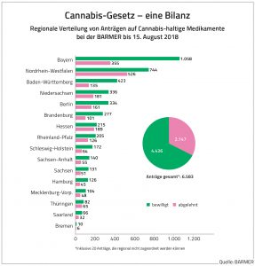 Krankenkasse: Nutzen von Cannabis häufig nicht erwiesen31. August 2018 Foto: © Elroi – Fotolia.com Bei der Krankenkasse Barmer sind seit Inkrafttreten des Cannabis-Gesetzes am 10. März vergangenen Jahres 6583 Anträge auf Kostenübernahme für Cannabis-haltige Arzneimittel eingegangen. Das geht aus einer Auswertung der Krankenversicherung hervor. Davon wurden 4436 Anträge genehmigt, 2147 abgelehnt. Angesichts der Fallzahlen warnt die Barmer aber vor übertriebenen Erwartungen. „Um Cannabis als Medizin ist ein Hype entstanden, der nur im Einzelfall berechtigt ist. Cannabis-haltige Arzneimittel dürfen nun bei vielen Erkrankungen verordnet werden, auch wenn deren Wirkung wissenschaftlich nicht hinlänglich erwiesen ist. Bei Schmerzen etwa sollte Cannabis möglichst nur als Ergänzung zu bewährten Konzepten wie der multimodalen Schmerztherapie zum Einsatz kommen“, sagte Dr. Ursula Marschall, leitende Medizinerin bei der Krankenkasse, mit Blick auf Analysen, wonach im Jahr 2017 mehr als die Hälfte der Cannabis-Verordnungen bei Schmerzen ausgestellt worden sei. Es liege kein klarer Nachweis vor, dass Cannabis bei Tumor-, Skelett- und Muskelschmerzen wirke. Anträge vor allem aus Bayern und NRW Die meisten Anträge auf Kostenübernahme von Cannabis-Präparaten wurden in Bayern (1413) und Nordrhein-Westfalen (1270) gestellt. Die zahlenmäßig geringste Nachfrage gab es in Thüringen, dem Saarland und Bremen mit 147, 98 beziehungsweise 16 Anträgen. Dabei schwankten die Bewilligungsquoten je nach Bundesland zwischen 53 und 76 Prozent. Regionale Verteilung von Anträgen auf Cannabis-haltige Medikamente bei der Barmer bis 15. August 2018 Cannabis-Blüten kaum dosierbar und unverhältnismäßig teuer Laut Auswertung betrugen die Gesamtkosten der Krankenkasse für Cannabis-Präparate rund acht Millionen Euro. Dabei gab es große Kostendifferenzen. Während etwa im Mai 2018 die Ausgaben für Fertigarzneimittel und Rezepturen im Schnitt zwischen 350 und 721 Euro je Cannabis-Patienten betrugen, beliefen sie sich bei Cannabis-Blüten auf 1708 Euro. „Cannabis-Blüten sind nicht nur unverhältnismäßig teuer, sondern in der Praxis auch kaum dosierbar, da es verschiedene Sorten, Stärken und Verabreichungsformen gibt. Blüten sollten nicht zum Einsatz kommen, zumal es alternative Cannabis-Präparate gibt“, sagte Marschall.