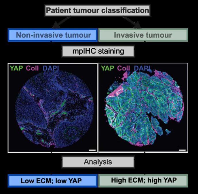 Larynxkarzinom: Musik für Krebszellen beeinfluss Aggressivität der Erkrankung10. April 2026 Tumorproben von Patientinnen und Patienten wurden in verschiedene Gruppen eingeteilt und mehrfach für unterschiedliche Proteinkombinationen angefärbt (mpIHC). Grün: YAP, markiert die Krebszellen; Blau: DAPI, färbt die Zellkerne; Rot: Kollagen (coll), zeigt das Bindegewebe (ECM) um die Krebszellen herum. Die Forschenden stellten fest, dass stärker invasive Tumoren höhere YAP-Werte und ein steiferes Bindegewebe (ECM) aufweisen. Abbildung: Turku Bioscience Centre Die Stimmbänder werden zunehmend unbeweglich, wenn sich ein Larynxkarzinom entwickelt. Die Wiederherstellung zellulärer Schwingungen reduziert die Aggressivität der fortgeschrittenen Erkrankung, wie eine aktuelle Studie zeigt. „Welche Musik sollten wir unseren Zellen vorspielen?“ – Diese Frage führte das Team um Jasmin Kaivola vom Turku Bioscience Centre der Universität Turku (Finnland) zu einer Studie zum Larynxkarzinom. Diese konnte auch eine bisher unbekannte Empfindlichkeit dieser Krebsart gegenüber einem derzeit in Entwicklung befindlichen zielgerichteten Medikament aufdecken. Die Studienergebnisse sind in „Nature Materials“ veröffentlicht. Das Larynxkarzinom gehört zu den häufigsten bösartigen Tumoren im Kopf-Hals-Bereich. Ein typisches, frühes Symptom ist Heiserkeit. Der Krebs tritt häufig in den Stimmbändern auf und deren Bewegung wird im Verlauf der Krankheit zunehmend eingeschränkt. Grund ist, dass das Gewebe der Stimmbänder verhärtet, der Krebs dringt in umliegendes Gewebe ein. Je steifer das Gewebe, desto bösartiger der Krebs Seit Langem ist bekannt, dass eine erhöhte Gewebesteifigkeit in unbeweglichen Geweben wie Brust-, Leber- und Bauchspeicheldrüsenkrebs die Bösartigkeit fördert. Der Grund: Die Zellen nehmen die physikalischen Eigenschaften ihrer Umgebung wahr und reagieren darauf. Diese Sensitivität gegenüber äußeren Kräften weckte das Interesse von Kaivola et al. am Larynxkarzinom, der sich ebenfalls in ständig bewegendem Gewebe entwickelt. „Wir haben uns gefragt, ob Bewegung Medizin sein könnte – und ob Gewebeverhärtung und Immobilisierung zur Krebsentwicklung beitragen“, sagt Akademieprofessorin Johanna Ivaska, Direktorin des „BarrierForce Centre of Excellence“ der finnischen Forschungsgesellschaft. „Gemeinsam mit der stellvertretenden Direktorin Professorin Sara Wickström und ihrem Team entwickelten wir ein Bioreaktor-System, in dem Zellen auf einer vibrierenden Membran über einem Lautsprecher kultiviert wurden,“ ergänzt die Korrespondenzautorin der Studie. Die Erstautorin Kaivola kam auf die Idee, ein altes Mobiltelefon an das Gerät anzuschließen, um Musik abzuspielen. Vibration beeinflusste Larynxkarzinom-Zellen Die Annahme der Forschenden bestätigte sich: Wenn Krebszellen Vibrationen ausgesetzt wurden, die die Bewegung der Stimmbänder nachahmten, nahm die Aggressivität der Erkrankung ab. Eine der beobachteten Veränderungen war eine Abnahme des „Yes-associated protein“ (YAP) in den Zellen. Das Team um Kaivola wertete Proben von rund 200 finnischen Patientinnen und Patienten mit Laryxnkarzinom in frühen und fortgeschrittenen Krankheitsstadien. Die Forschenden stellten fest, dass eine erhöhte Expression von Proteinen, die das Gewebe versteifen, die YAP-Aktivität verstärkte und mit einer höheren Mortalität verbunden war. In einem experimentellen Krebsmodell zeigte sich zudem, dass der Krebs empfindlich auf ein in Entwicklung befindliches gezieltes Medikament reagierte, das die YAP-Proteinaktivität hemmt. Wie Kaivola betont, sei die Studie völlig neuartig, weil die Biomechanik wachsender Tumoren bisher nicht in beweglichen Geweben untersucht wurde. Sie merkt an, dass es spannend wäre zu erforschen, ob der identifizierte Mechanismus auch in anderen Krebsarten von beweglichen Geweben – etwa Lungenkrebs – eine prognostische Rolle spielt. (ja/BIERMANN)