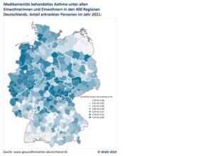 Leichter Rückgang der dokumentierten Asthmahäufigkeit in der COVID-19-Pandemie27. April 2023 Foto: © gustavofrazao/stock.adobe.com In Deutschland leben nach aktuellen Ergebnissen des Gesundheitsatlas des Wissenschaftlichen Institutes der AOK (WIdO) etwa 3,3 Millionen Menschen mit medikamentös behandeltem Asthma. Dies entspricht einem Anteil von 3,98 Prozent der Bevölkerung. Im Vorfeld des Welt-Asthma-Tages am 2. Mai macht die neue WIdO-Website auf eine Trendumkehr bei der Asthmahäufigkeit aufmerksam: Vor der COVID-19-Pandemie, im Jahr 2019, gab es noch 3,5 Millionen Asthmapatienten in Deutschland. Im Jahr 2021 hat sich diese Zahl um etwa 200.000 Patienten reduziert – ein Rückgang um 5,68 Prozent. „Ob dieser rückläufige Effekt möglicherweise auf den deutlichen Rückgang der Atemwegsinfektionen während der Pandemiejahre zurückzuführen ist, gilt es aufmerksam zu beobachten“, sagt Helmut Schröder, stellvertretender WIdO-Geschäftsführer. Besonders hohe Asthmaprävalenzen werden in Thüringen (4,55%) und Nordrhein-Westfalen (4,50%) erreicht, besonders niedrige in Mecklenburg-Vorpommern (3,25%) und Baden-Württemberg (3,52%). Neben Asthma werden auf der neuen Website www.gesundheitsatlas-deutschland.de systematisch die Häufigkeiten von insgesamt 23 Krankheiten bis auf die Ebene der 400 Kreise Deutschlands und im zeitlichen Verlauf dargestellt. Im neuen Webangebot werden Zeitreihen für die Jahre 2017 bis 2021 dargestellt. Beim medikamentös behandelten Asthma ist seit 2017 ein Anstieg bis zu einem Höchstwert von 4,27 Prozent im Jahr 2020 zu erkennen, gefolgt von einer Trendumkehr im Jahr 2021. 2021 lag der Anteil in der Bevölkerung bei 3,98 Prozent; dies entspricht 3,3 Millionen Menschen in Deutschland, die wegen Asthma medikamentös behandelt wurden. Im Jahr 2020 waren noch 3,6 Millionen Menschen betroffen, 237.000 Patienten mehr als im Jahr 2021. Trendumkehr bei Asthma geht mit Rückgang der Atemwegsinfekte einher Die Häufigkeit dieser Infektionskrankheiten war während der Pandemiejahre 2020 und 2021 deutlich reduziert. So könnte der Rückgang der Infektionen der unteren Atemwege während der Pandemiejahre dazu geführt haben, dass es in der Folge auch weniger Asthmaneuerkrankungen gab. Das könnte den leichten Rückgang der Prävalenz im Jahr 2021 erklären. Besonders deutlich ist der Rückgang bei Jungen bis 14 Jahren erkennbar: Wurden in dieser Altersgruppe im Jahr 2019 noch 5,25 Prozent wegen Asthma medikamentös behandelt, so reduzierte sich dieser Anteil im Jahr 2021 auf nur noch 2,72 Prozent. „Es bleibt abzuwarten, wie die weitere Entwicklung verlaufen wird – gerade angesichts der ab 2022 wieder häufiger auftretenden Atemwegserkrankungen“, sagt Schröder. Deutliche Unterschiede nach Alter und Geschlecht Die aktuelle Auswertung macht deutliche Geschlechterunterschiede transparent: Im Kindes- und Jugendalter ist die Asthmahäufigkeit bei Jungen deutlich höher als bei Mädchen, wohingegen im Erwachsenenalter Frauen deutlich häufiger betroffen sind als Männer. Der Prävalenzgipfel liegt bei 7,16 Prozent der Frauen in der Altersgruppe von 70 bis 74 Jahren. „Die stärkere Betroffenheit von Jungen hat vermutlich anatomische Gründe und lässt sich durch die engeren Bronchien erklären. So kommt es leichter zu einer Verengung der Atemwege, wie sie beim Asthma bronchiale vorliegt. Im Erwachsenenalter sind die Bronchiendurchmesser dann bei Männern größer als bei Frauen, was die Umkehrung der Geschlechterverhältnisse erklärt“, so Schröder. Weitere Gründe für die Geschlechtsunterschiede könnten aber auch hormonelle Einflüsse oder geschlechtsspezifische Unterschiede beim Kontakt mit Asthma-auslösenden Substanzen sein. Thüringen am stärksten betroffen Der Gesundheitsatlas stellt die Krankheitshäufigkeiten für die Bevölkerung in 400 Kreisen und kreisfreien Städten in Deutschland auf Basis eines eigens entwickelten Hochrechnungsverfahrens dar. Danach sind Potsdam mit 2,70 Prozent und Heidelberg mit 2,77 Prozent die Regionen mit dem geringsten Anteil an Asthmapatienten. Etwa doppelt so hoch ist die Krankheitshäufigkeit in den beiden am stärksten betroffenen Kreisen: die thüringischen Landkreise Sonneberg (6,90%) und Saalfeld-Rudolstadt (5,95%). In einem „fairen“ Vergleich hat das WIdO die Alters- und Geschlechtsunterschiede zwischen den Regionen berücksichtigt. In diesem Vergleich wird für Passau mit 2,78 Prozent der niedrigste Wert und für Sonneberg mit 6,52 Prozent der höchste Wert verzeichnet. „Zur Vermeidung von Neuerkrankungen und Verbesserung der Asthmasymptomatik sollten Landräte und Bürgermeister in den besonders stark betroffenen Regionen die verschiedenen Risikofaktoren in den Blick nehmen. Dazu zählen eingeatmete Stoffe, die die Lunge schädigen – insbesondere das Rauchen“, betont Schröder. Maßnahmen zur Förderung des Rauchverzichts seien daher eines der wichtigsten Elemente der Asthma-Prävention. Häufigkeit von medikamentös behandelten Asthma-Erkrankungen. (Grafik: © WIdO) Auf der Ebene der Bundesländer sind Thüringen (4,55%), Nordrhein-Westfalen (4,50%) und das Saarland (4,36%) laut Gesundheitsatlas besonders von Asthmaerkrankungen betroffen. Besonders niedrige Krankheitshäufigkeiten zeigen sich dagegen in Mecklenburg-Vorpommern (3,25%) und Baden-Württemberg (3,52%). Unter den Großstädten mit mehr als 500.000 Einwohnern hat Essen mit 4,81 Prozent den höchsten Anteil an Asthmapatienten, gefolgt von Dortmund (4,74%). Am unteren Ende der Liste steht Stuttgart mit einem Anteil von nur 3,55 Prozent. Zusammenhang zwischen Asthma und Adipositas Die Analysen des Gesundheitsatlas bestätigen nach Angaben des WIdO einen Zusammenhang, der bereits aus anderen Studien bekannt ist: In Regionen mit einem hohen Anteil an Menschen mit Adipositas ist auch die Zahl der Asthmaerkrankungen erhöht. So zeigt sich im Fünftel der deutschen Regionen mit dem höchsten Adipositasanteil eine Asthmahäufigkeit von 4,36 Prozen