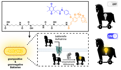 Lichtblick für die mikrobiologische Diagnostik16. Mai 2022 Elektronenmikroskopische Aufnahme von Staphylococcus aureus (MRSA), hier aus Medium. Foto: HZI/Manfred Rohde Forschende des HZI entwickeln molekulare Sonden zum Nachweis von Krankheitserregern wie Enterococcus faecium, Staphylococcus aureus, Klebsiella pneumoniae, Acinetobacter baumanniin oder Pseudomonas aeruginosa in klinischen Proben. Der diagnostische Nachweis von bakteriellen Krankheitserregern in klinischen Proben ist eine wichtige Voraussetzung für die erfolgreiche antimikrobielle Behandlung. Ein Team des Helmholtz-Zentrums für Infektionsforschung (HZI) in Braunschweig, des Deutschen Zentrums für Infektionsforschung (DZIF) und der Tel Aviv University, Israel, hat nun molekulare Sonden entwickelt, die verschiedene Bakterienspezies hochsensitiv nachweisen können. Bakterielle Zellen aktivieren die Sonden und bringen sie zum Leuchten. Dieses Signal ermöglicht den Erregernachweis direkt in klinischen Proben. Die Ergebnisse wurden in der Fachzeitschrift Angewandte Chemie veröffentlicht.In Anbetracht der steigenden Gefahr durch Antibiotikaresistenzen sollten Erkrankungen nicht auf Verdacht mit Antibiotika behandelt werden. Zum verantwortungsvollen Einsatz von Antibiotika gehört daher der vorhergehende Nachweis, dass tatsächlich eine bakterielle Infektion vorliegt. Mikrobiologische Methoden, bei denen die Erreger auf Nährmedien angezüchtet werden, nehmen jedoch viel Zeit in Anspruch und gelingen oft nicht, wenn Patientinnen und Patienten beispielsweise bereits mit Antibiotika behandelt wurden. Daher ist eine verbesserte Diagnostik ein wichtiges Element im Kampf gegen Antibiotikaresistenzen.Dazu will ein Forschungsteam unter der Leitung von Prof. Mark Brönstrup vom Helmholtz-Zentrum für Infektionsforschung (HZI) nun mit neuartigen Sonden beitragen. Die Forschendenmachen sich eine Molekülklasse zu eigen, mit der Bakterien eisenhaltige Verbindungen aufnehmen – die Siderophore. „Eisen ist im Körper ein knappes Gut. Daher nehmen Bakterien auch Siderophore auf, die chemisch nicht genau denen entsprechen, die sie selber herstellen“, sagt Carsten Peukert, Doktorand in der Abteilung „Chemische Biologie“ am HZI und Erstautor der Studie. „Das prädestiniert Siderophore für den Einsatz als molekulare trojanische Pferde.“ Chemische Struktur und Funktion der molekularen Sonden: Ein Siderophor (schwarz) ist verantwortlich für den Transport in Bakterien. Dort werden die Sonden enzymatisch gespalten (blau) und das Dioxetan (gelb) gibt ein Lichtsignal ab. Bild: ©HZI/Carsten Peukert An die Siderophore koppelten die Forscherenden ein Molekül der Gruppe Dioxetane. Mit Dioxetanen verwandte Moleküle sind auch in Glühwürmchen für das charakteristische Leuchten verantwortlich. Eine externe Lichtquelle ist dafür nicht notwendig. Damit die Sonden jedoch nur spezifisch in Bakterien leuchten, integrierten das Forscherteam einen molekularen Lichtschalter. Dieser wird betätigt, wenn Bakterien die Sonden in ihrem Zellinneren enzymatisch spalten.Das Forschungsteam kann mit seiner Sonde alle ESKAPE-Pathogene nachweisen. Der Begriff fasst die Erreger Enterococcus faecium, Staphylococcus aureus, Klebsiella pneumoniae, Acinetobacter baumannii, Pseudomonas aeruginosa und Enterobacter-Spezies zusammen. Diese Erreger gelten als typische Vertreter der Krankenhauskeime und sind besonders häufig resistent gegen Antibiotika. „Besonders gramnegative Bakterien wie Pseudomonaden oder Klebsiellen, die über zwei Zellmembranen verfügen, konnten bisher mit den Vorläufern unserer Sonden nicht zuverlässig markiert werden. Wir haben das System nun so weiterentwickelt, dass auch diese Gruppe nachweisbar ist“, sagt Studienleiter Mark Brönstrup, Leiter der Abteilung „Chemische Biologie“ am HZI und Wissenschaftler am DZIF im Forschungsbereich „Neue Antibiotika“. Die Sonden können auch Bakterien nachweisen, die sich innerhalb von Wirtszellen vermehren. Die technischen Anforderungen zum Nachweis der Sonden in klinischen Proben wie Blutplasma sind vergleichsweise niedrig. Daher könnte das System zukünftig auch abseits spezialisierter Labore zum Einsatz kommen.Andere molekulare Diagnostikmethoden wie die Massenspektrometrie oder die Polymerasekettenreaktion unterscheiden nicht zwischen toten und lebenden bakteriellen Zellen. „Unsere Methode bietet den Vorteil, dass nur lebende Bakterien nachgewiesen werden. Wenn die Sonden aufleuchten, liegt also eine aktive Infektion vor“, sagt Brönstrup. Neben dem Einsatz in klinischen Proben sei auch der Einsatz in der Lebensmittelhygiene denkbar. Zudem könne das Siderophor-basierte System auch angepasst werden und anstatt der leuchtenden Sonden etwa antimikrobielle Wirkstoffe einschleusen. Der Lichtblick in der Diagnostik soll also nur der Anfang der Anwendungen für die molekularen trojanischen Pferde der HZI-Forscherinnen und -Forscher sein.Die Studie wurde mit Mitteln der Deutschen Forschungsgemeinschaft, der Joint Programming Initiative on Antimicrobial Resistance und dem Fonds der Chemischen Industrie gefördert.